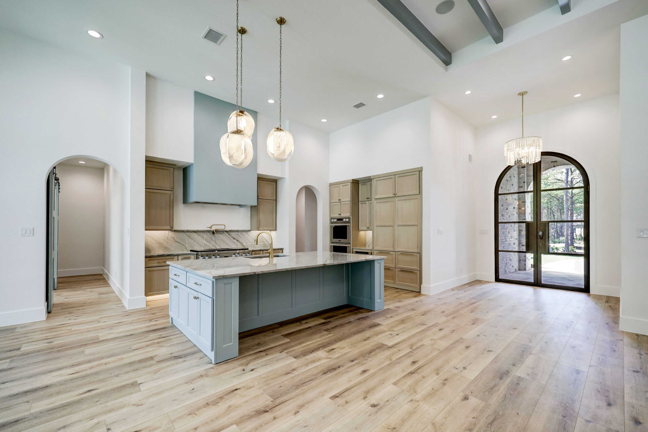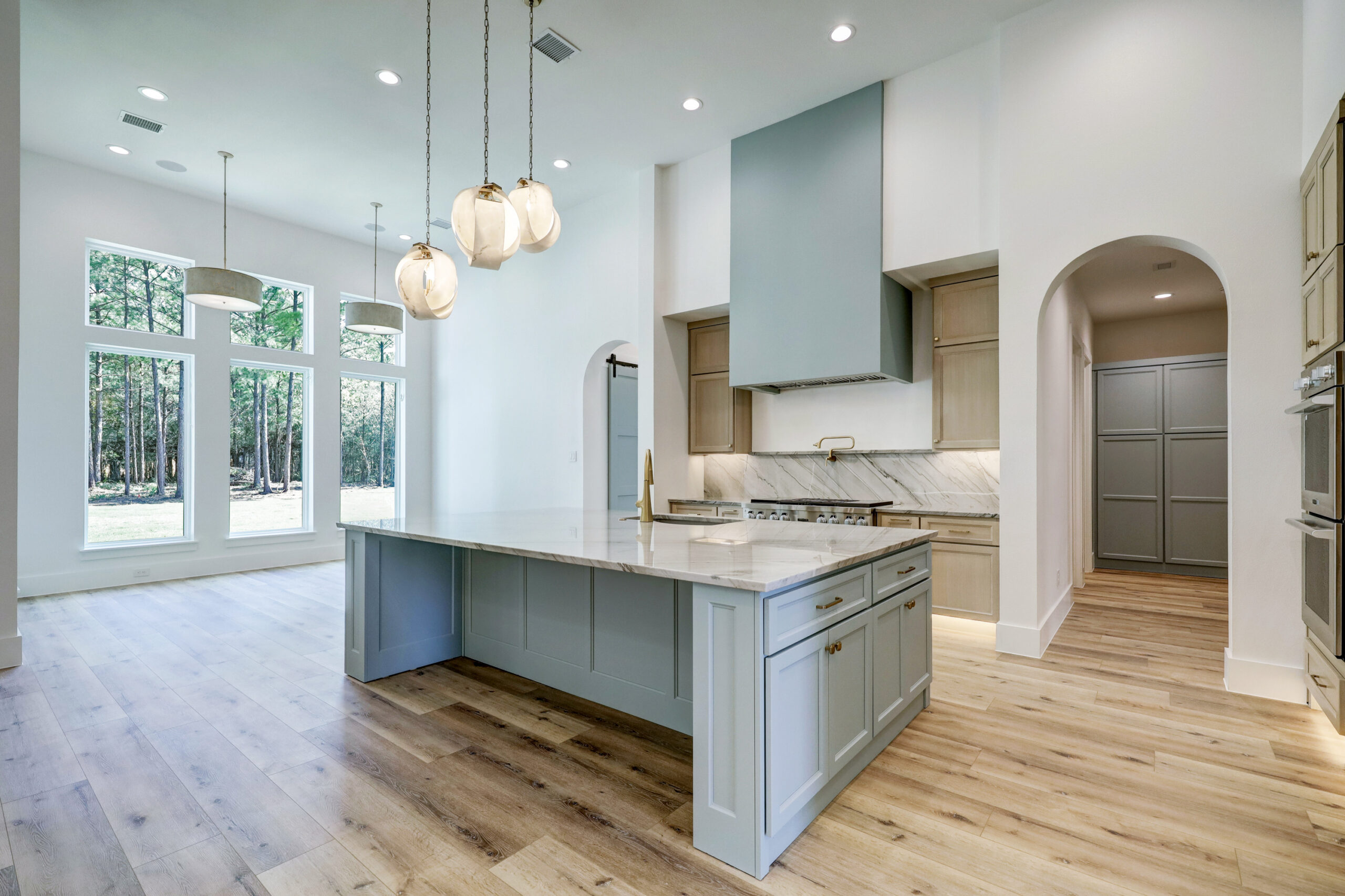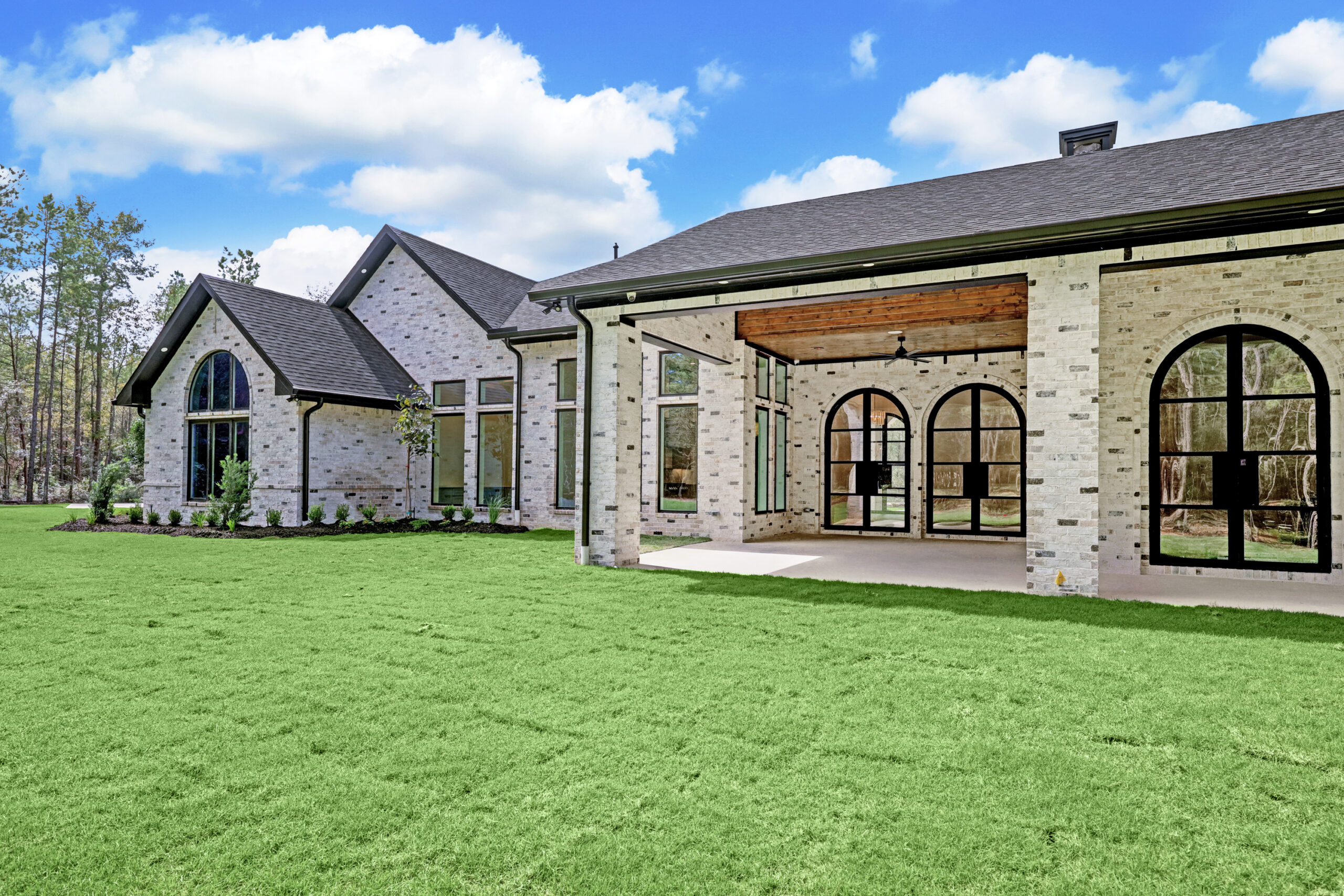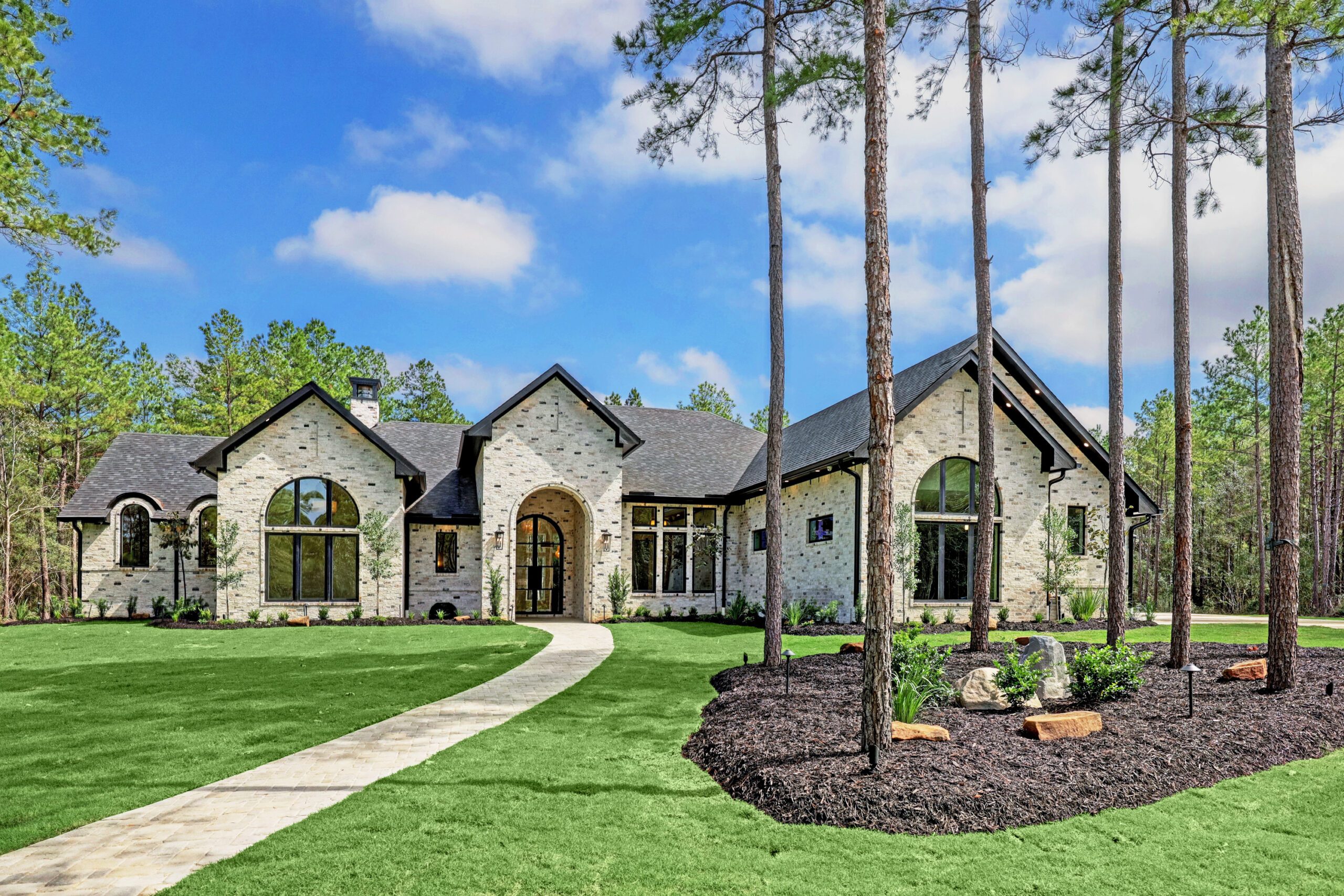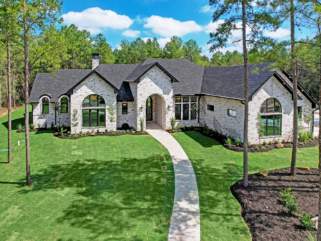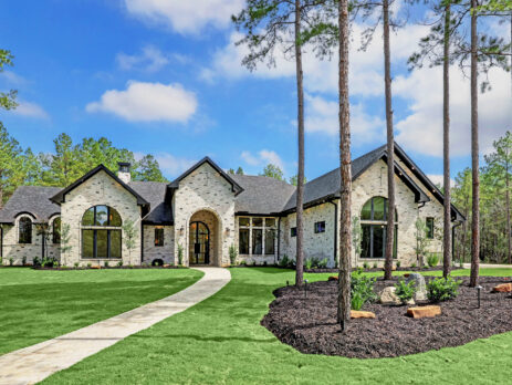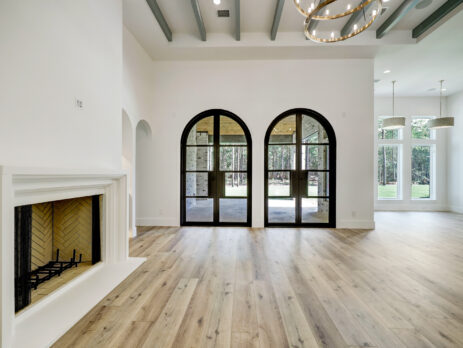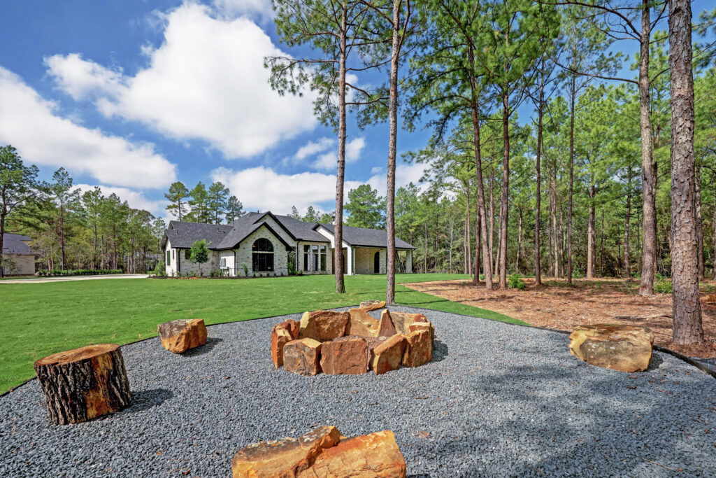This transitional home blends traditional architecture with a refined, detail-driven design. Arched windows and doors create a consistent architectural feel, while quartzite countertops and a butler pantry elevate the kitchen. Thoughtful spaces—including large laundry, dog wash, and game room—support everyday living. The primary suite offers a calming, spa-like retreat, while outdoor living and a firepit extend the home into its natural surroundings.