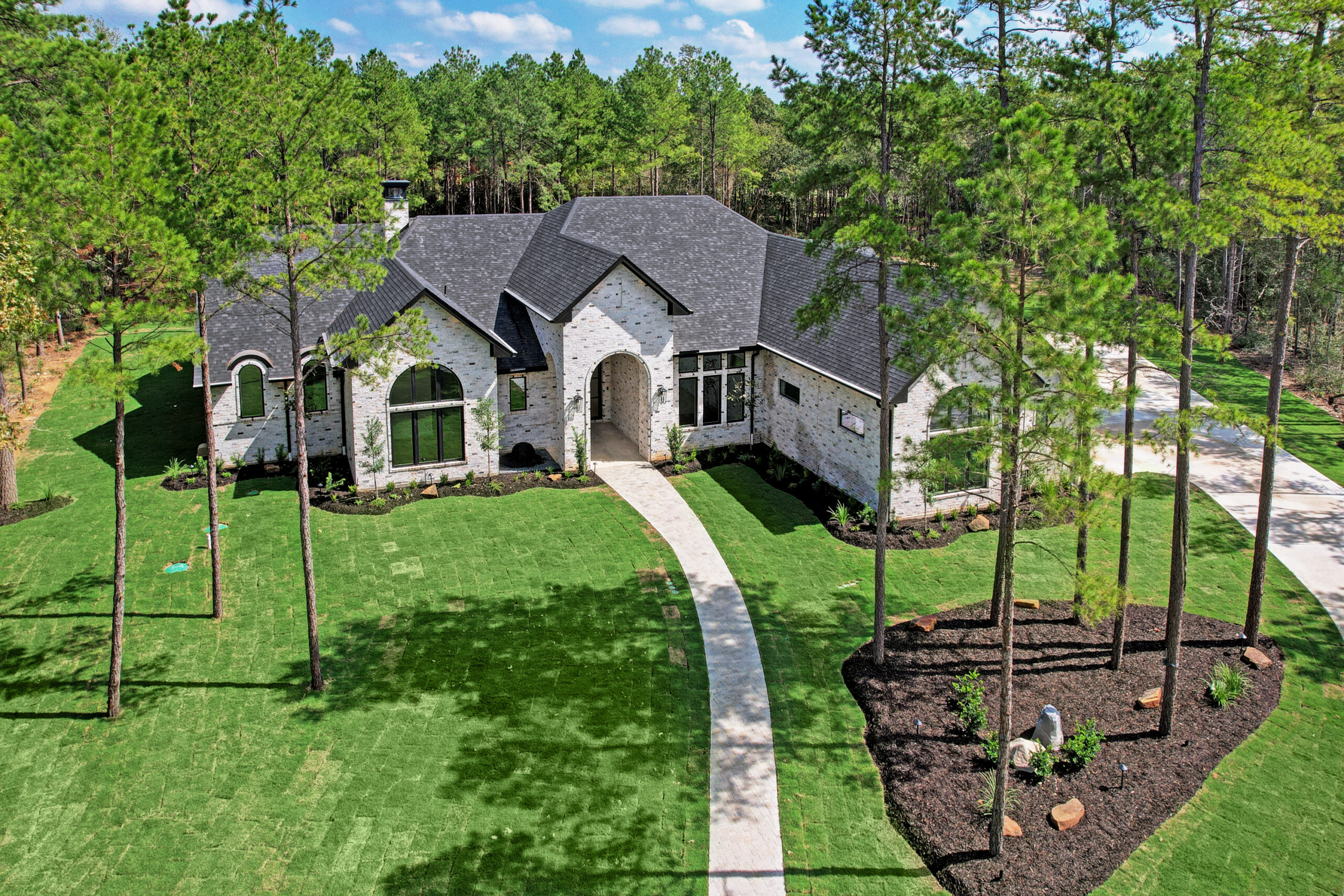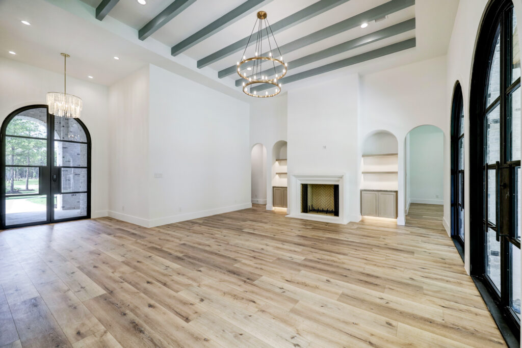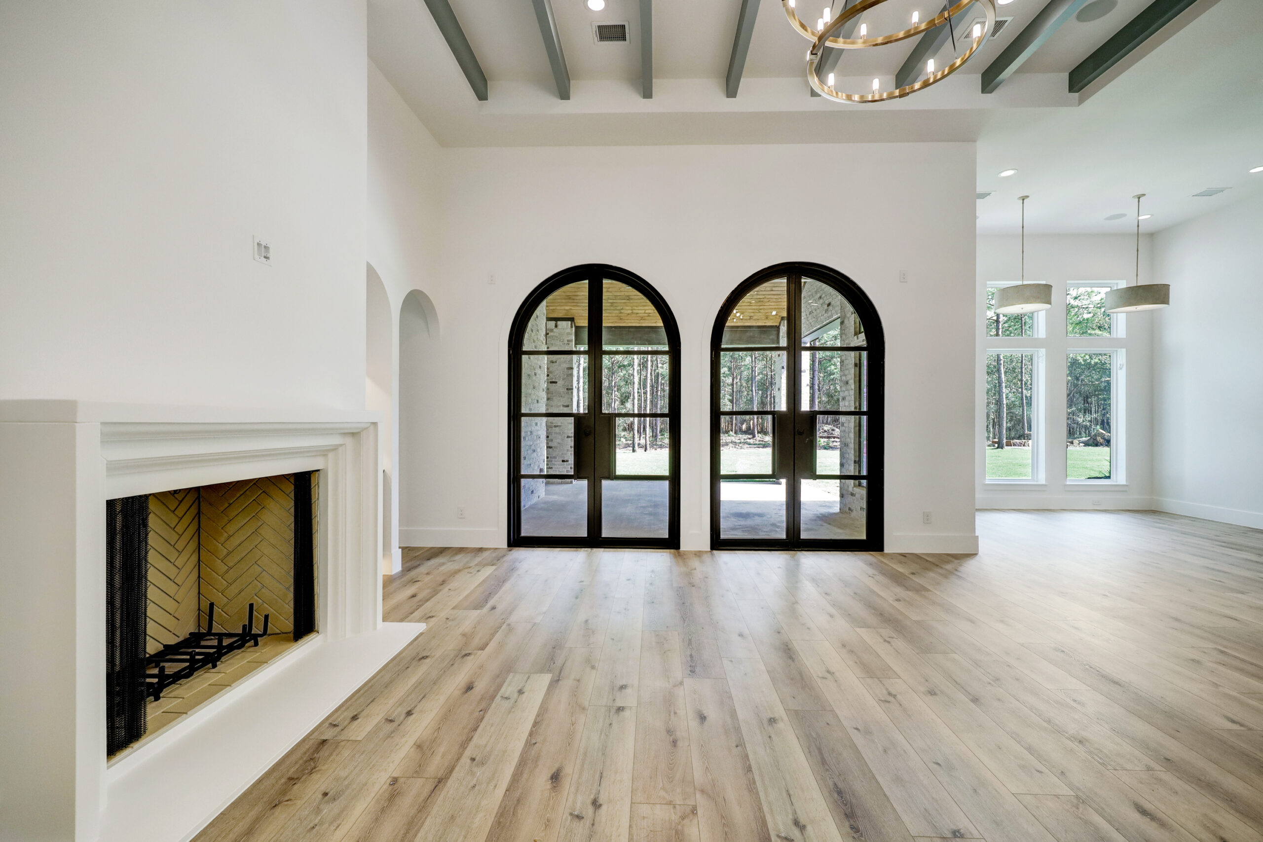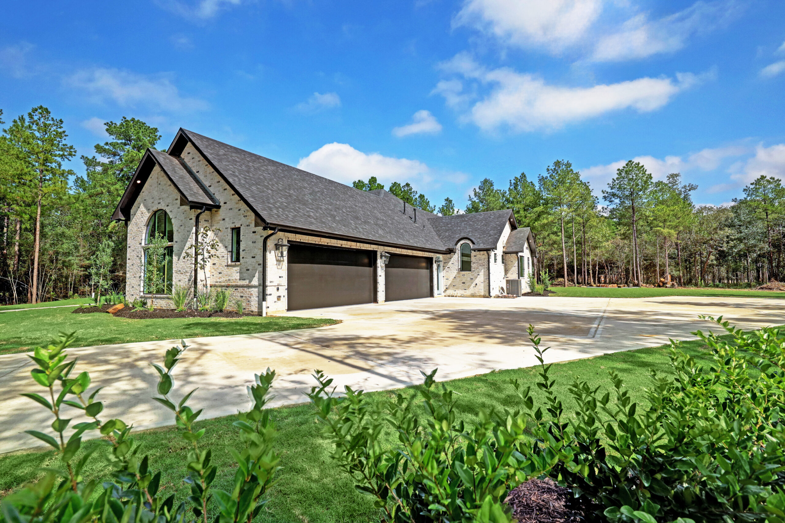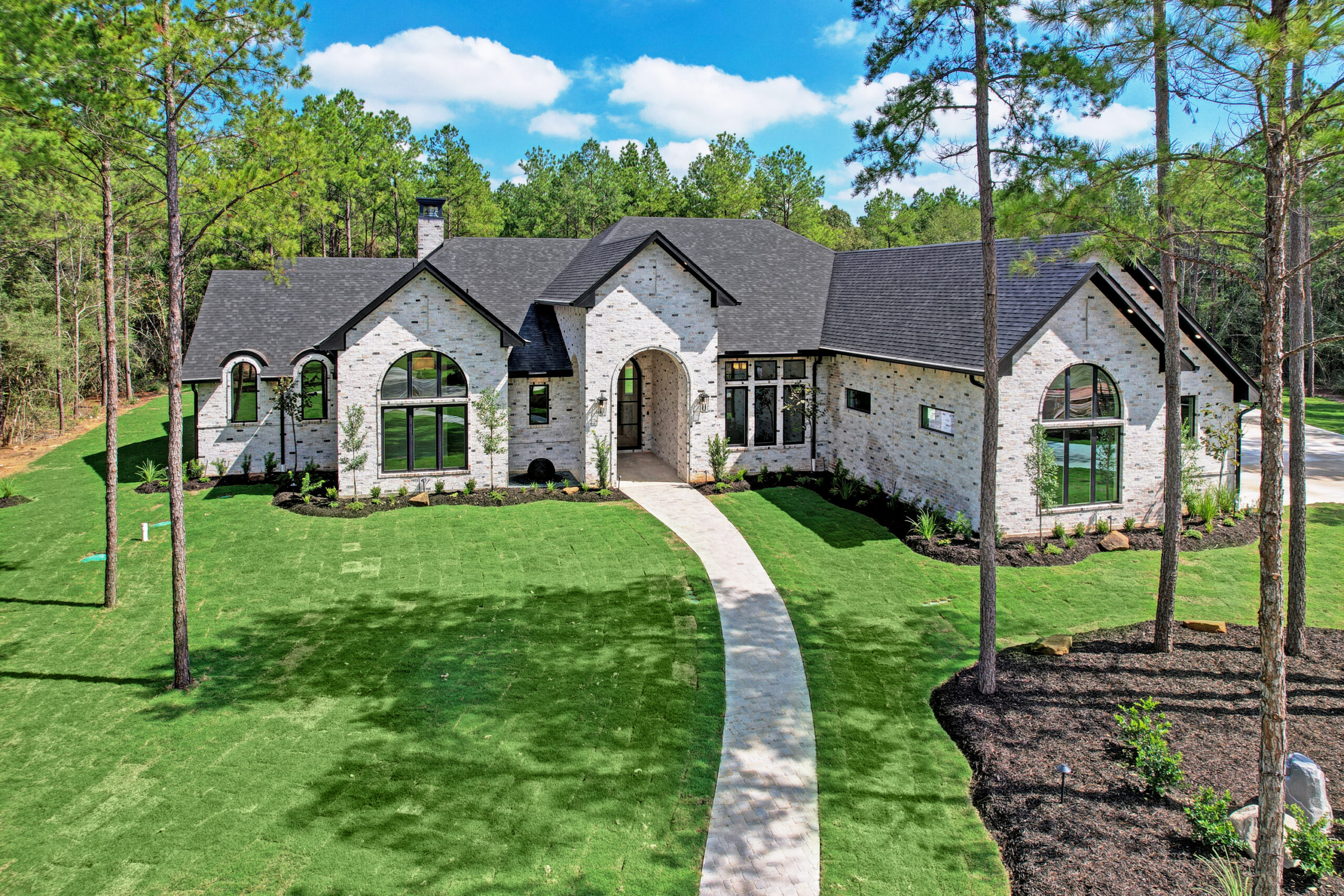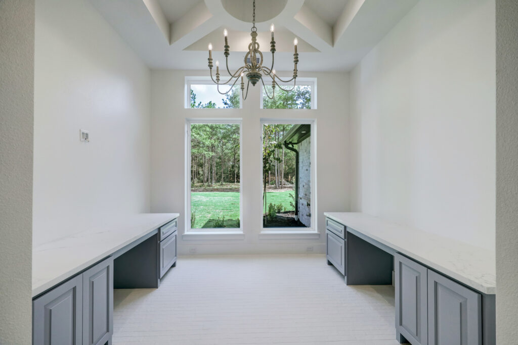 This transitional home blends traditional architecture with a refined, detail-driven design. Arched windows and doors create a consistent architectural feel, while quartzite countertops and a butler pantry elevate the kitchen. Thoughtful spaces—including large laundry, dog wash, and game room—support everyday living. The primary suite offers a calming, spa-like retreat, while outdoor living and a firepit extend the home into its natural surroundings.