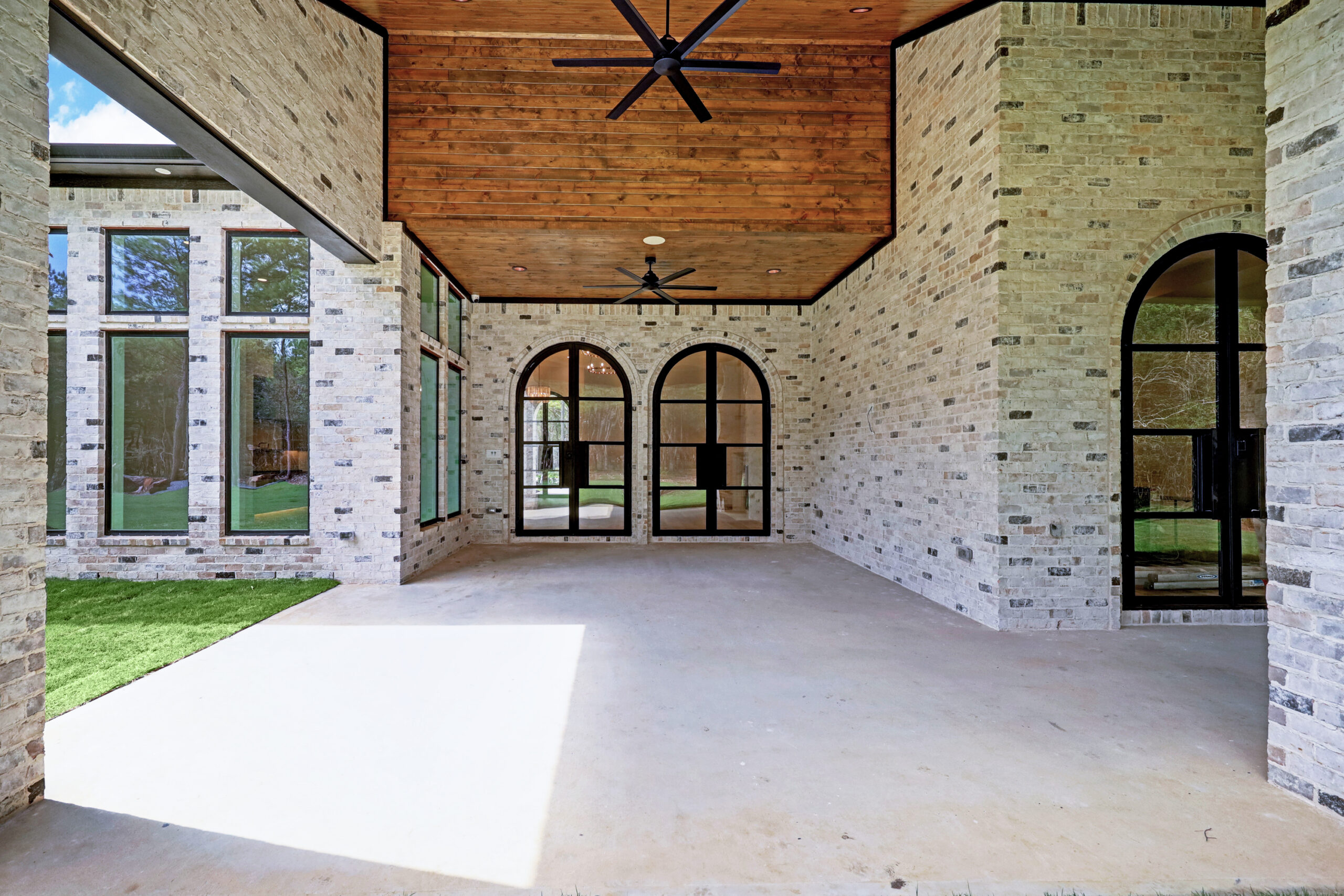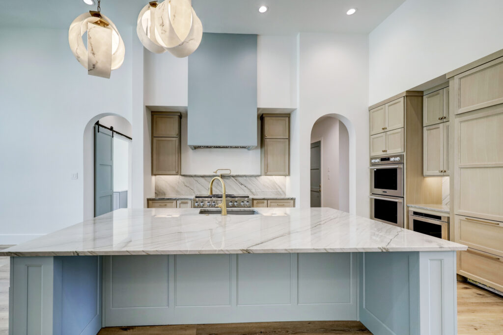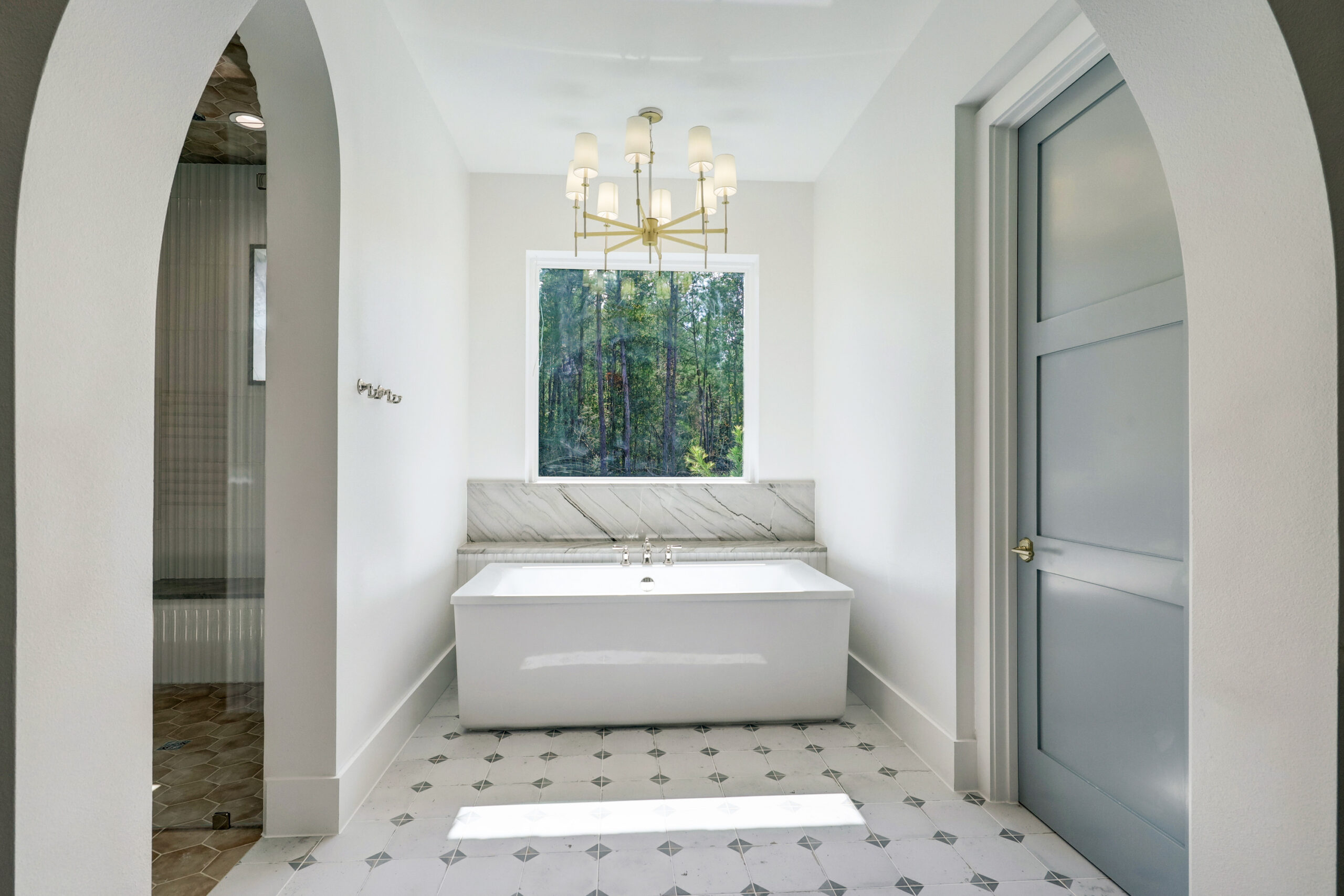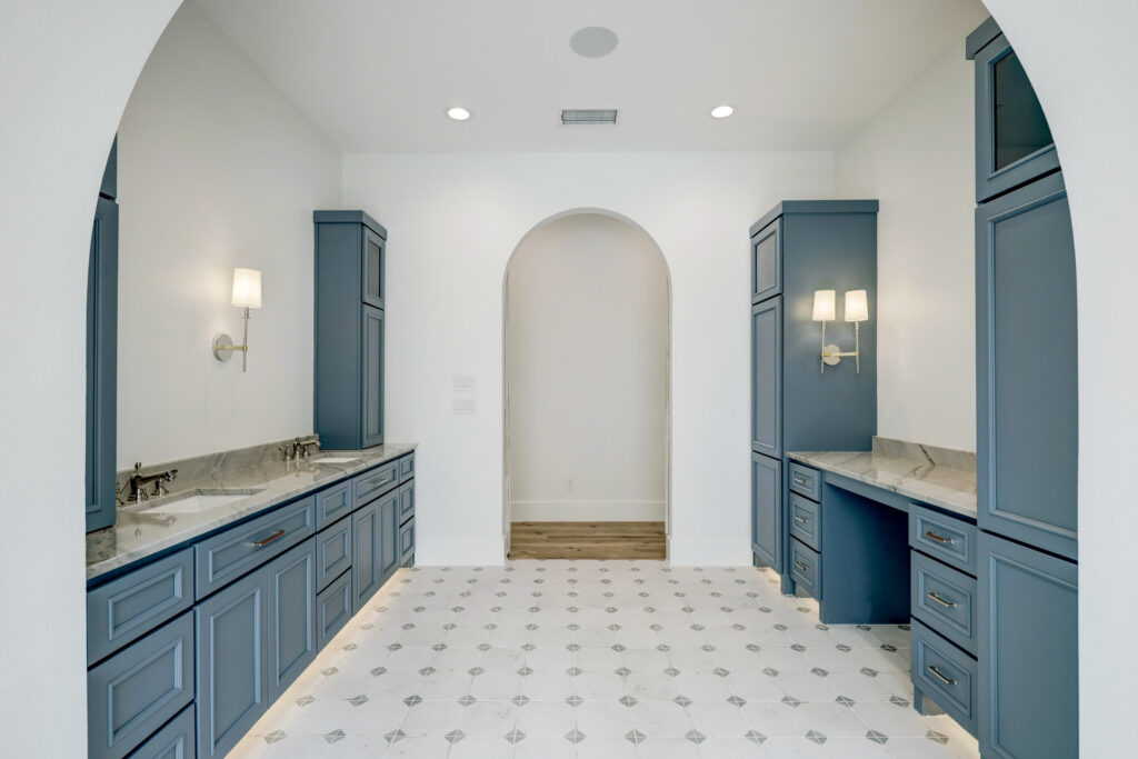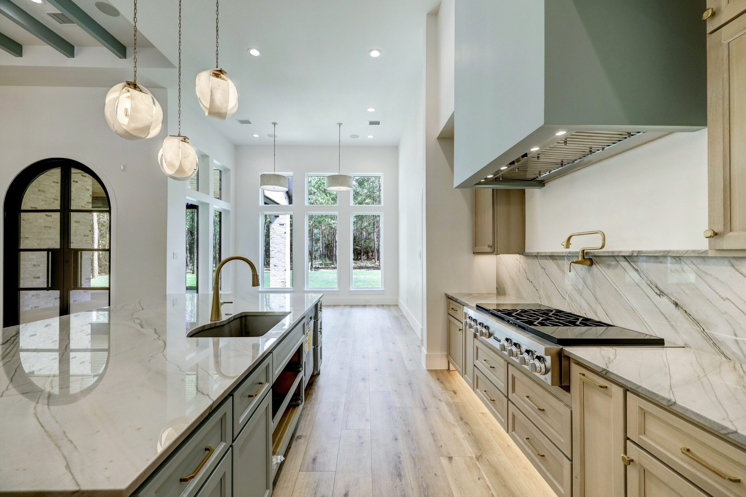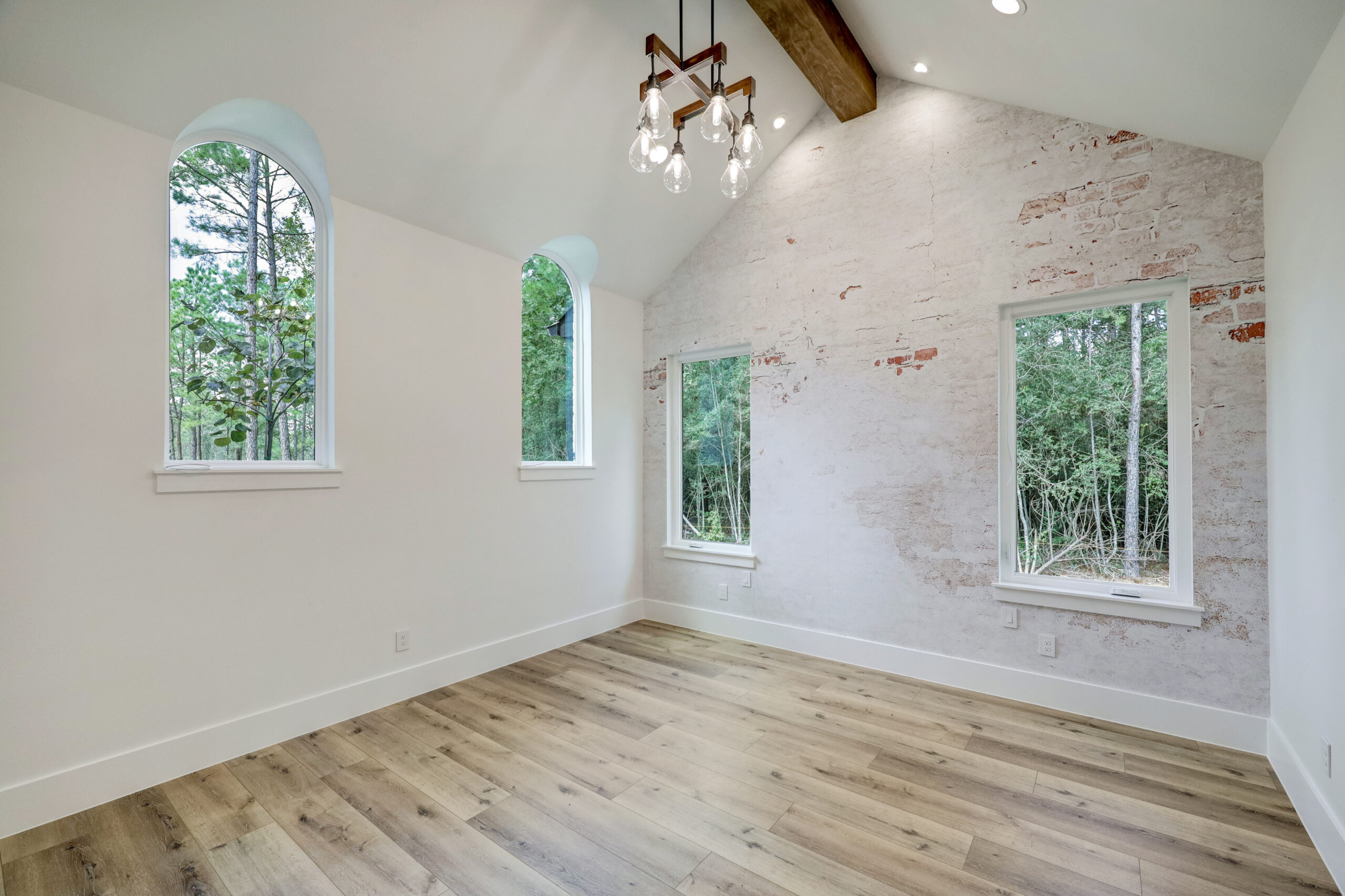 This transitional home blends traditional architecture with a refined, detail-driven design. Arched windows and doors create a consistent architectural feel, while quartzite countertops and a butler pantry elevate the kitchen. Thoughtful spaces—including large laundry, dog wash, and game room—support everyday living. The primary suite offers a calming, spa-like retreat, while outdoor living and a firepit extend the home into its natural surroundings.