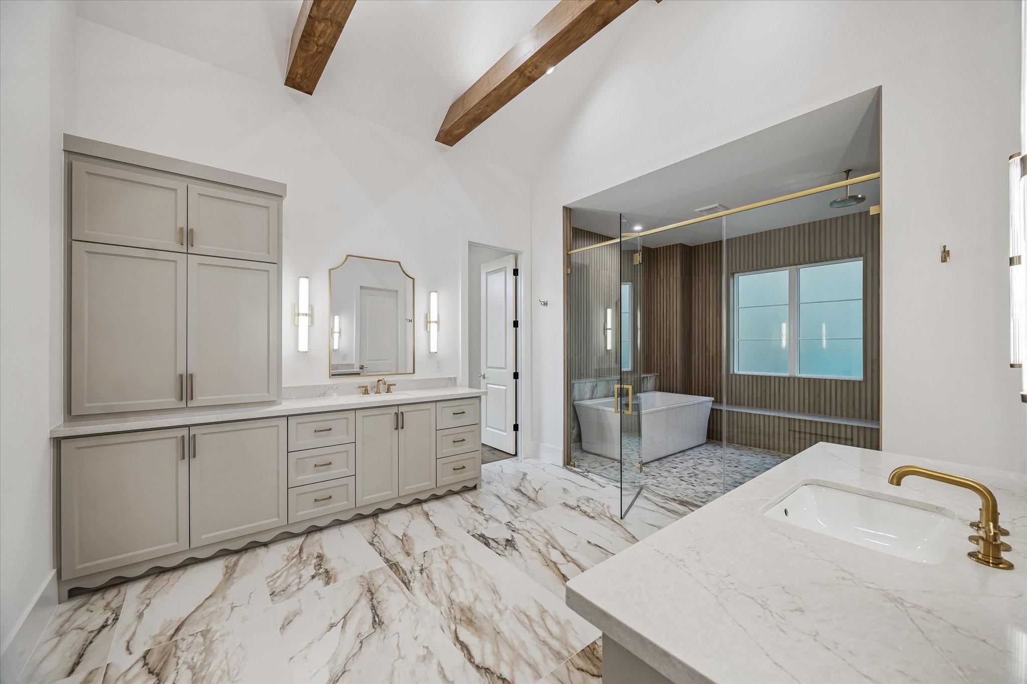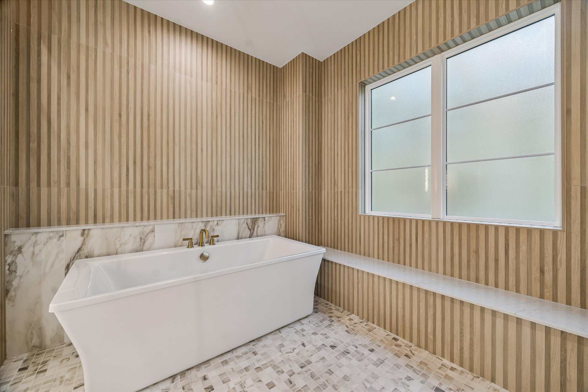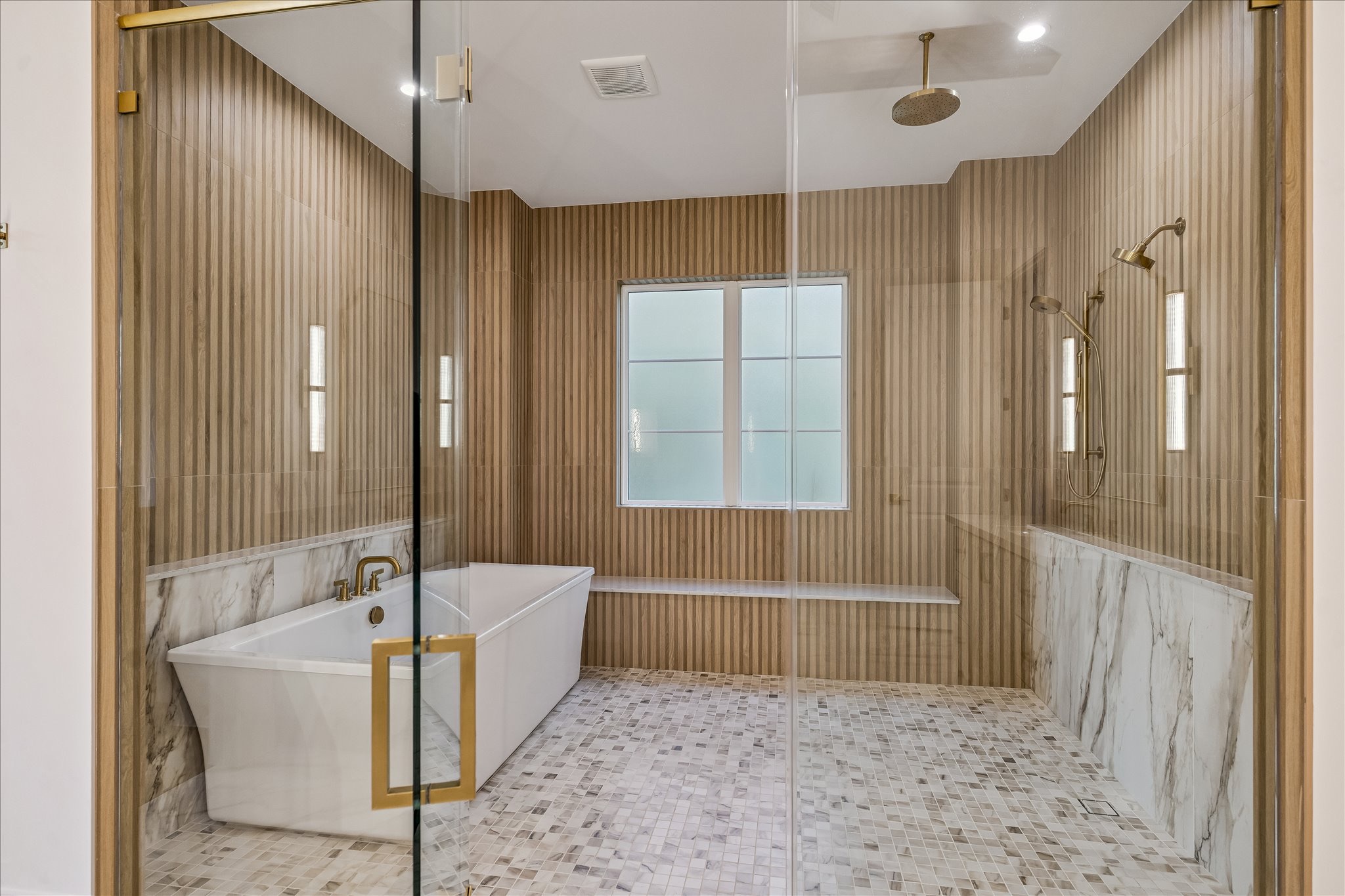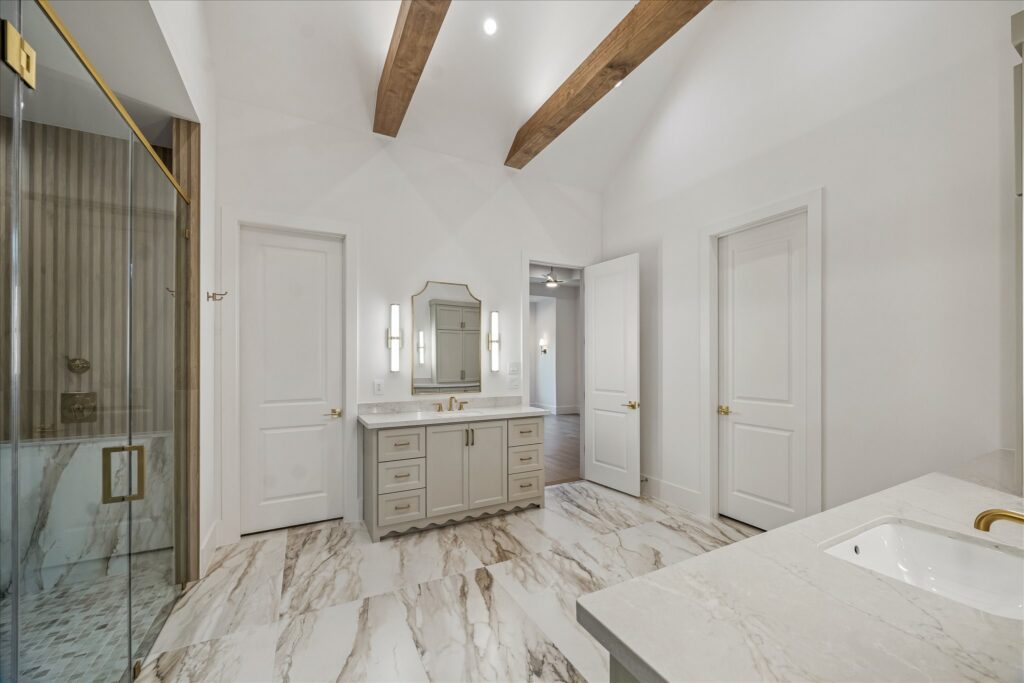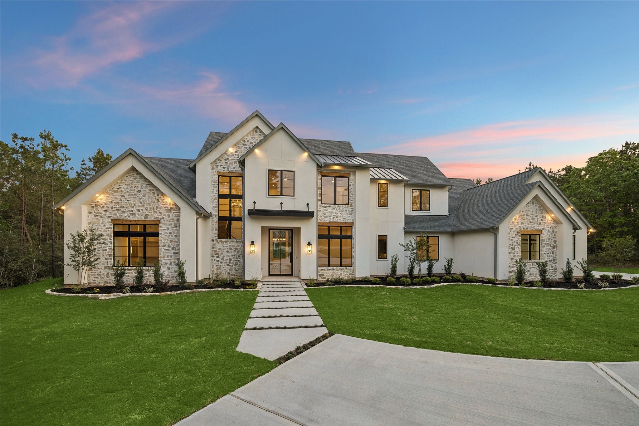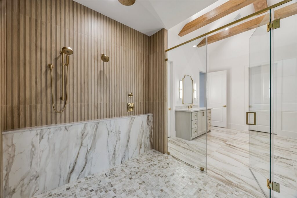 This transitional home blends stone and stucco with a striking metal front door, set on 1.5 acres. Wood floors and natural stone fireplace mantle with custom built-ins create a warm, refined interior. A coffered ceiling defines the living space, opening seamlessly to the kitchen with reeded cabinetry and a large island designed for gathering. The primary bathroom carries natural tones throughout, offering a calm and elevated retreat.