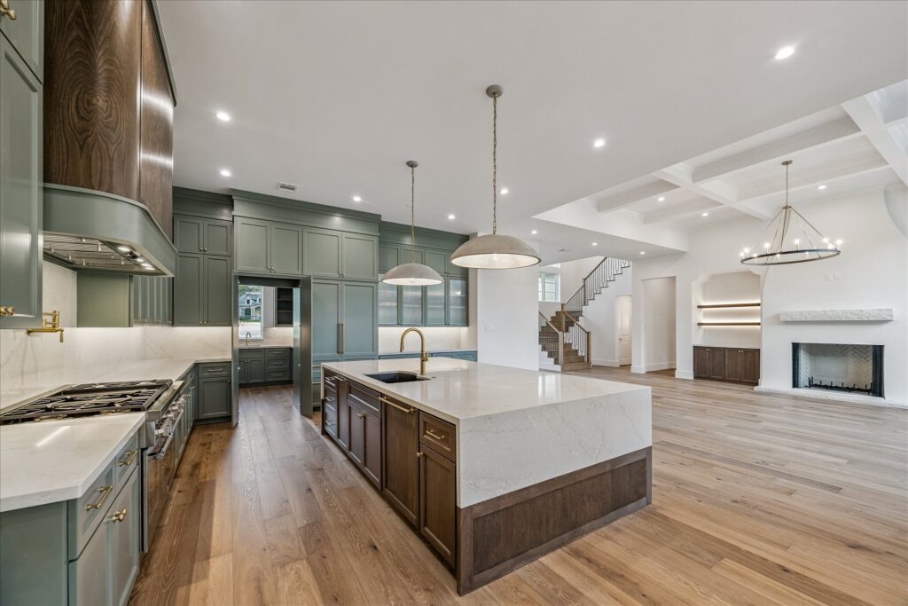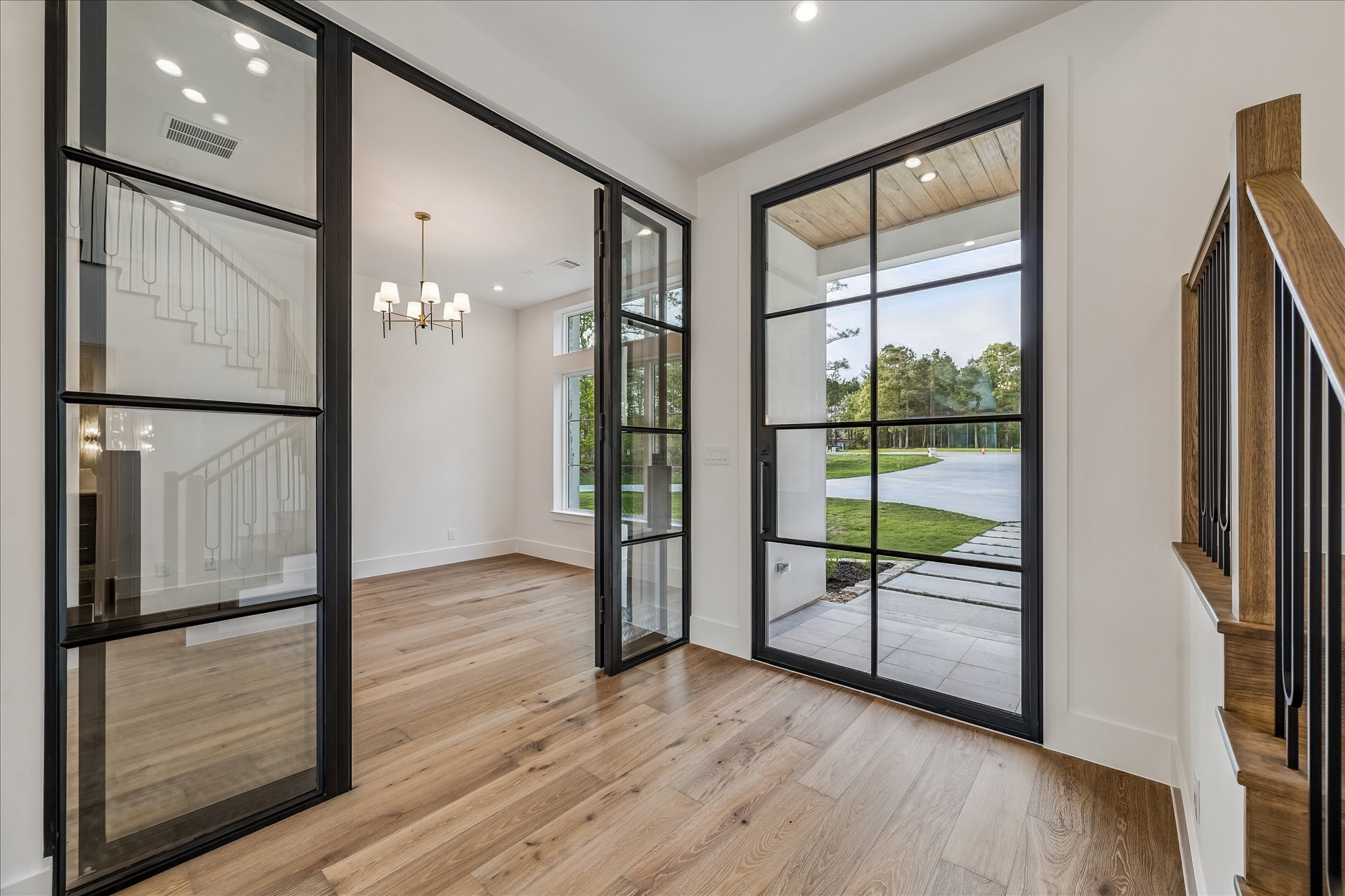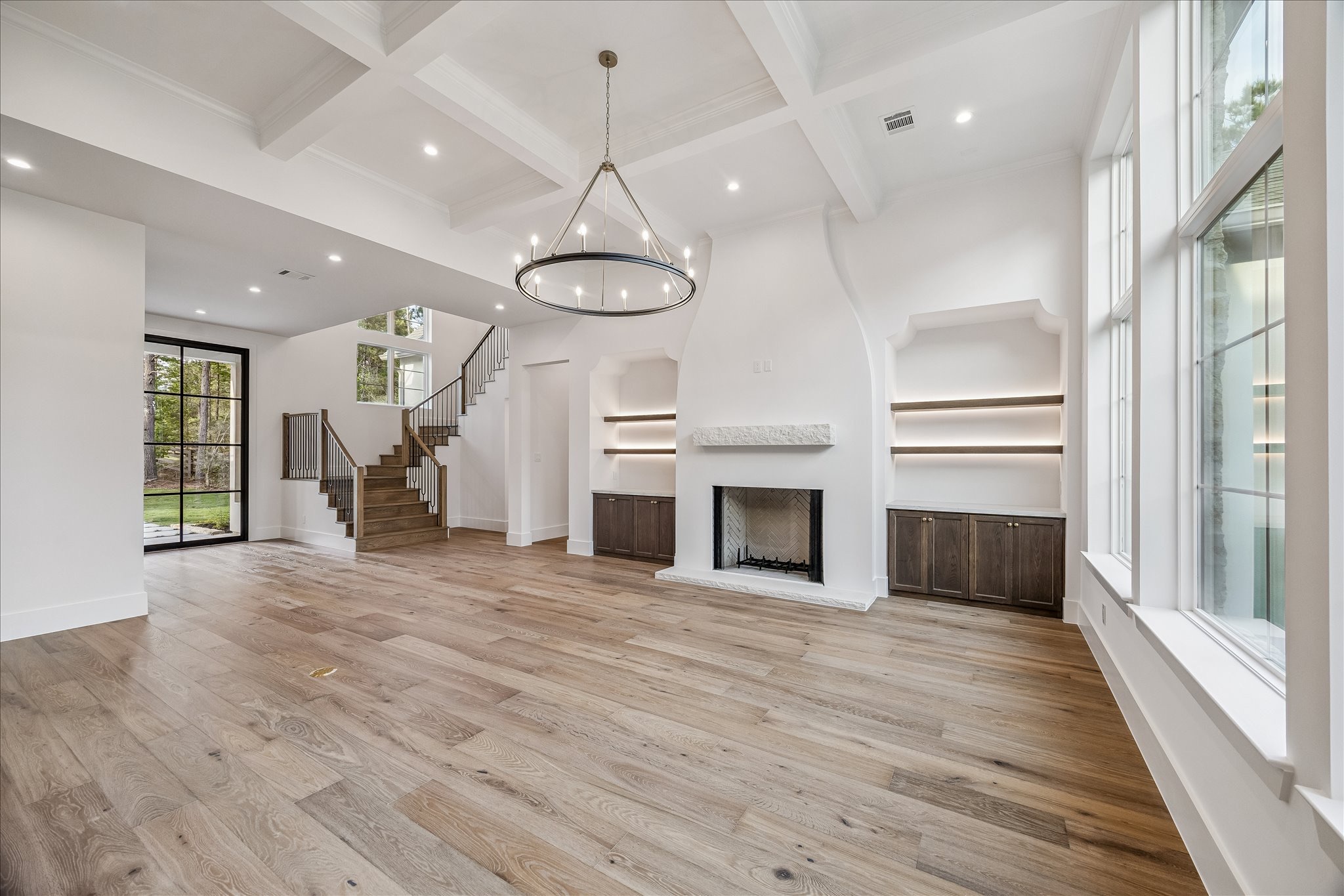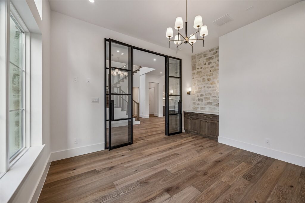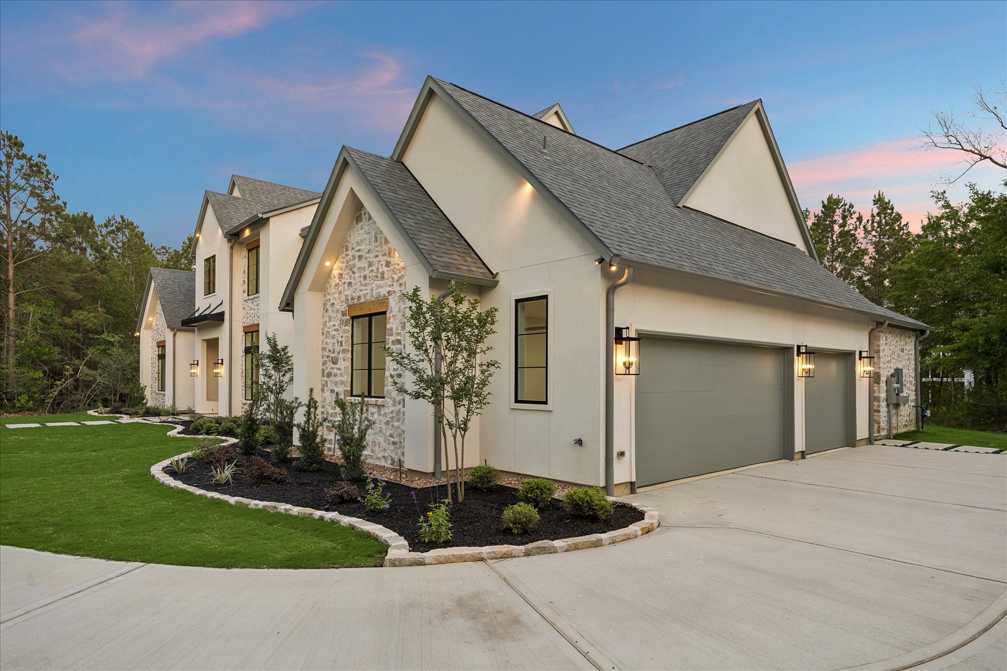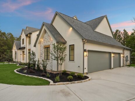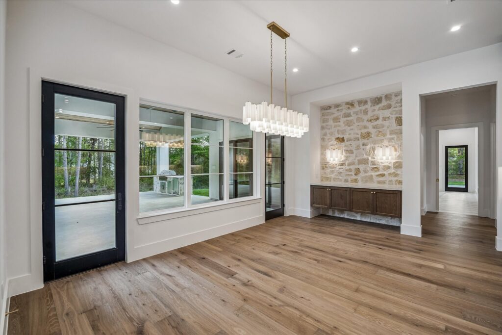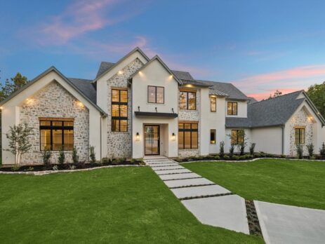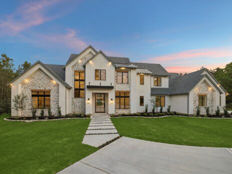 This transitional home blends stone and stucco with a striking metal front door, set on 1.5 acres. Wood floors and natural stone fireplace mantle with custom built-ins create a warm, refined interior. A coffered ceiling defines the living space, opening seamlessly to the kitchen with reeded cabinetry and a large island designed for gathering. The primary bathroom carries natural tones throughout, offering a calm and elevated retreat.