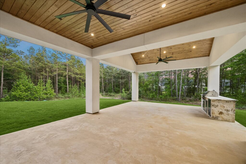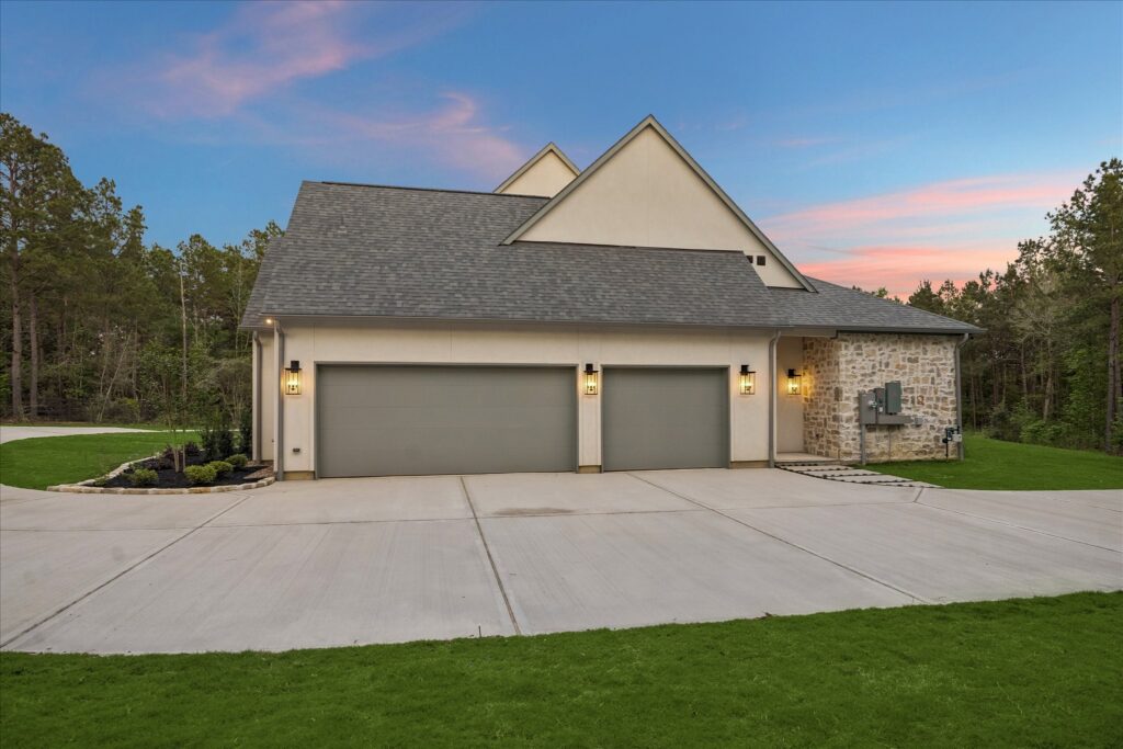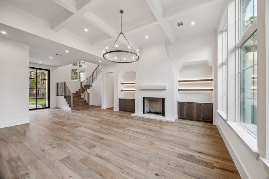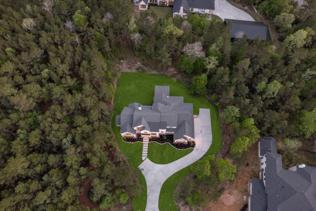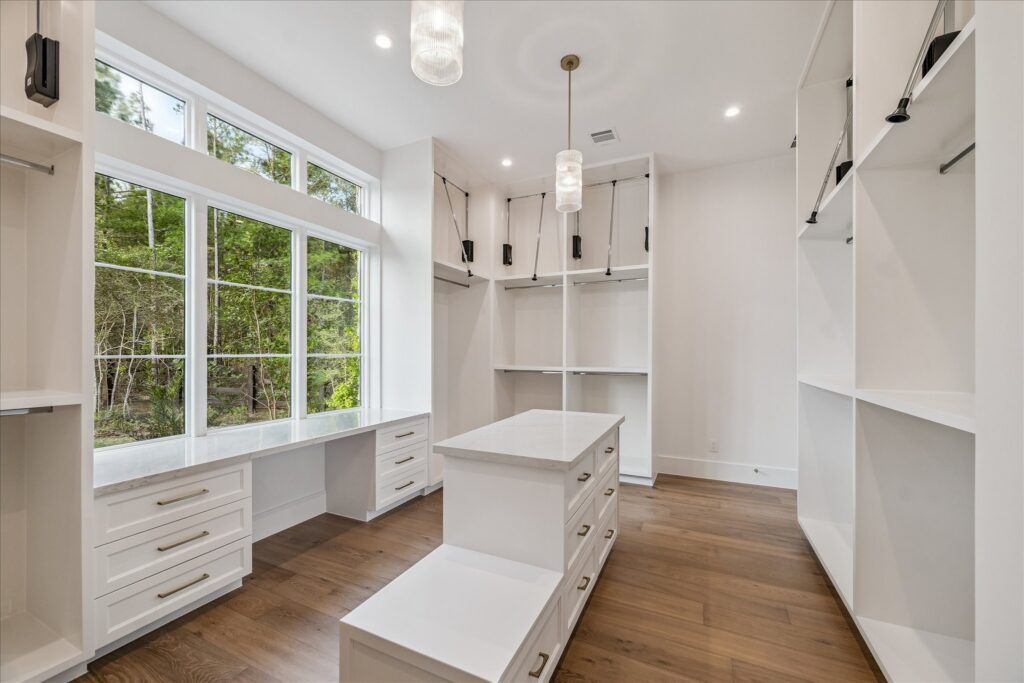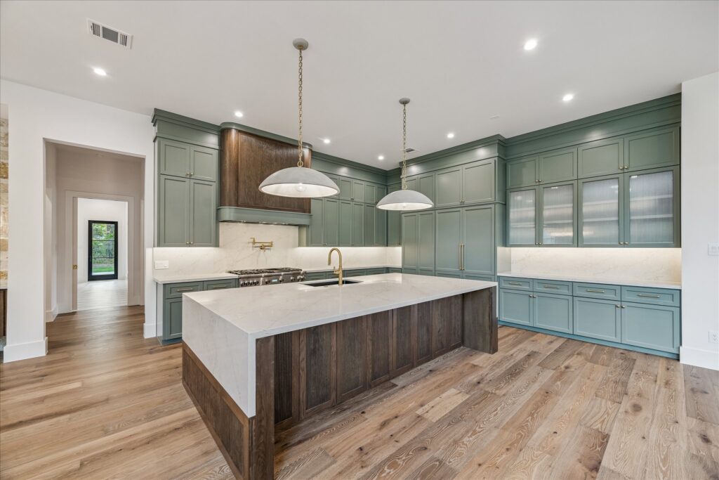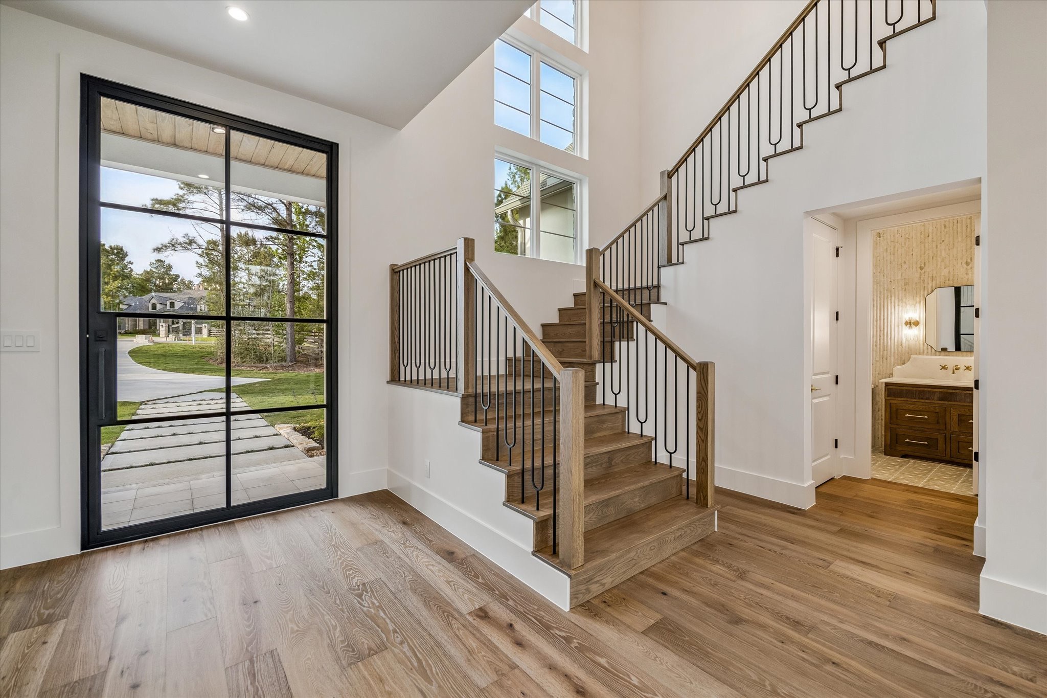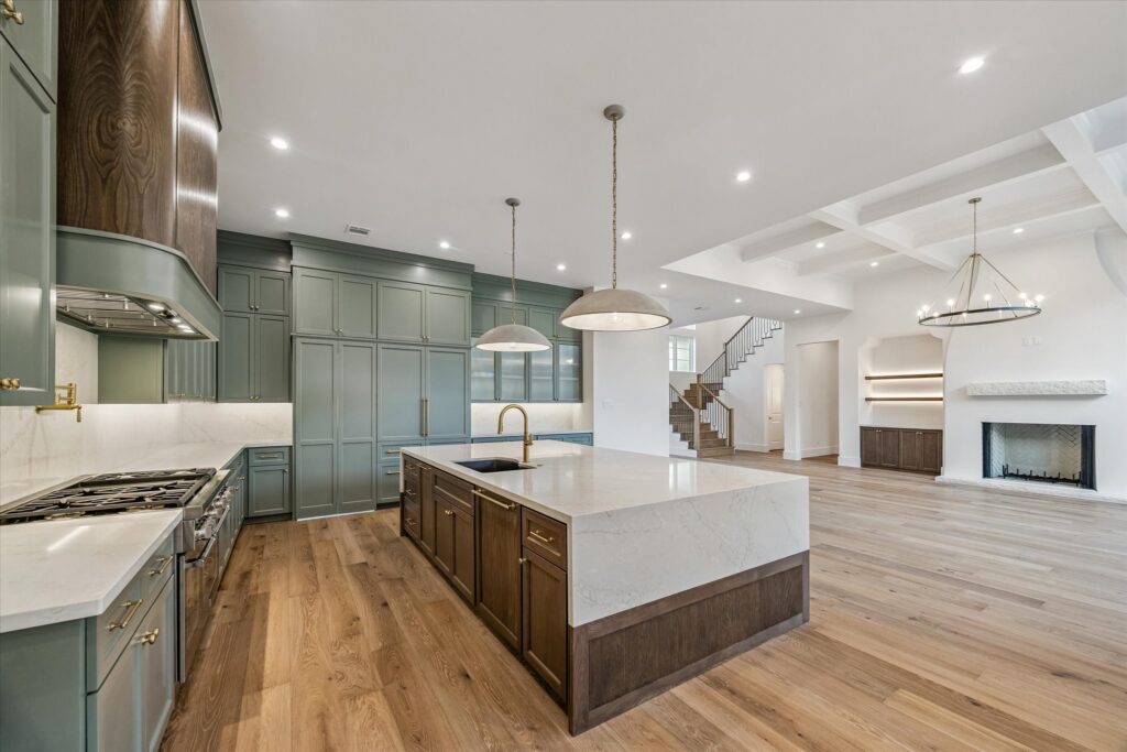 This transitional home blends stone and stucco with a striking metal front door, set on 1.5 acres. Wood floors and natural stone fireplace mantle with custom built-ins create a warm, refined interior. A coffered ceiling defines the living space, opening seamlessly to the kitchen with reeded cabinetry and a large island designed for gathering. The primary bathroom carries natural tones throughout, offering a calm and elevated retreat.