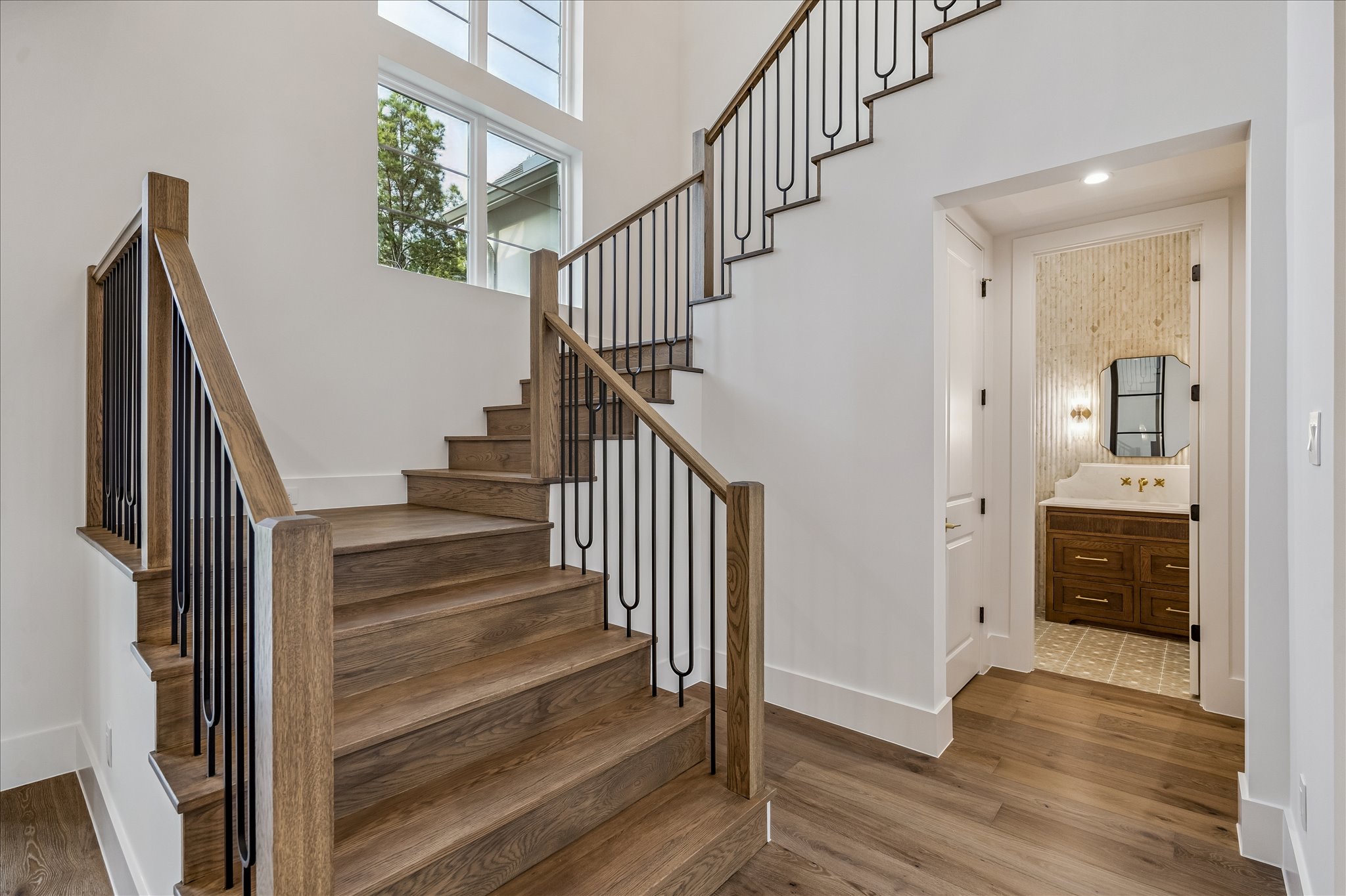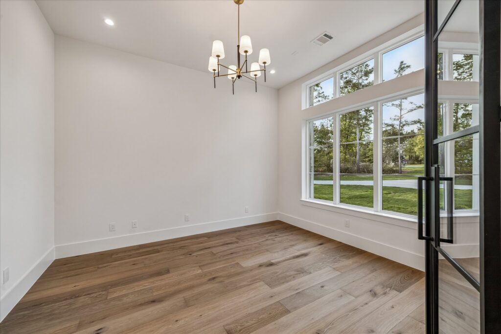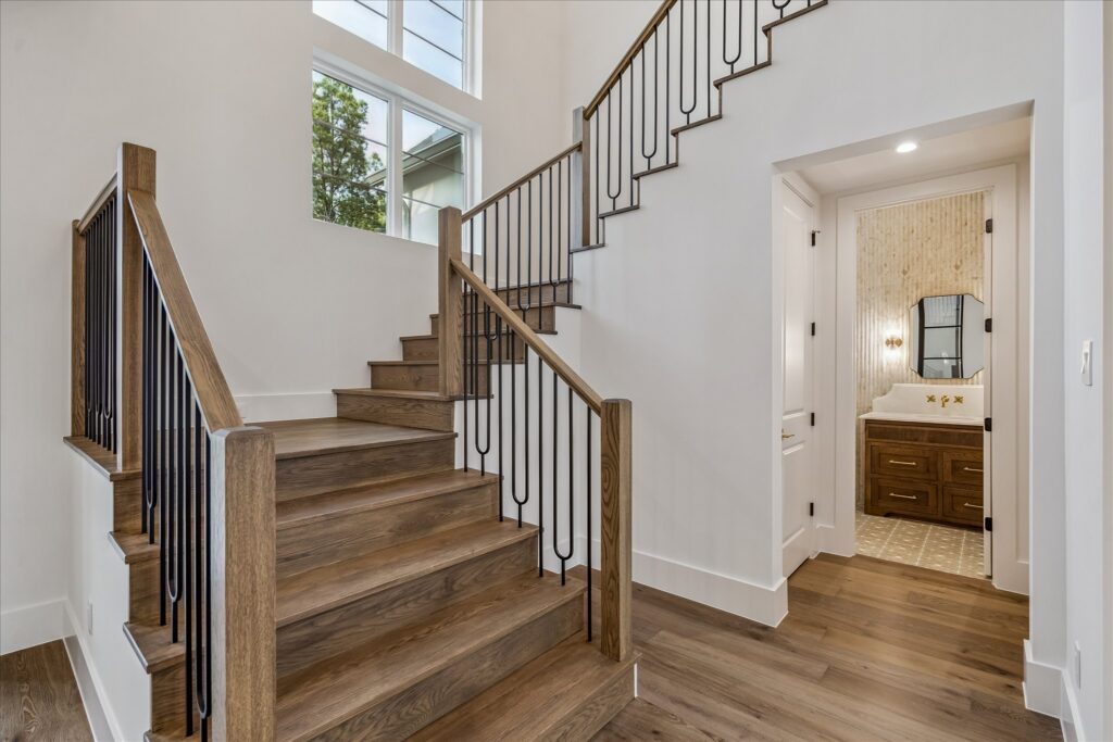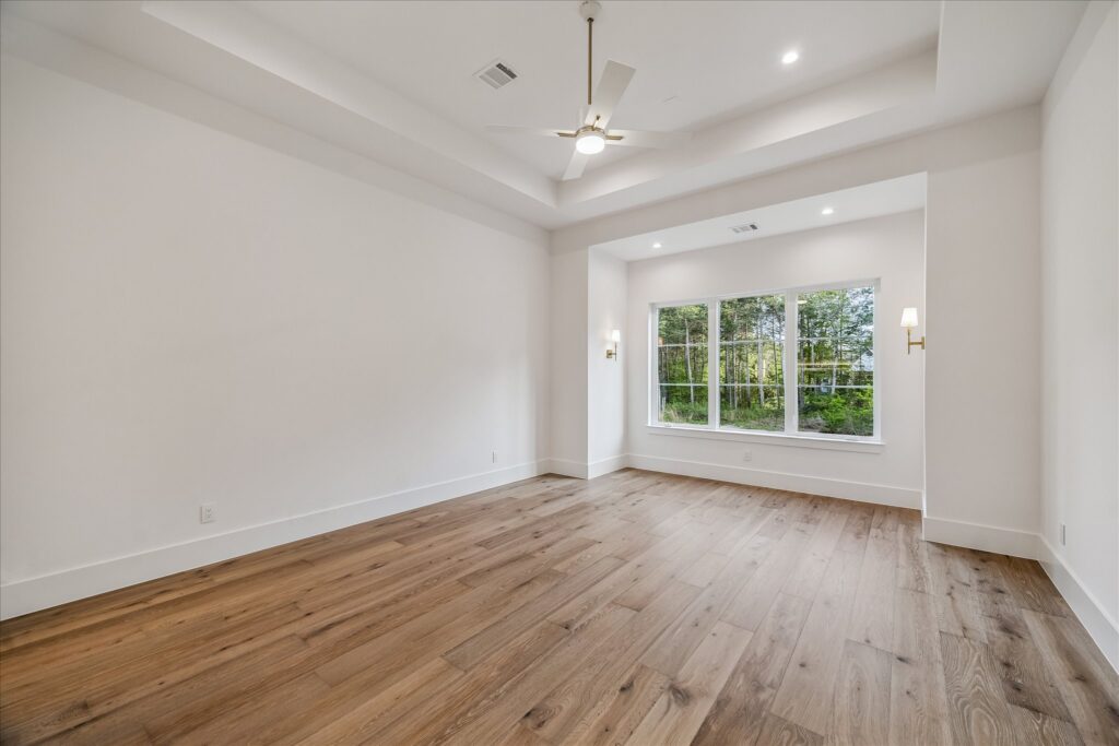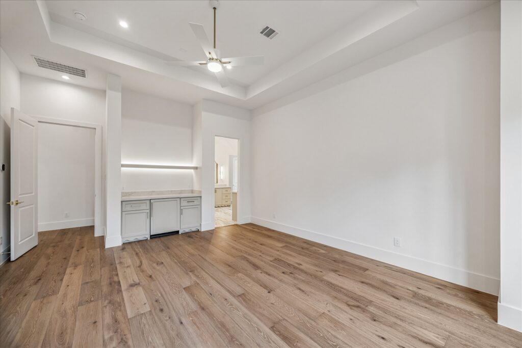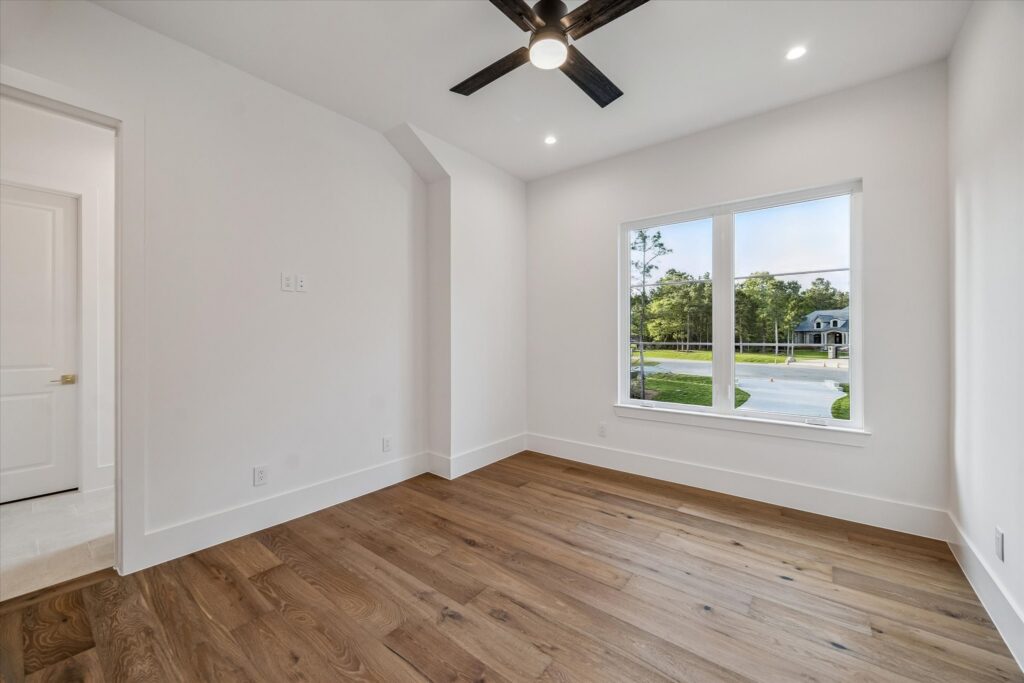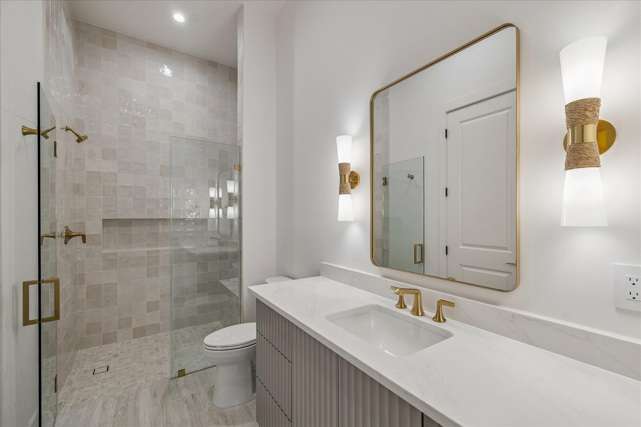 This transitional home blends stone and stucco with a striking metal front door, set on 1.5 acres. Wood floors and natural stone fireplace mantle with custom built-ins create a warm, refined interior. A coffered ceiling defines the living space, opening seamlessly to the kitchen with reeded cabinetry and a large island designed for gathering. The primary bathroom carries natural tones throughout, offering a calm and elevated retreat.