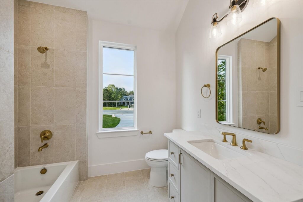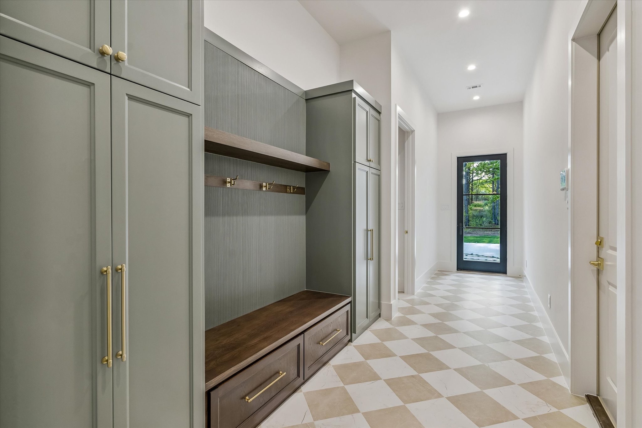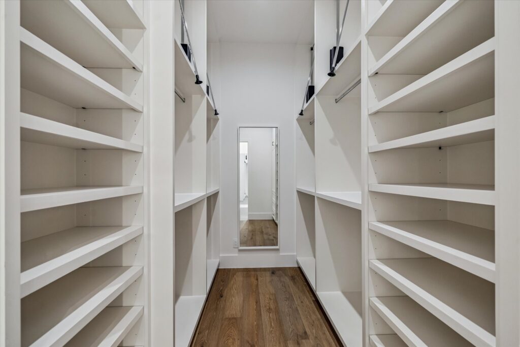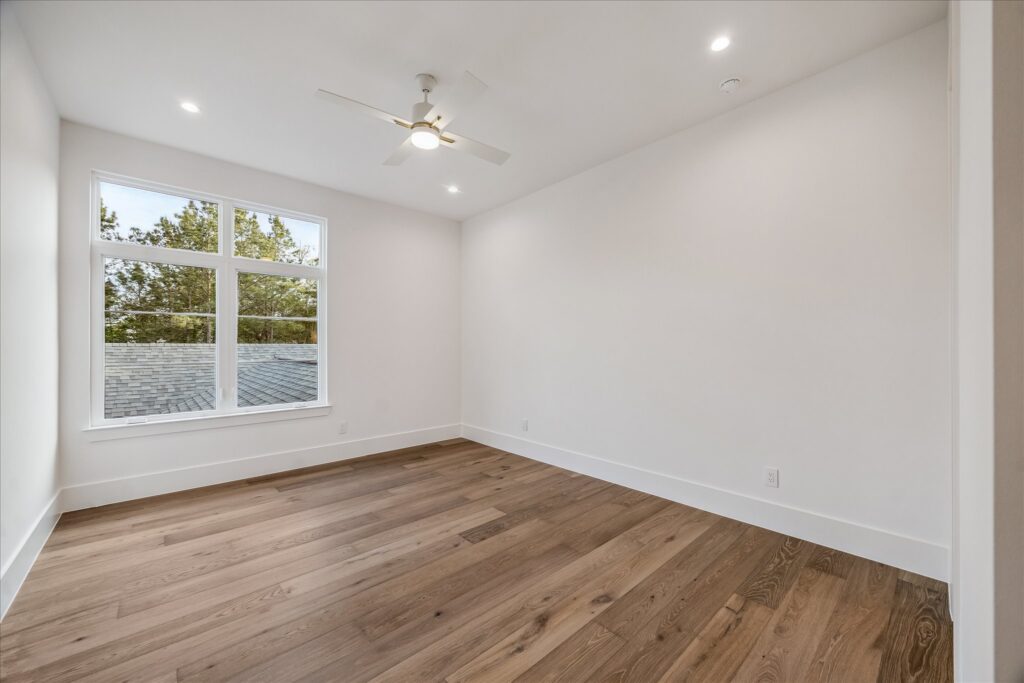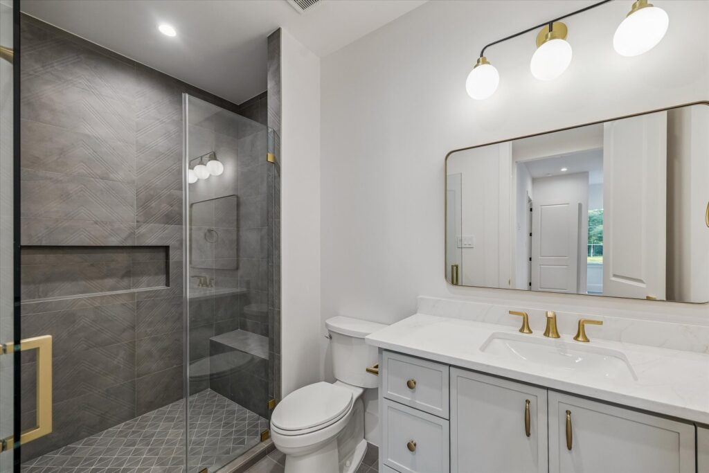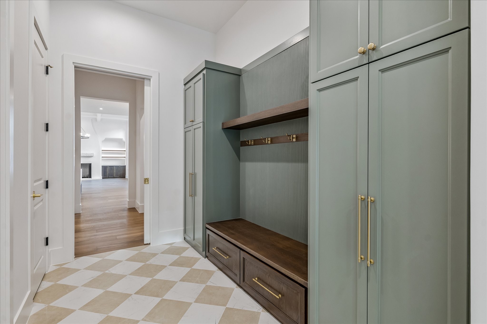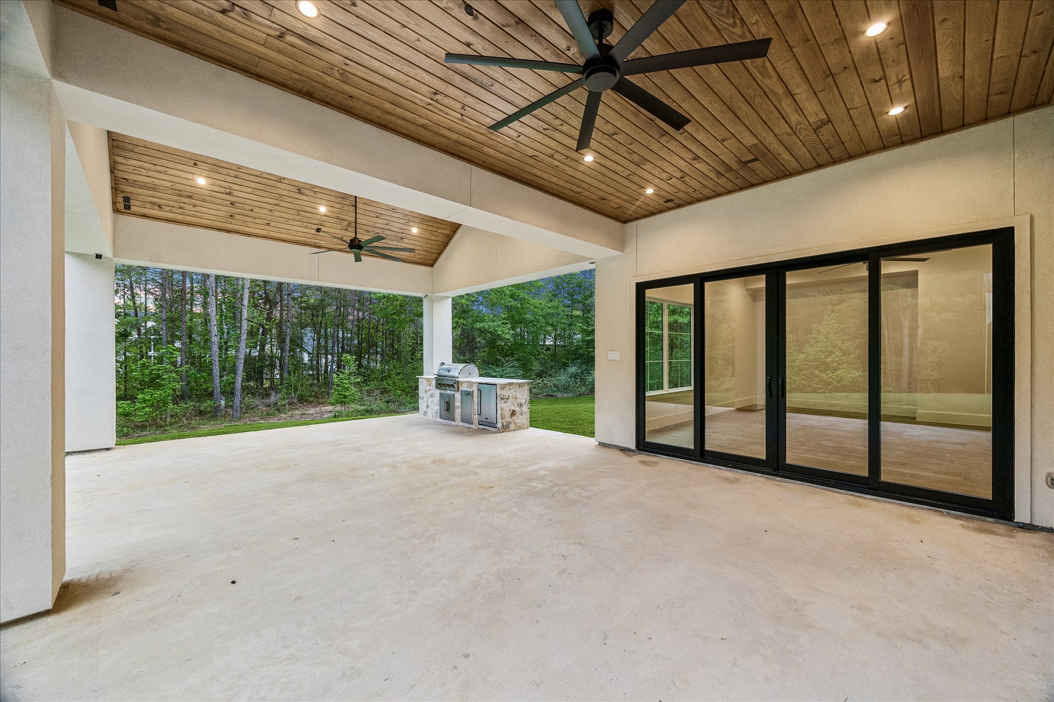This transitional home blends stone and stucco with a striking metal front door, set on 1.5 acres. Wood floors and natural stone fireplace mantle with custom built-ins create a warm, refined interior. A coffered ceiling defines the living space, opening seamlessly to the kitchen with reeded cabinetry and a large island designed for gathering. The primary bathroom carries natural tones throughout, offering a calm and elevated retreat.