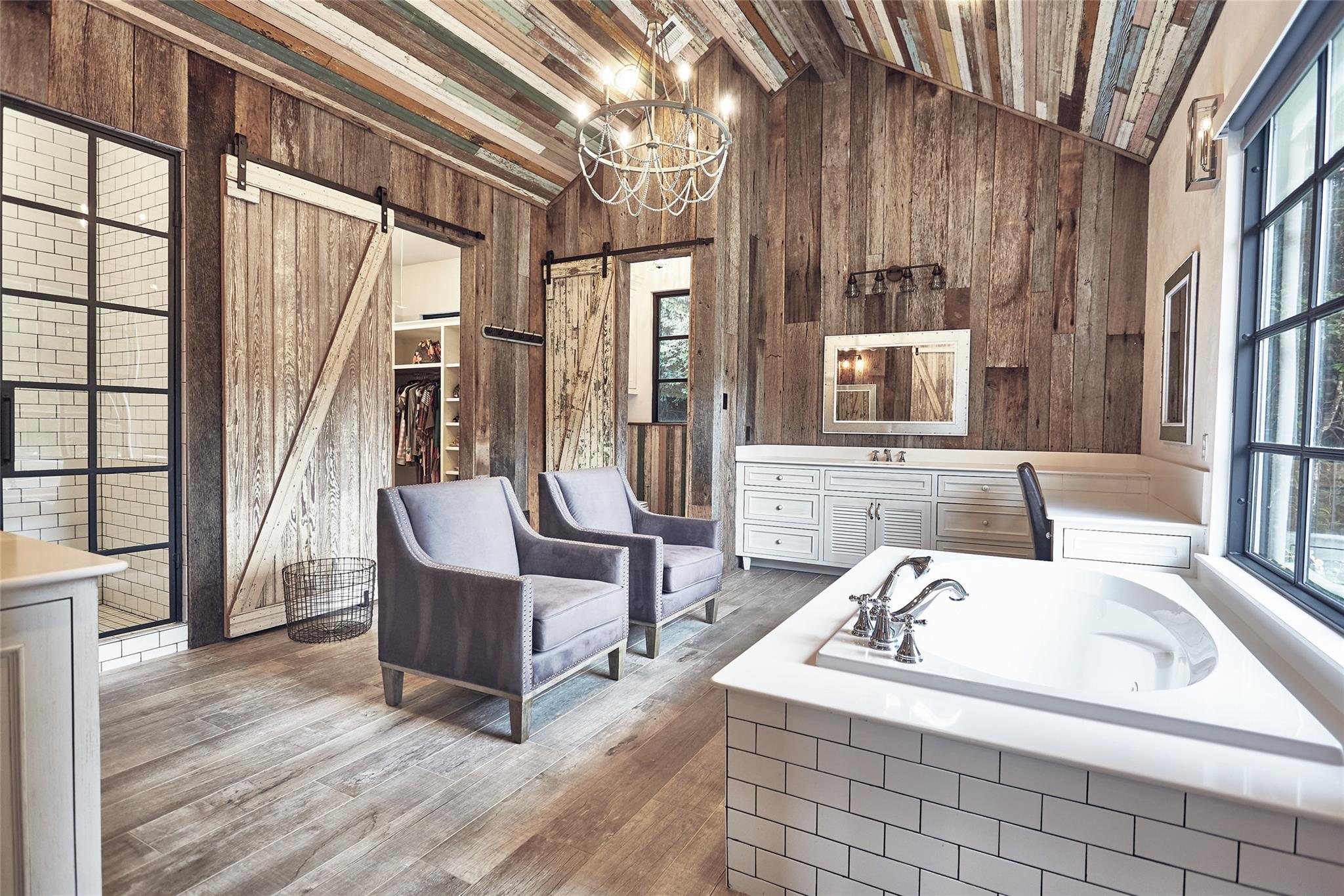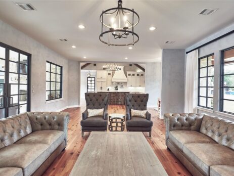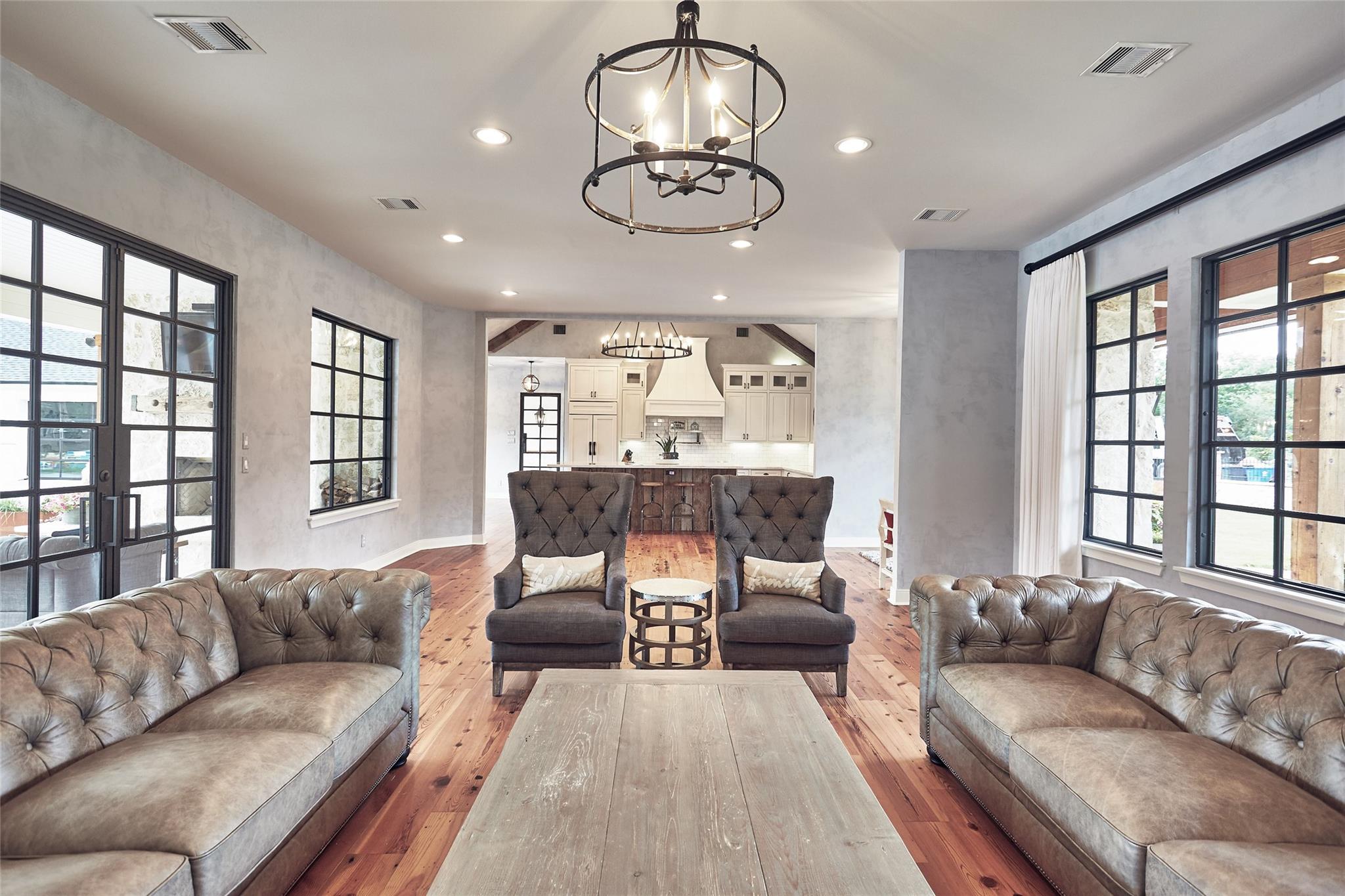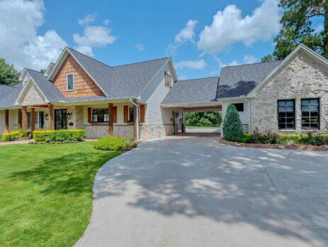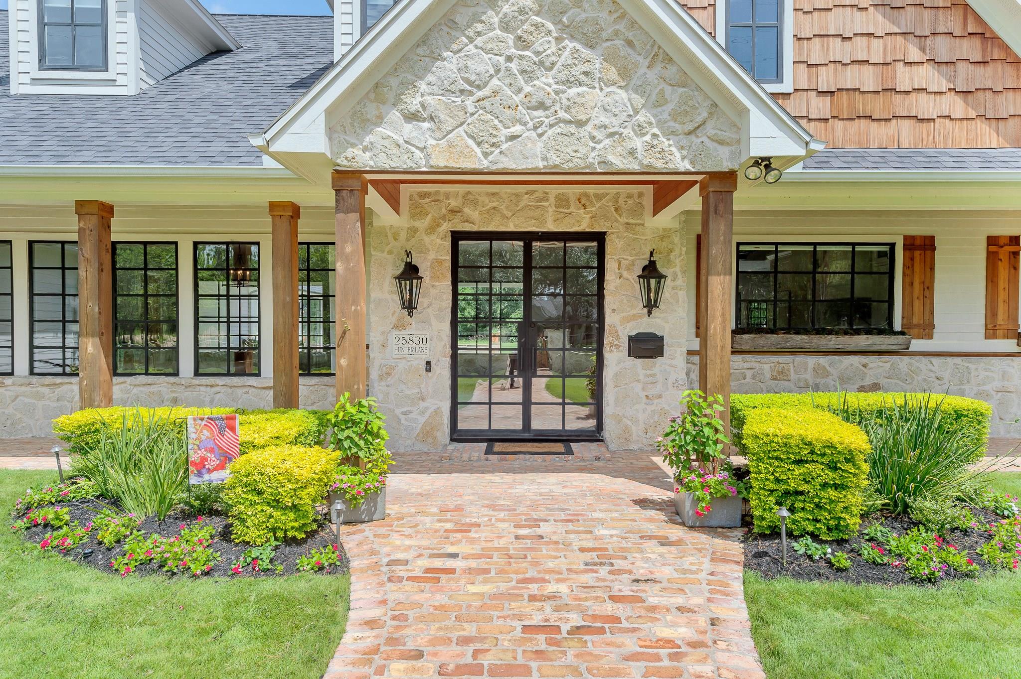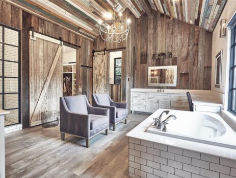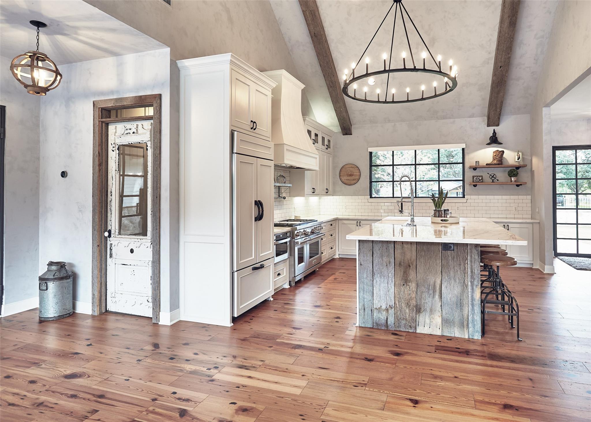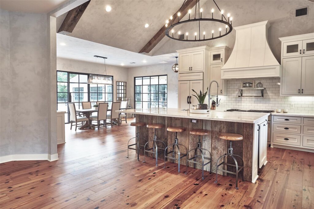This farmhouse-inspired home blends timeless character with elevated design through antique finishes and reclaimed materials. Large, black-framed windows fill the home with natural light, creating contrast against the warmth of the interiors. Reclaimed wood adds depth and authenticity throughout, while marble countertops bring a refined touch to the kitchen. Each detail was thoughtfully selected to create a space that feels both classic and elevated. The result is a home rooted in craftsmanship and livable design.
