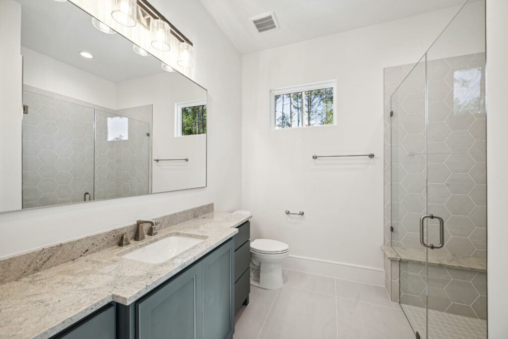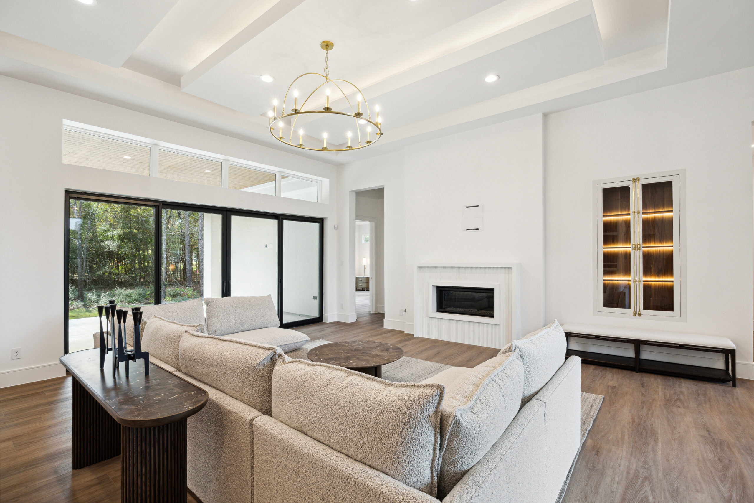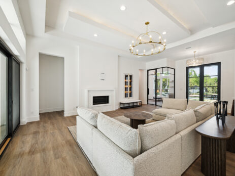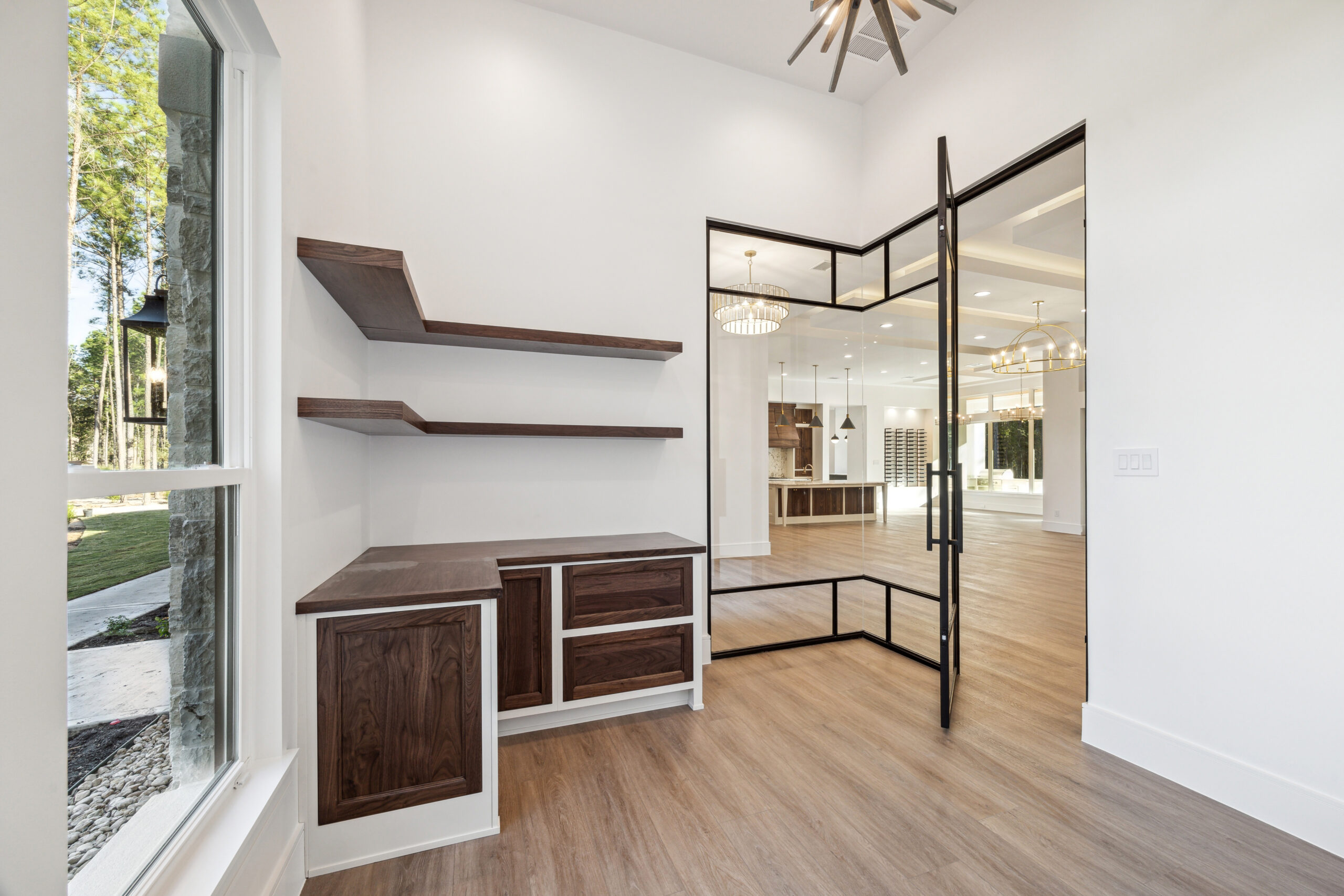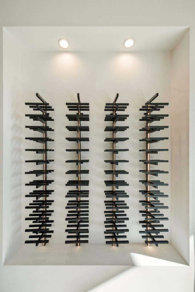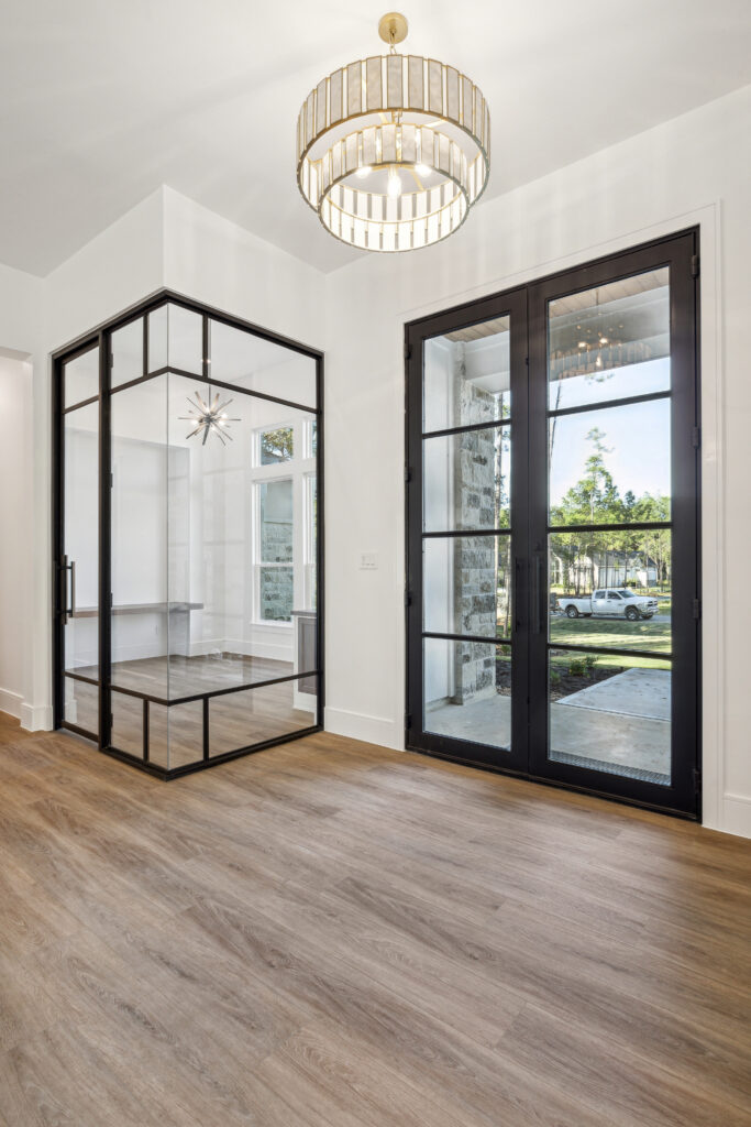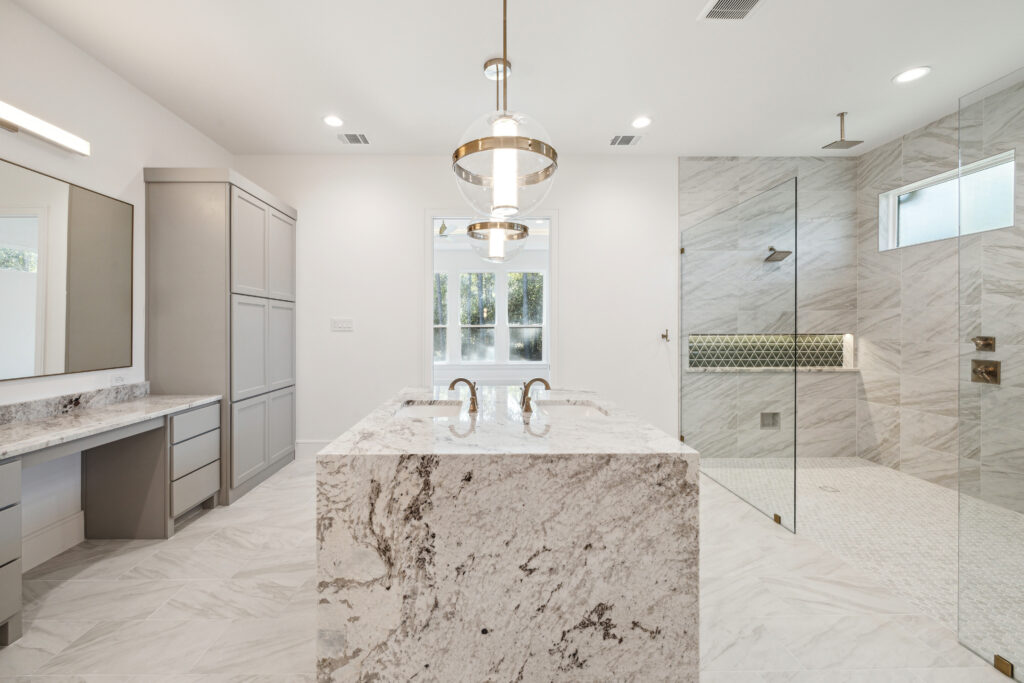 This modern Hill Country home blends clean lines with warm, masculine elements through walnut cabinetry and curated finishes. Accent lighting and refined hardware add depth throughout. The primary bathroom features an island-style vanity with a suspended, illuminated mirror. A sliding glass door and custom wine storage enhance both function and flow.