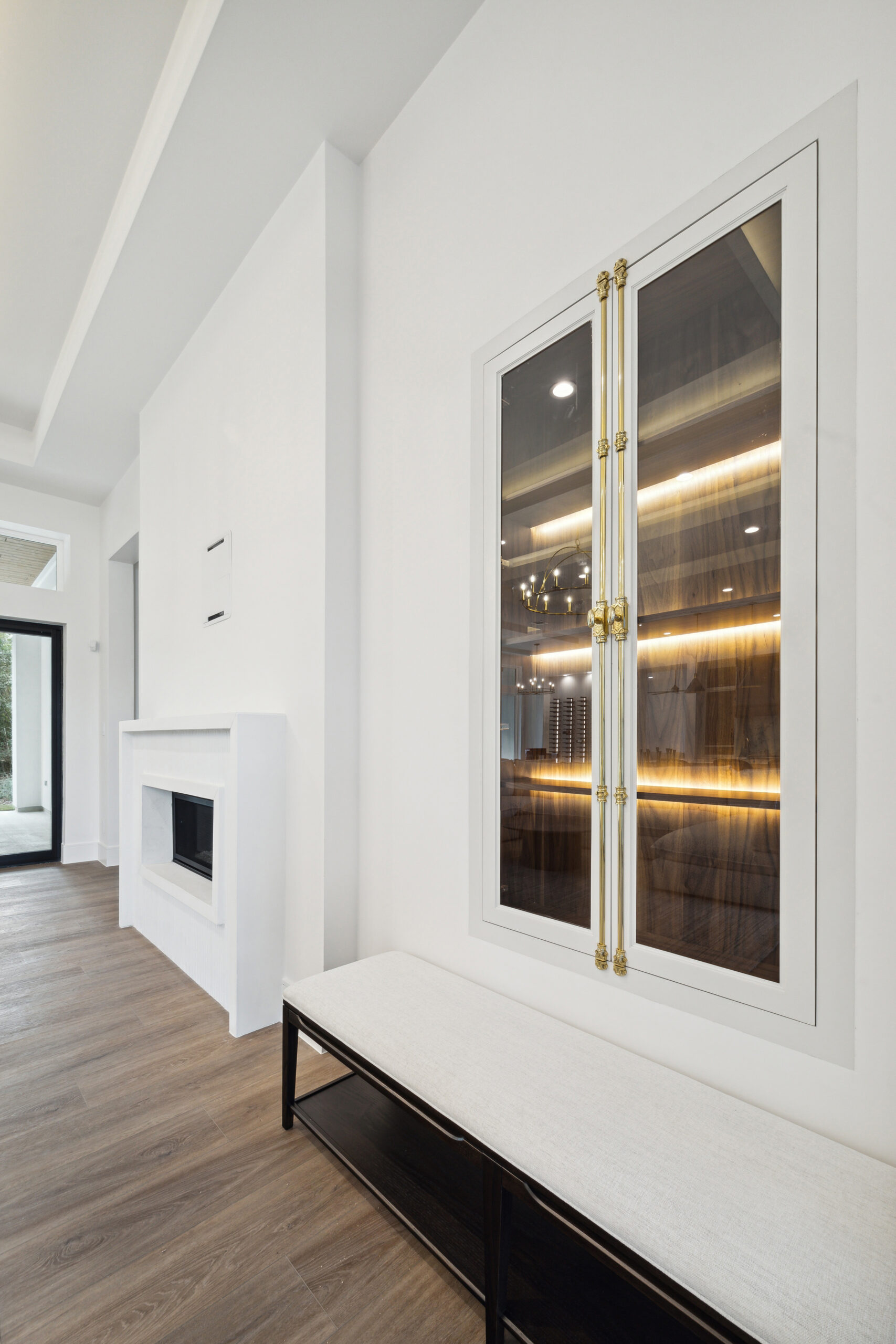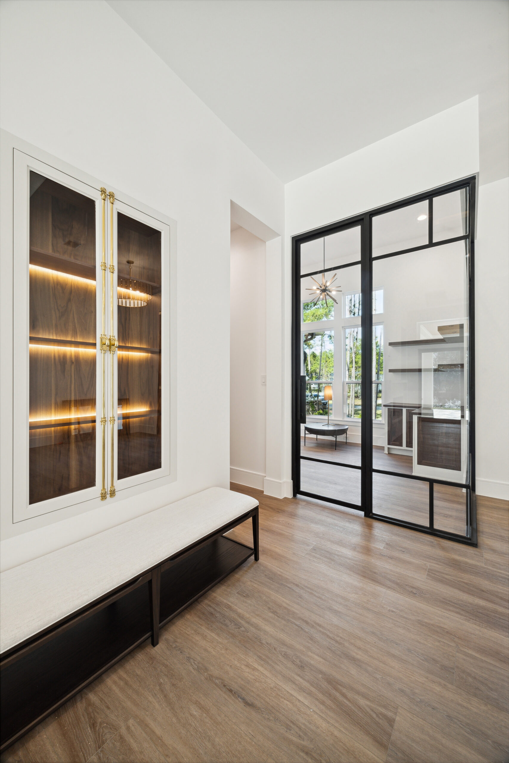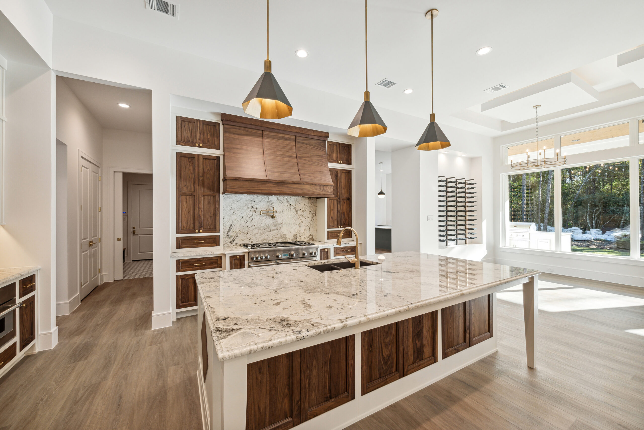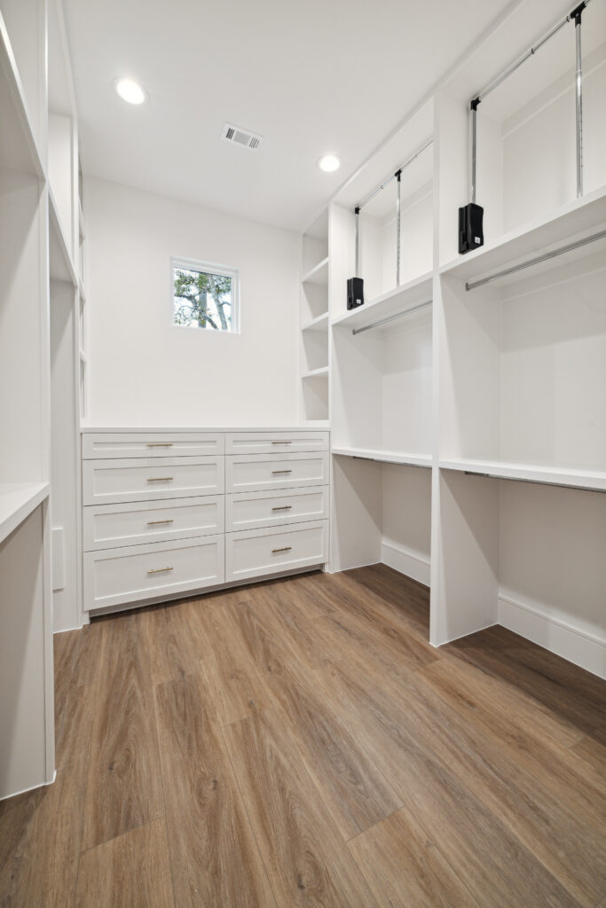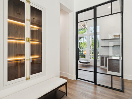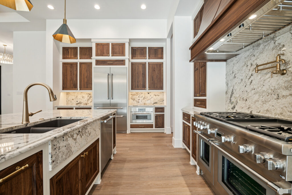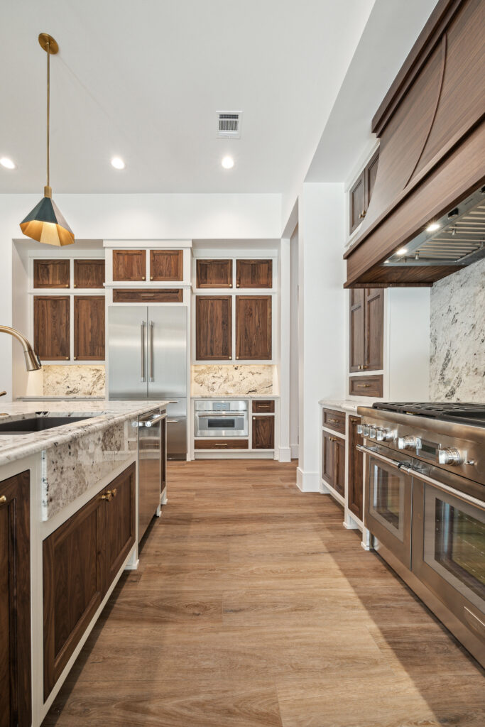 This modern Hill Country home blends clean lines with warm, masculine elements through walnut cabinetry and curated finishes. Accent lighting and refined hardware add depth throughout. The primary bathroom features an island-style vanity with a suspended, illuminated mirror. A sliding glass door and custom wine storage enhance both function and flow.