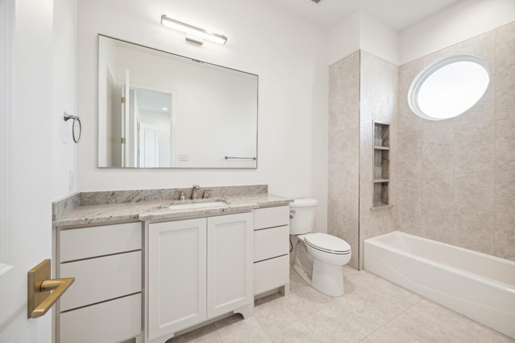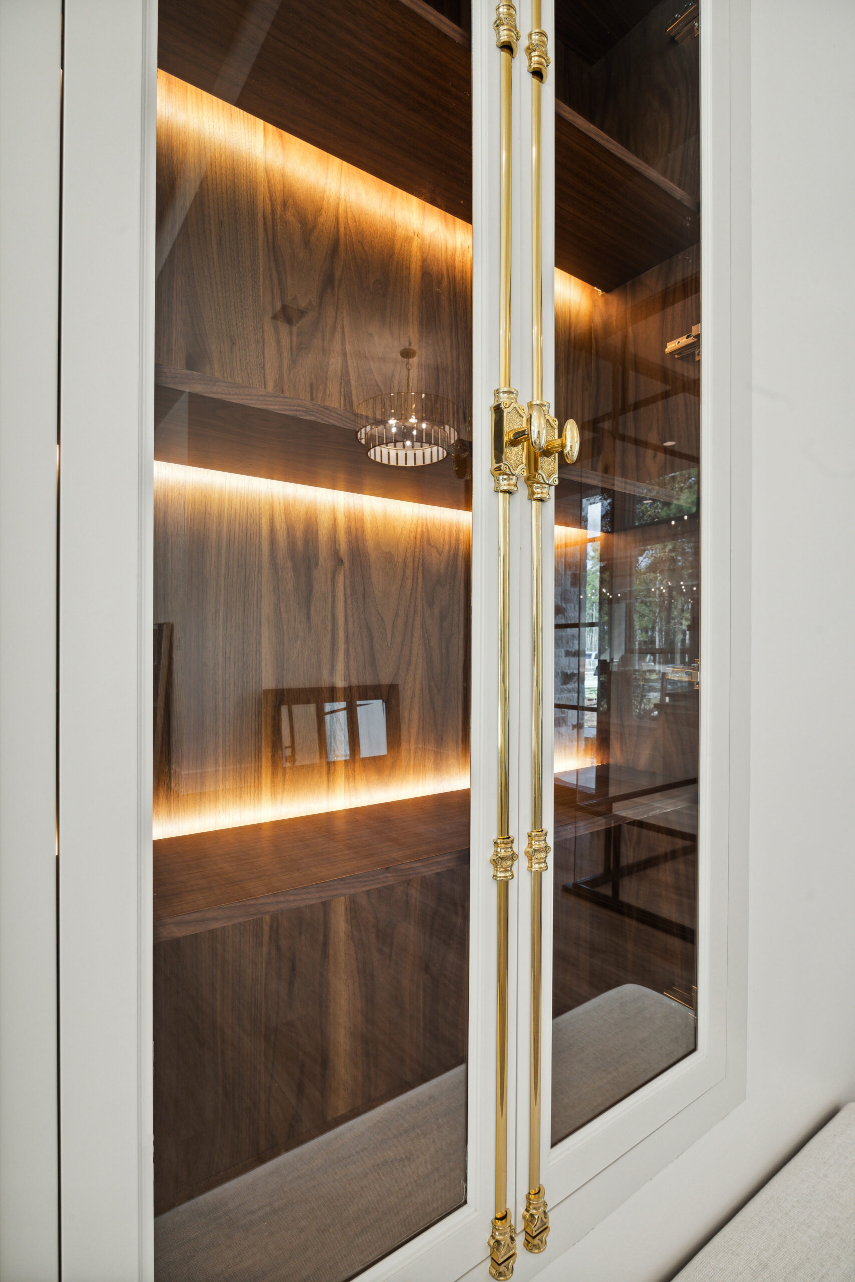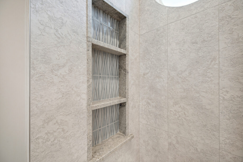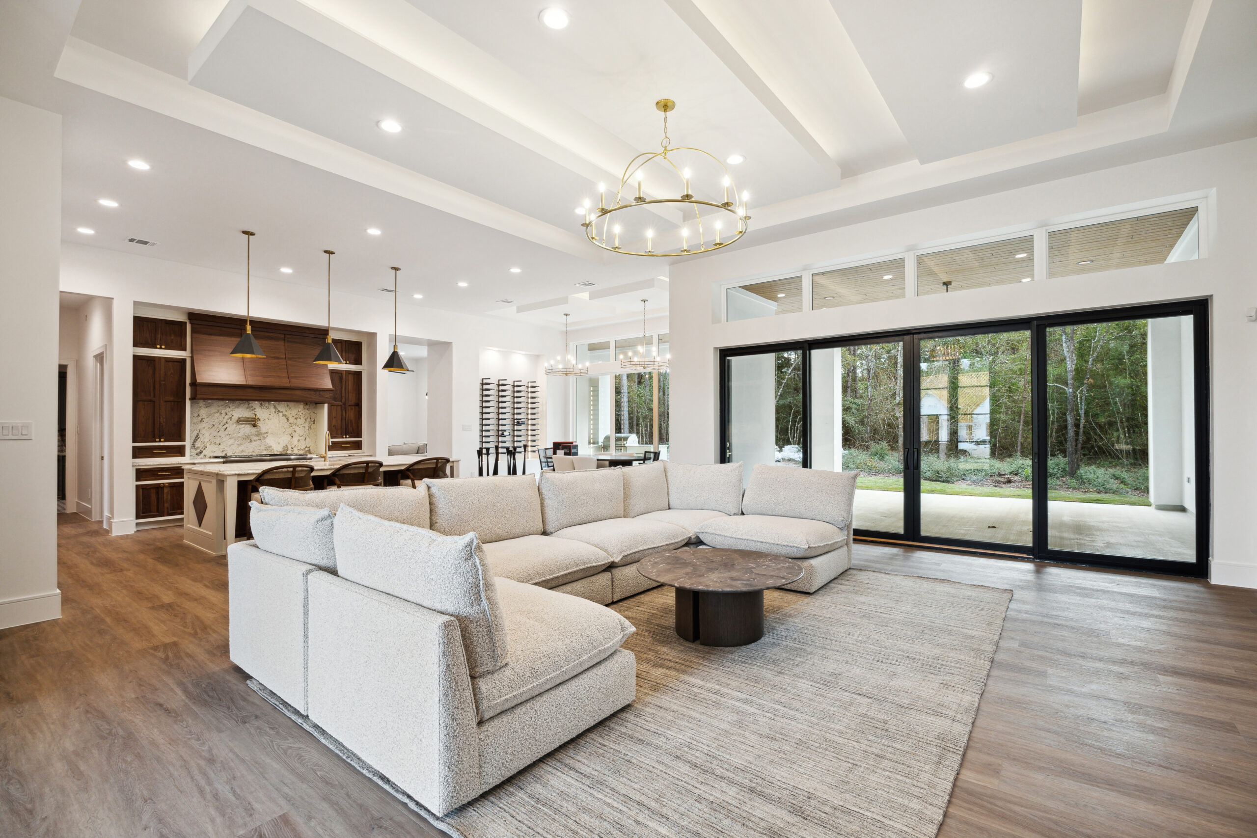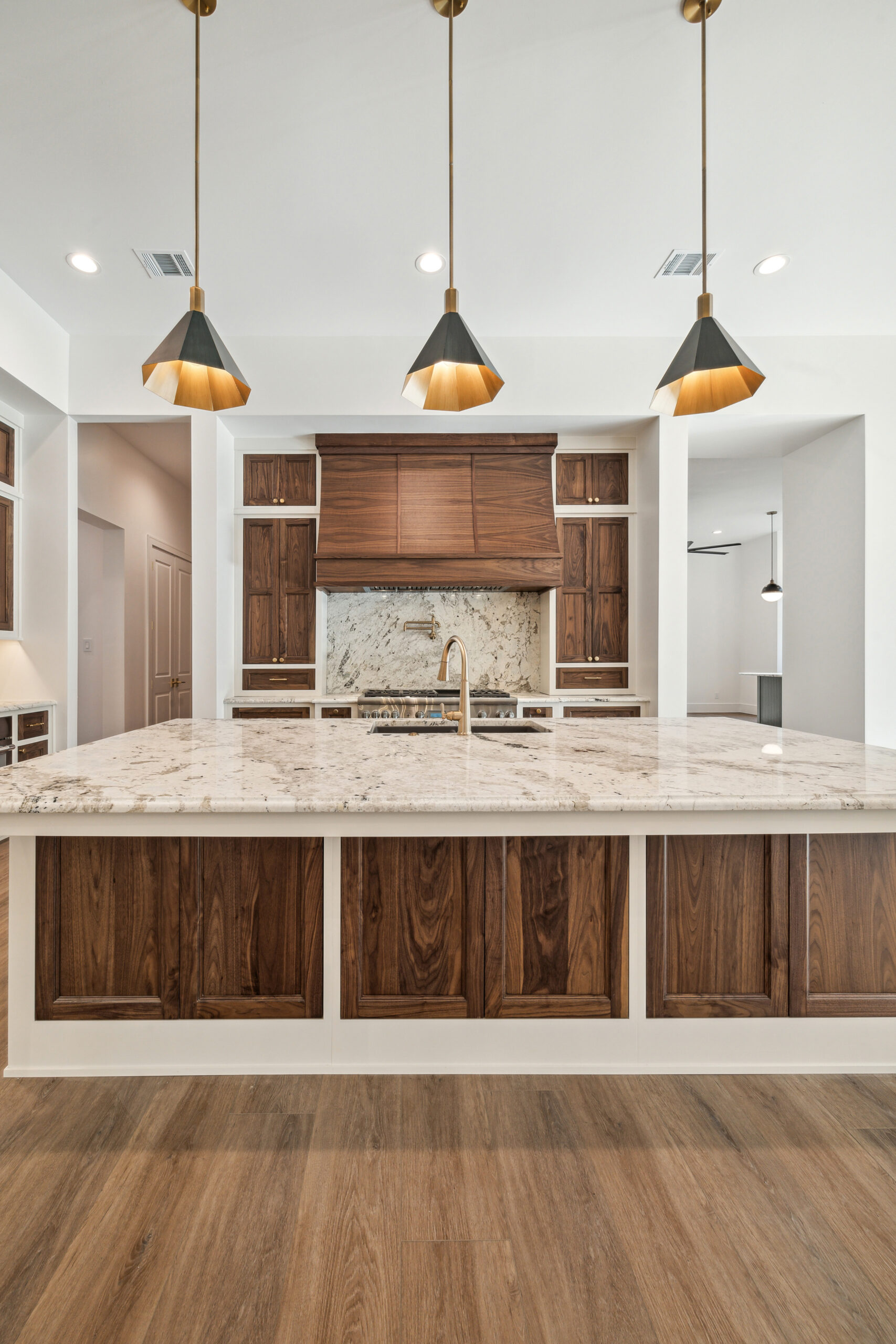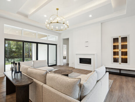 This modern Hill Country home blends clean lines with warm, masculine elements through walnut cabinetry and curated finishes. Accent lighting and refined hardware add depth throughout. The primary bathroom features an island-style vanity with a suspended, illuminated mirror. A sliding glass door and custom wine storage enhance both function and flow.