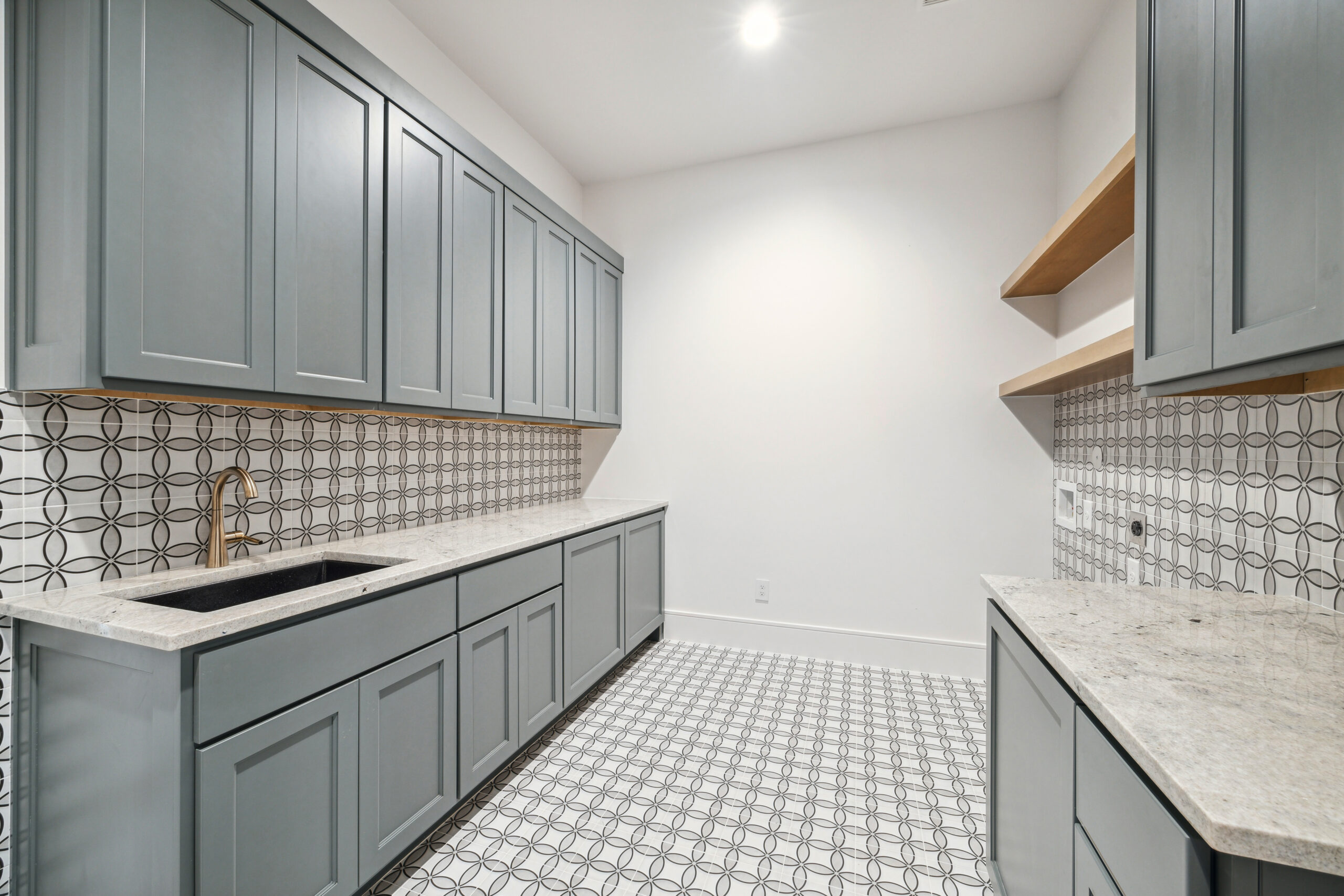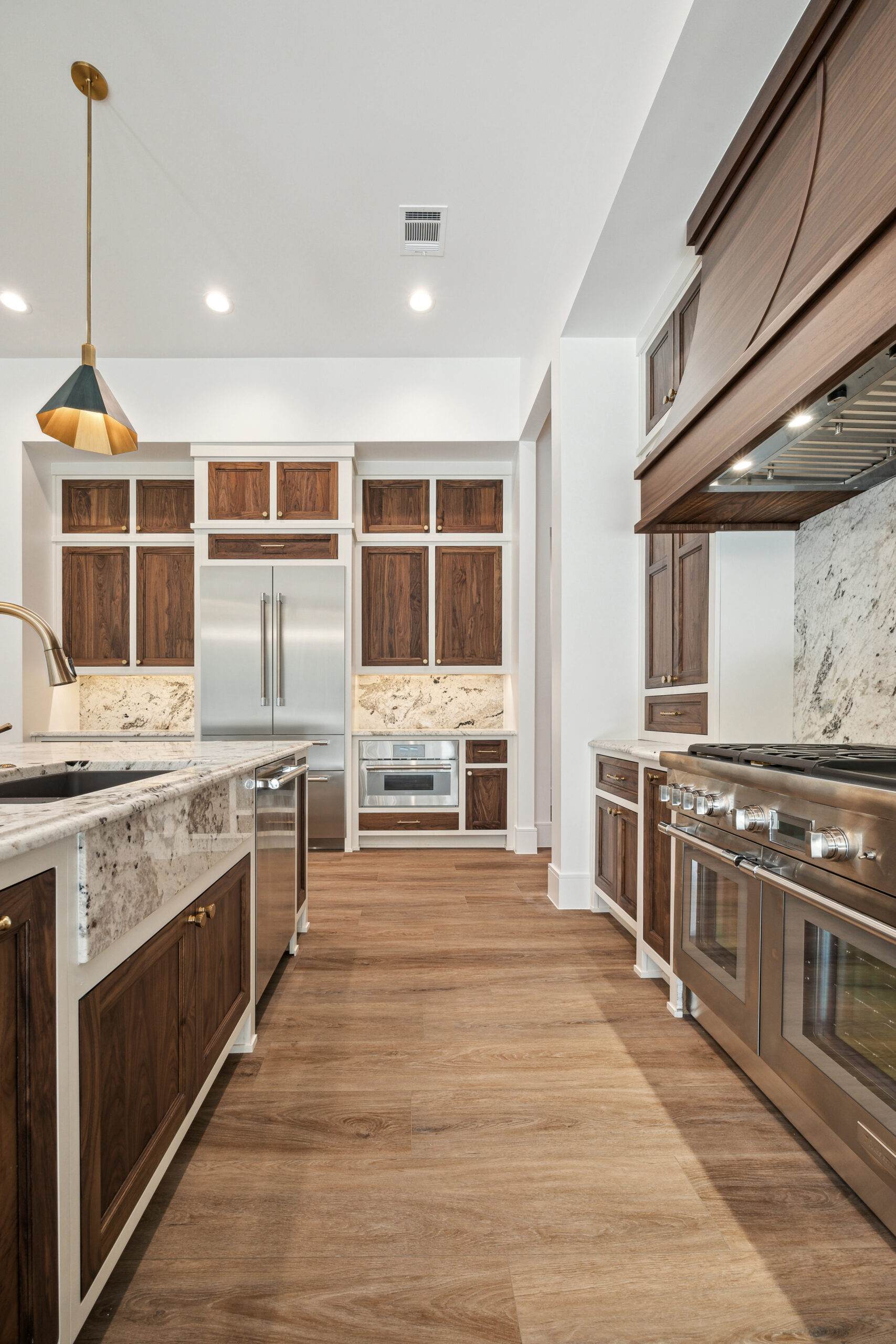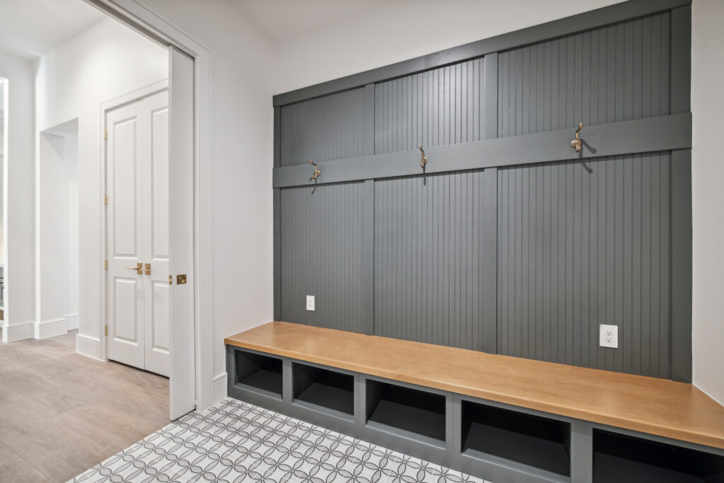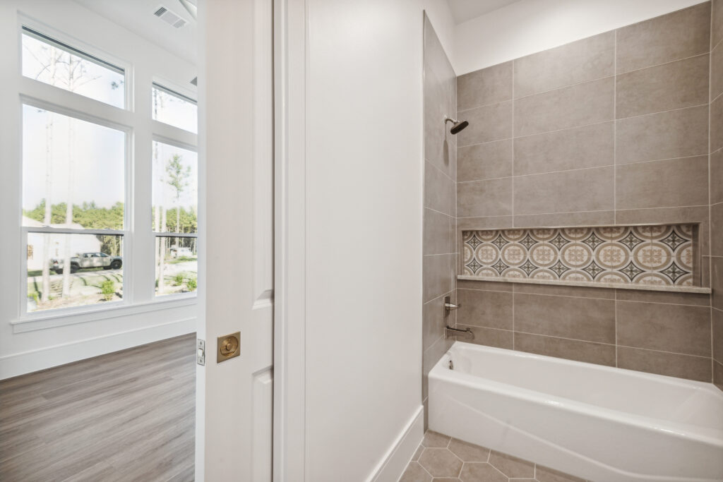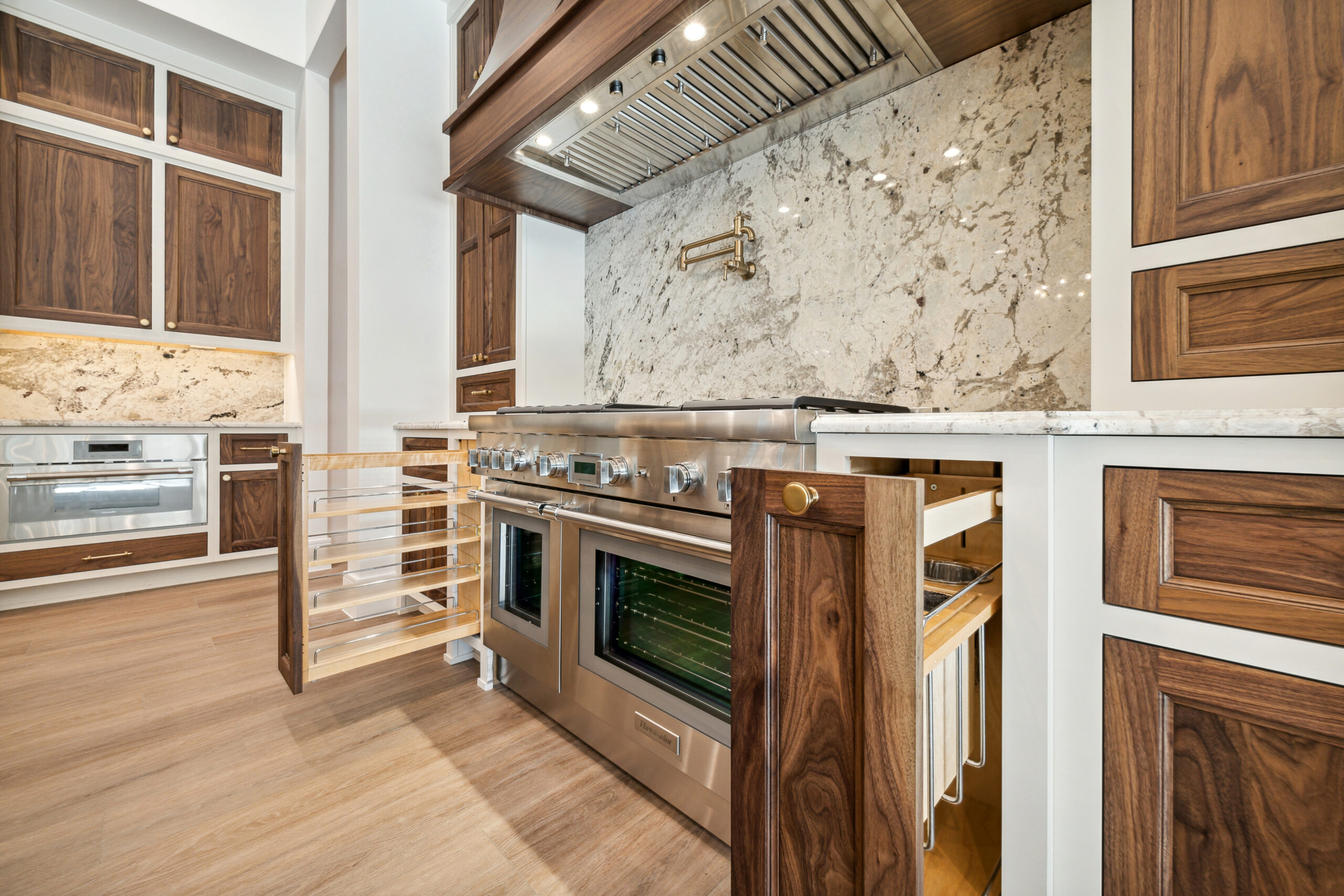 This modern Hill Country home blends clean lines with warm, masculine elements through walnut cabinetry and curated finishes. Accent lighting and refined hardware add depth throughout. The primary bathroom features an island-style vanity with a suspended, illuminated mirror. A sliding glass door and custom wine storage enhance both function and flow.