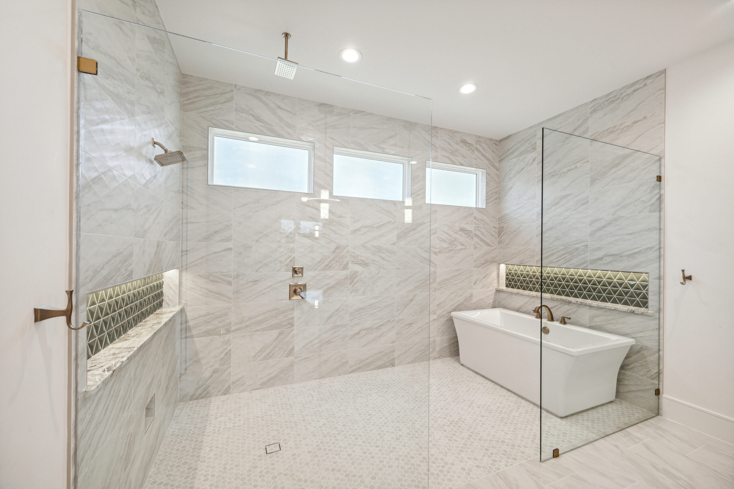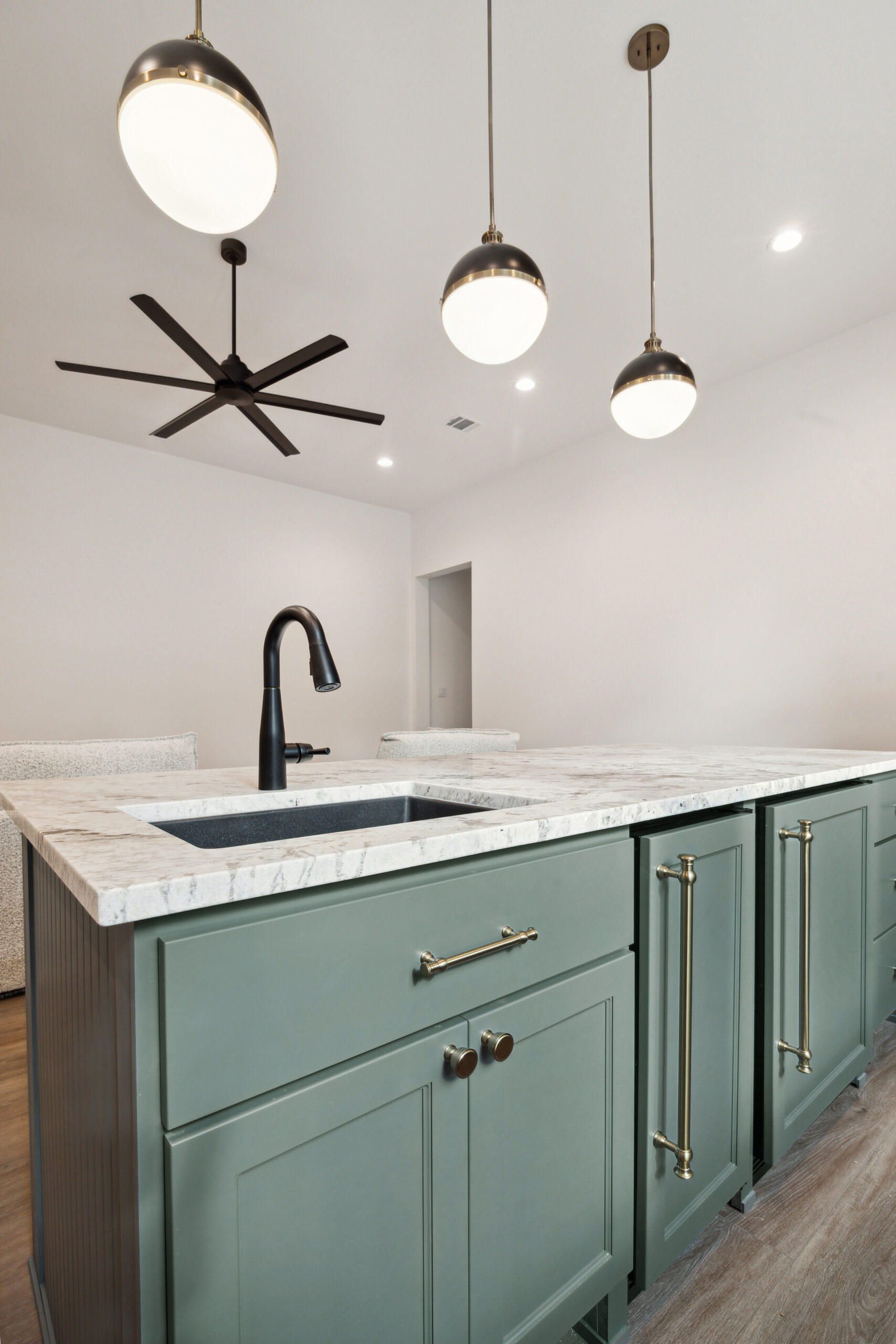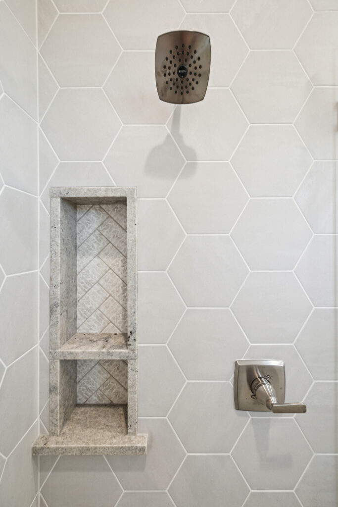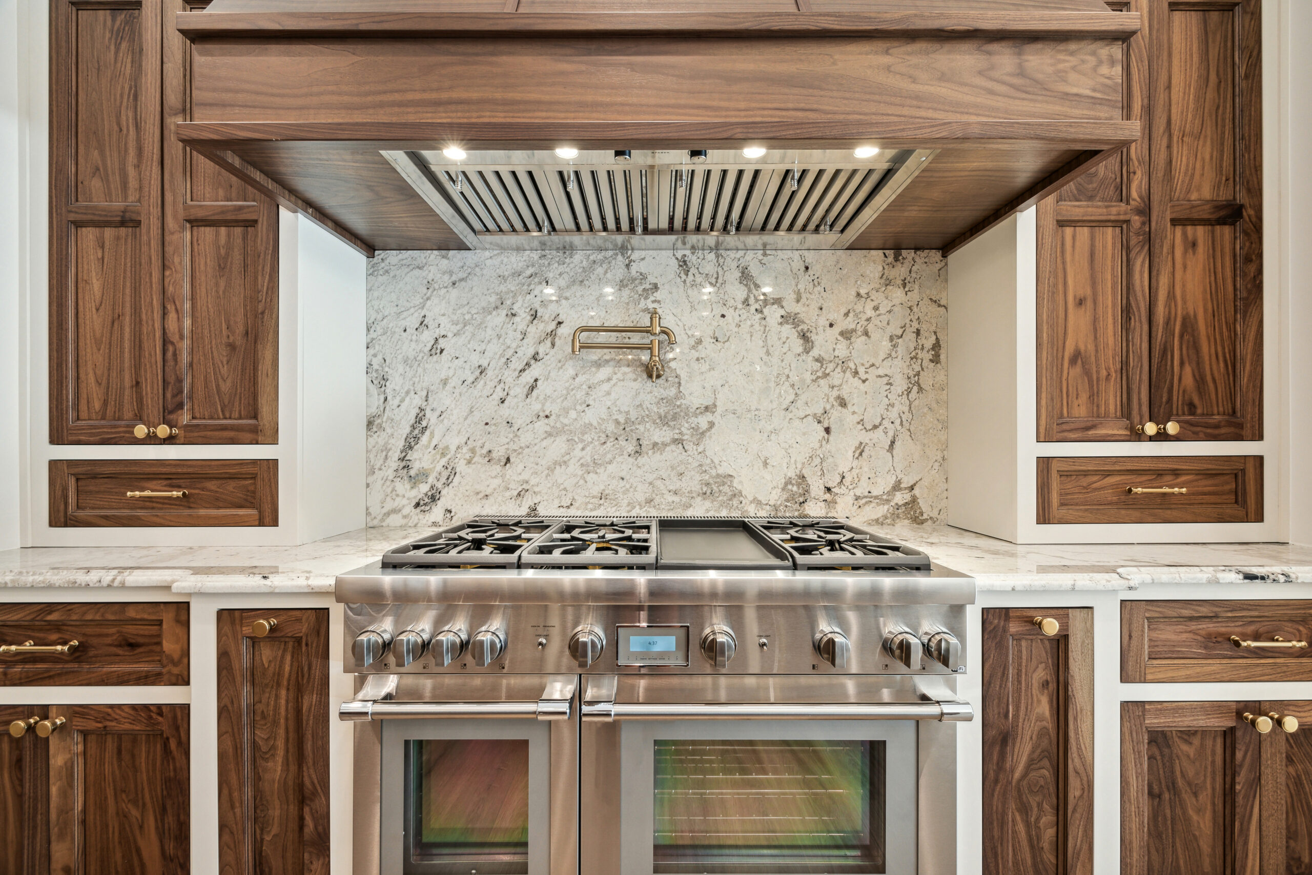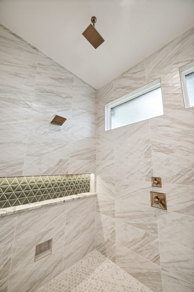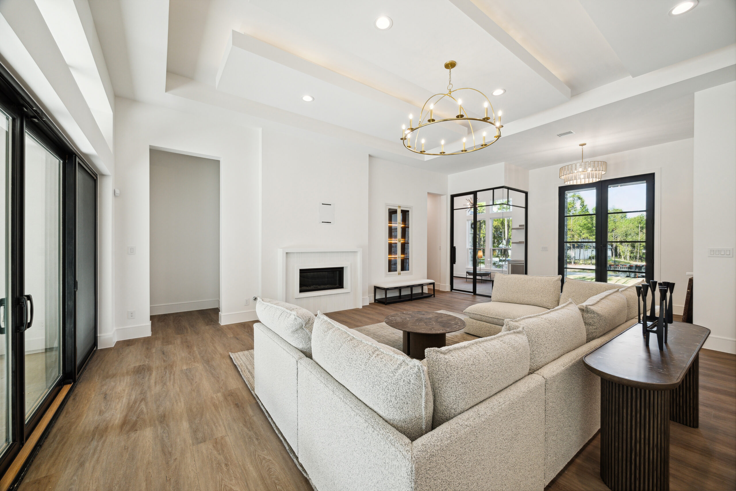 This modern Hill Country home blends clean lines with warm, masculine elements through walnut cabinetry and curated finishes. Accent lighting and refined hardware add depth throughout. The primary bathroom features an island-style vanity with a suspended, illuminated mirror. A sliding glass door and custom wine storage enhance both function and flow.