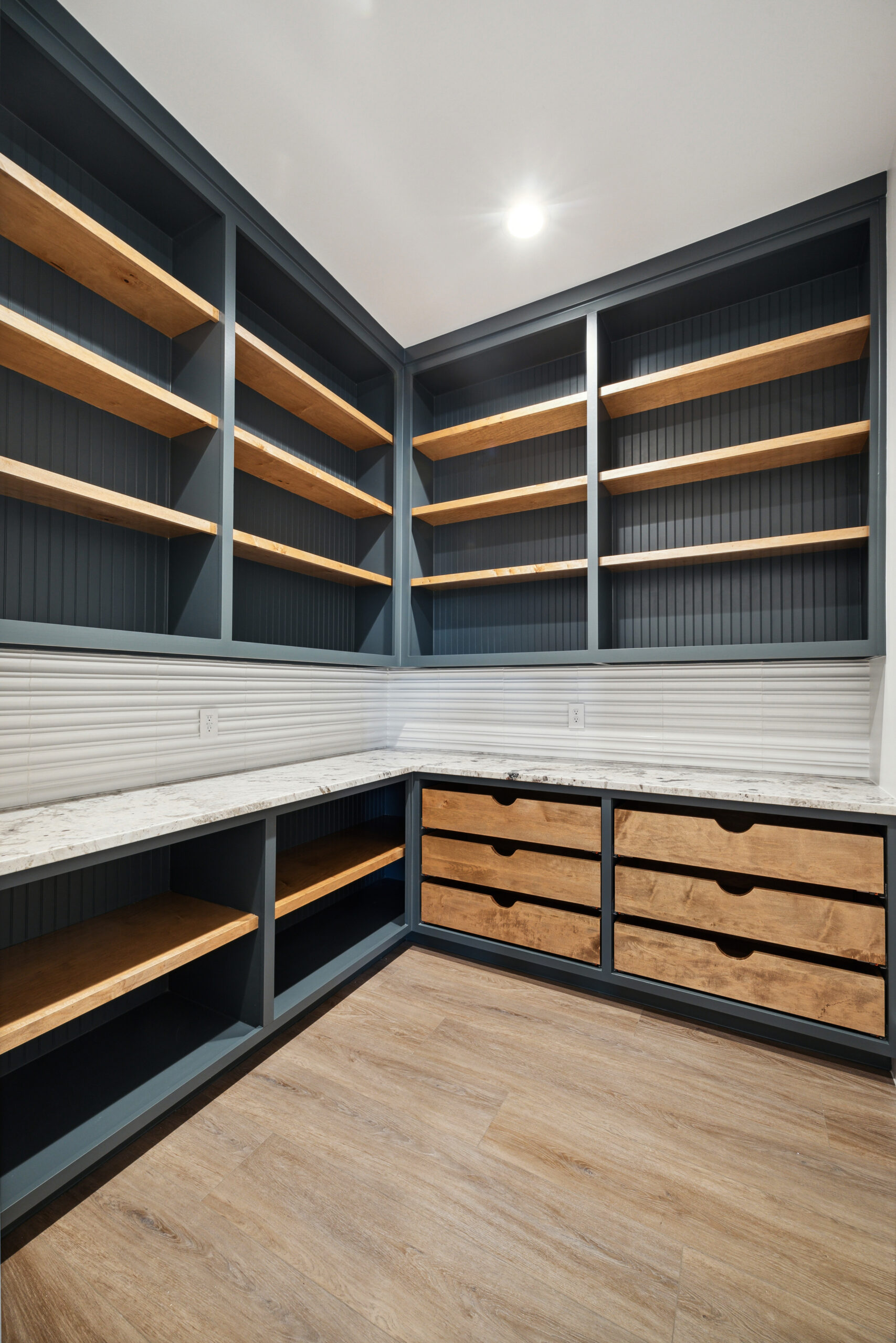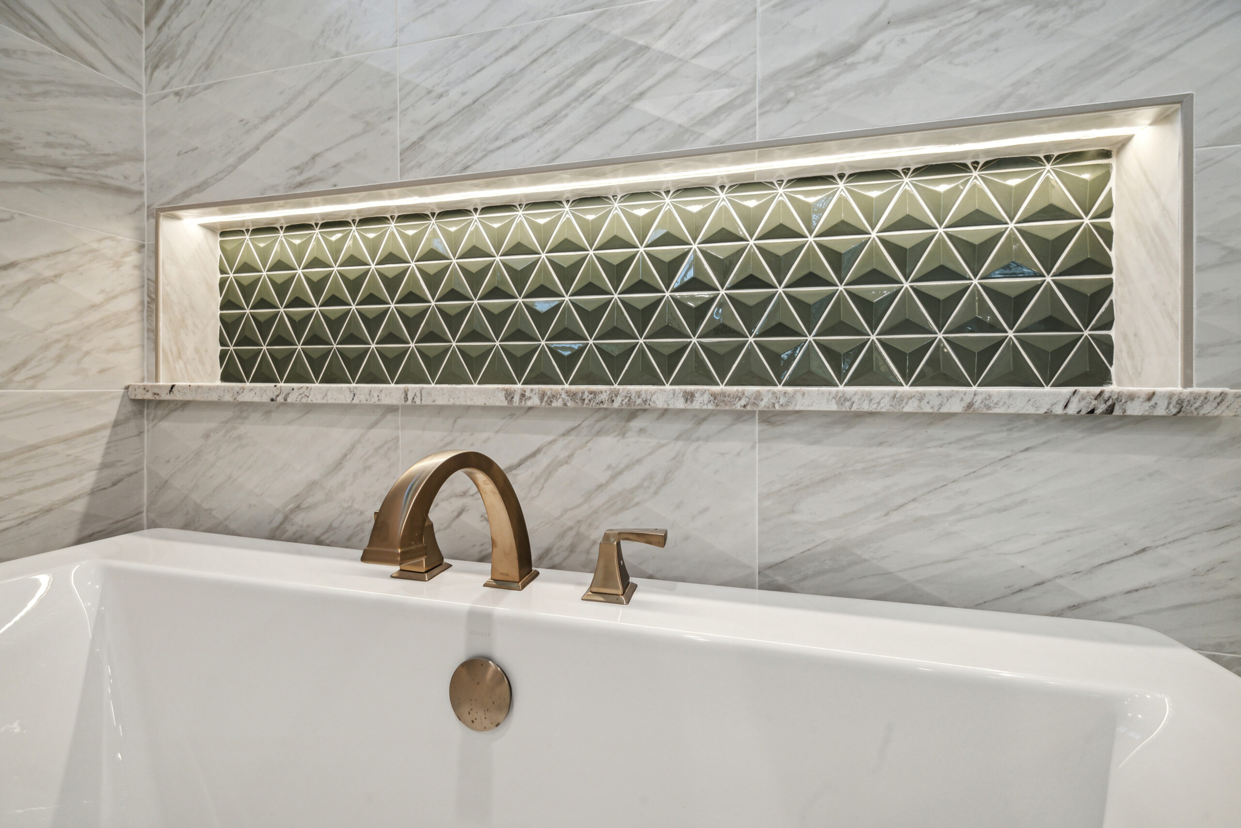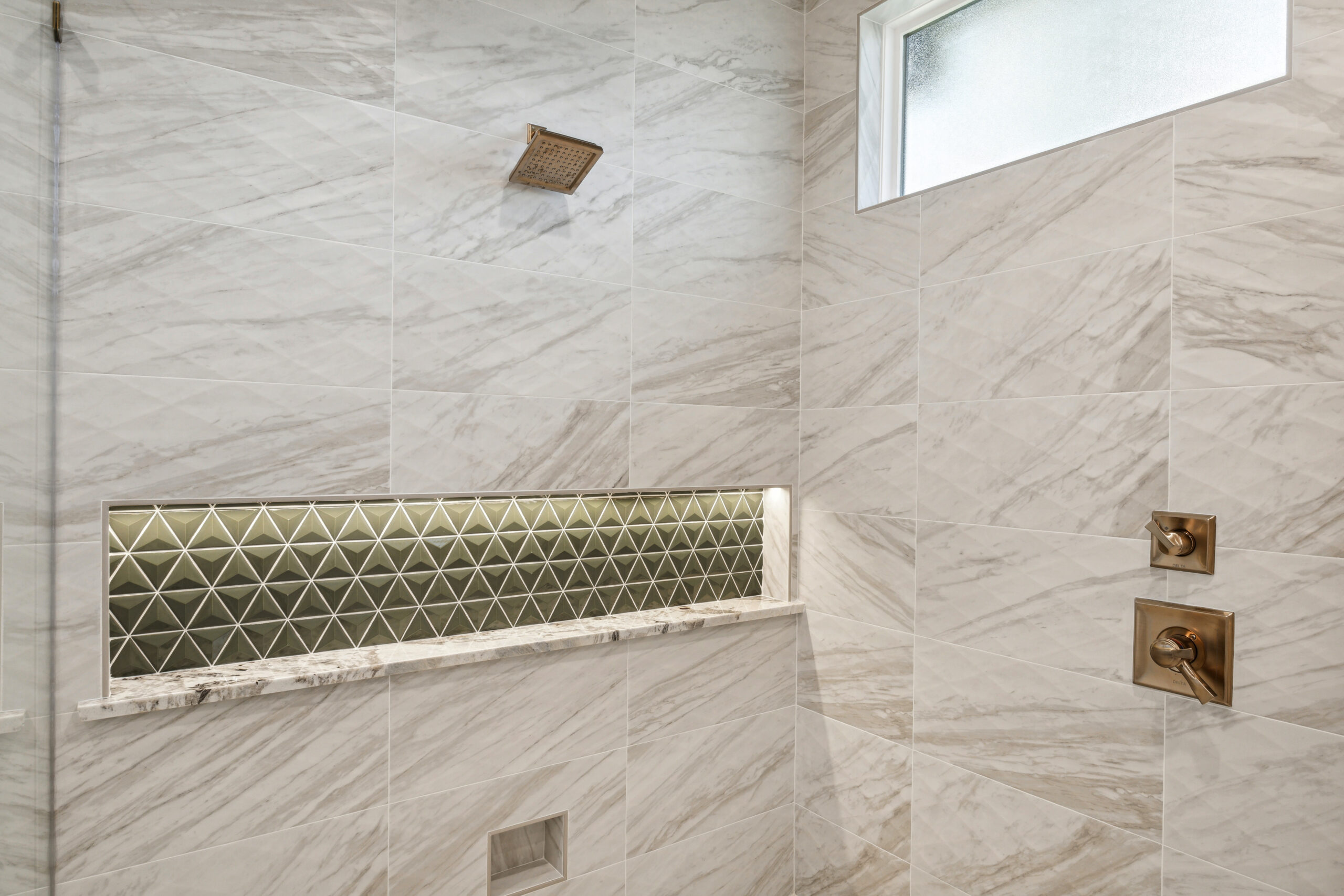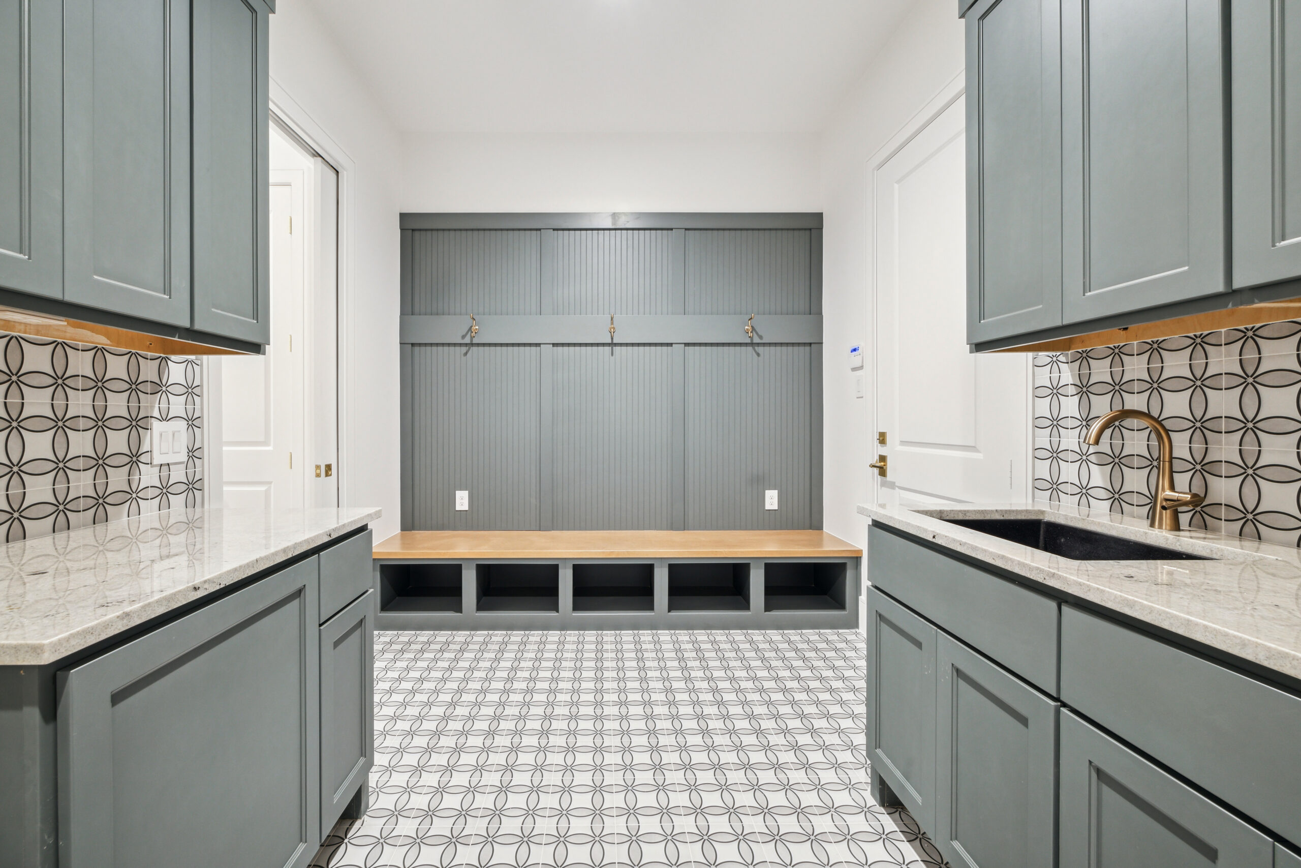 This modern Hill Country home blends clean lines with warm, masculine elements through walnut cabinetry and curated finishes. Accent lighting and refined hardware add depth throughout. The primary bathroom features an island-style vanity with a suspended, illuminated mirror. A sliding glass door and custom wine storage enhance both function and flow.