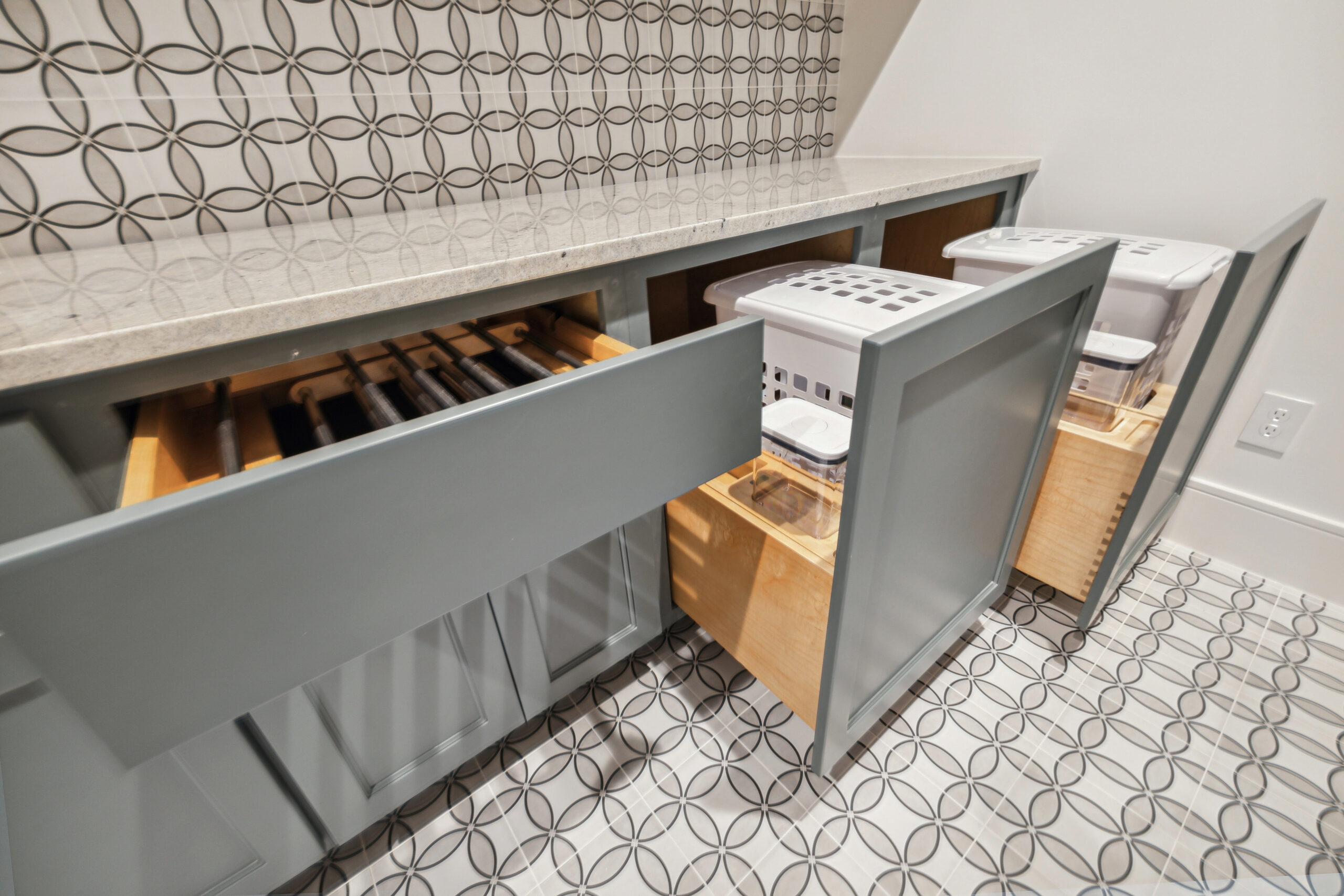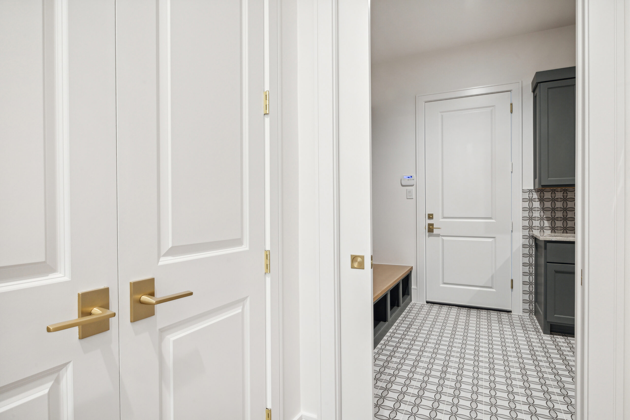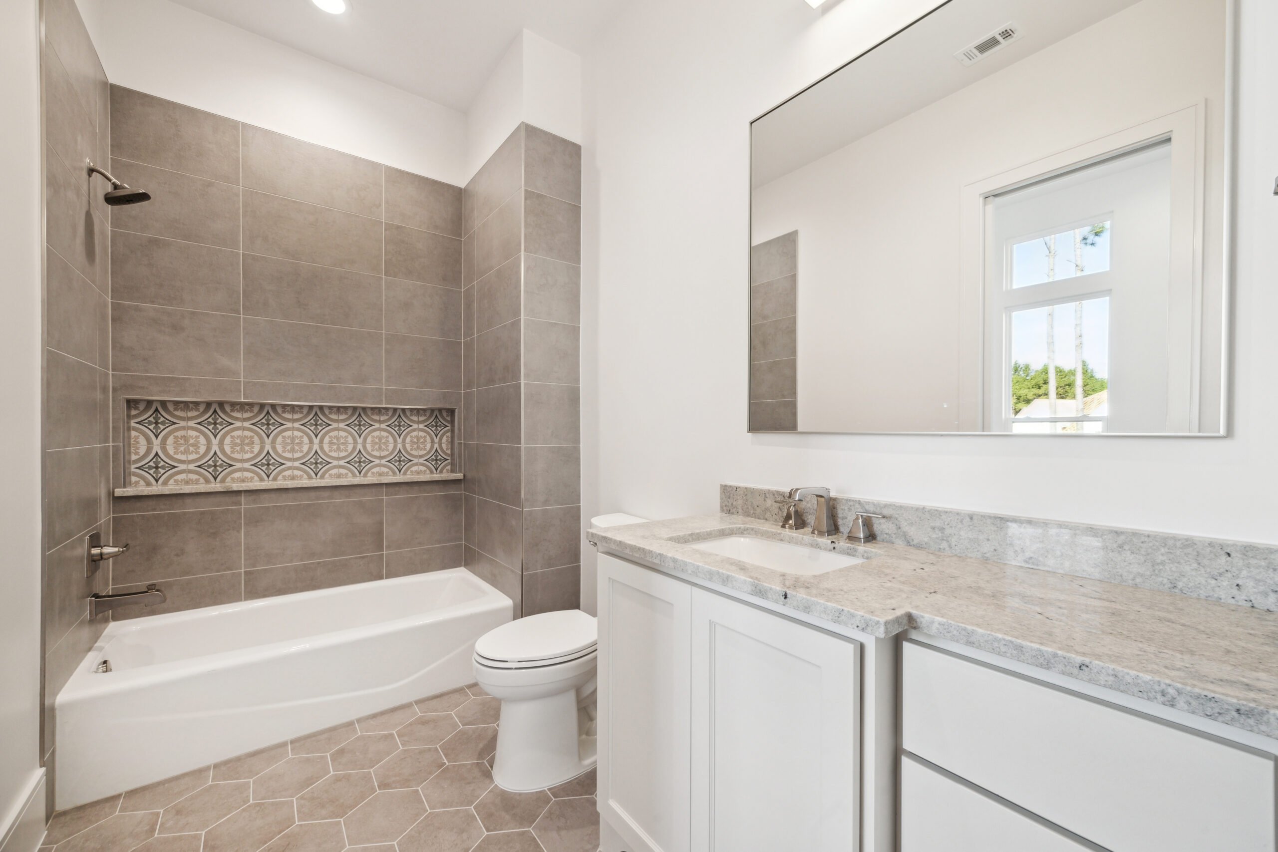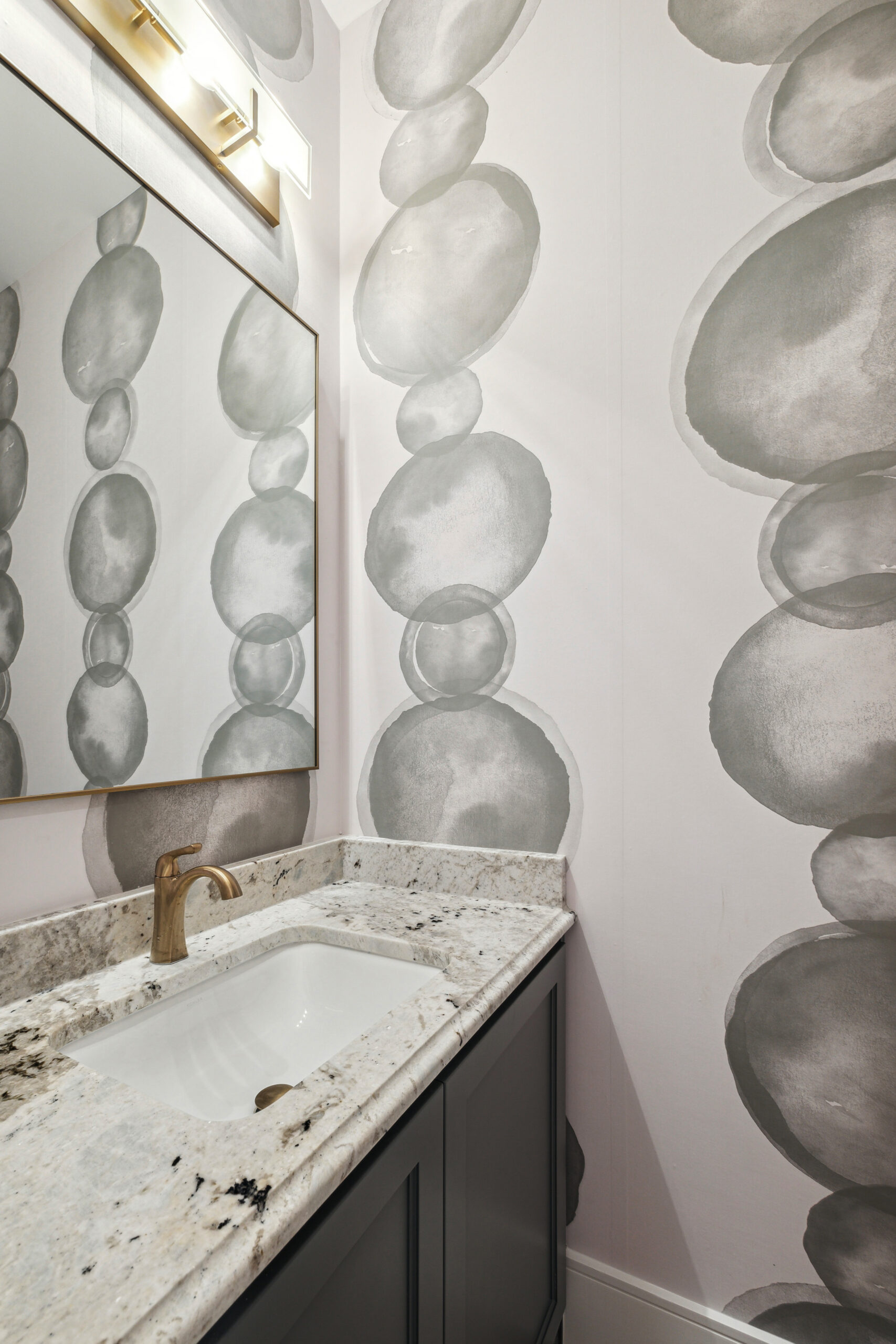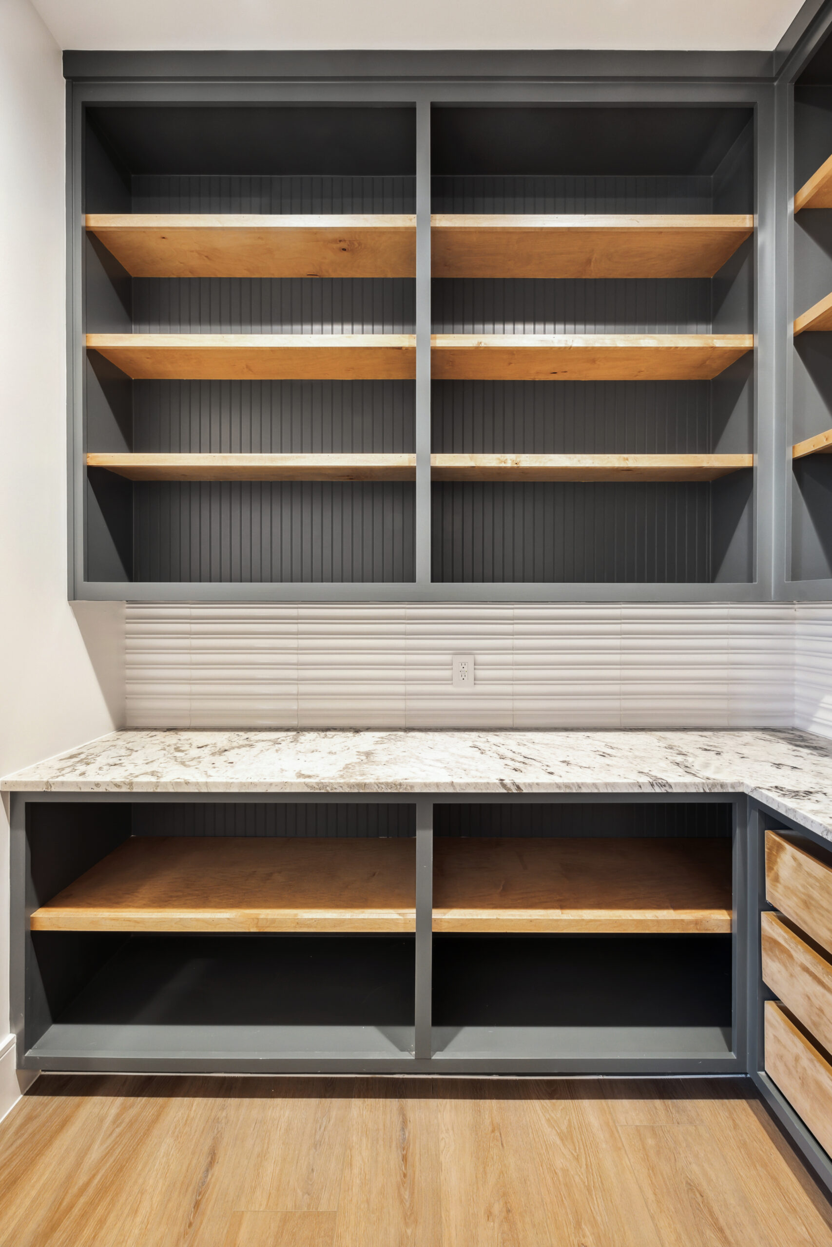 This modern Hill Country home blends clean lines with warm, masculine elements through walnut cabinetry and curated finishes. Accent lighting and refined hardware add depth throughout. The primary bathroom features an island-style vanity with a suspended, illuminated mirror. A sliding glass door and custom wine storage enhance both function and flow.