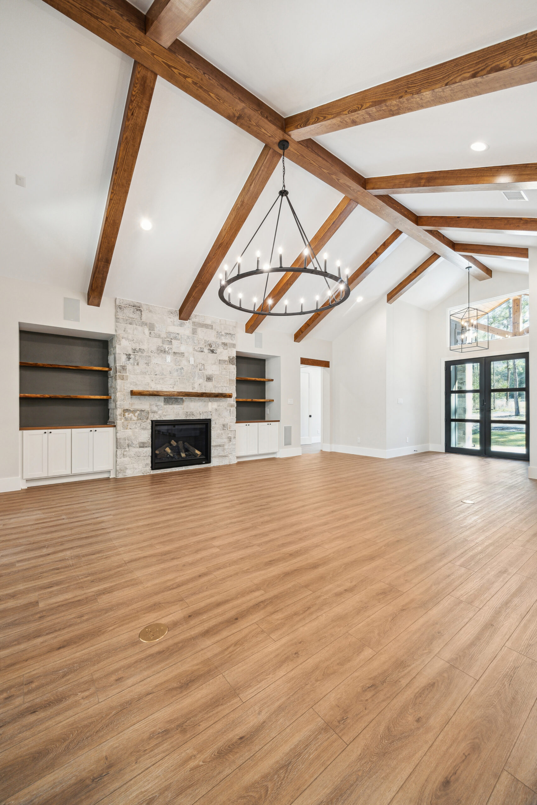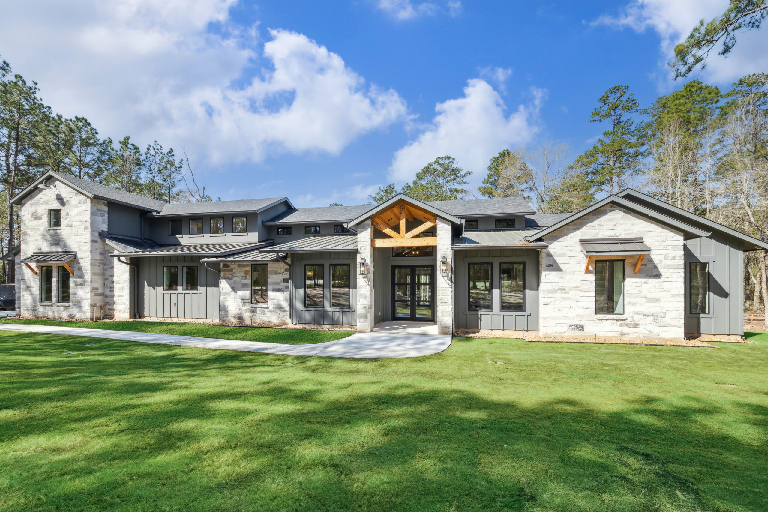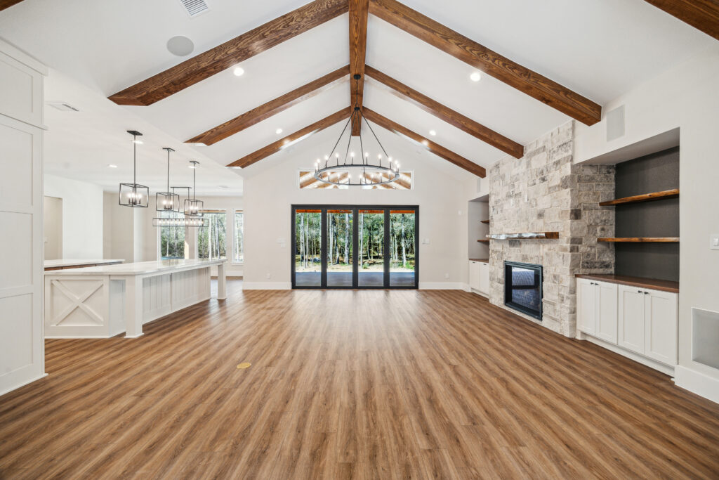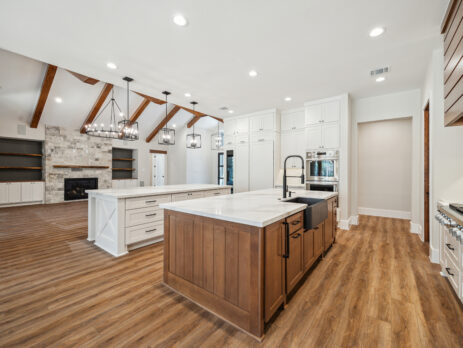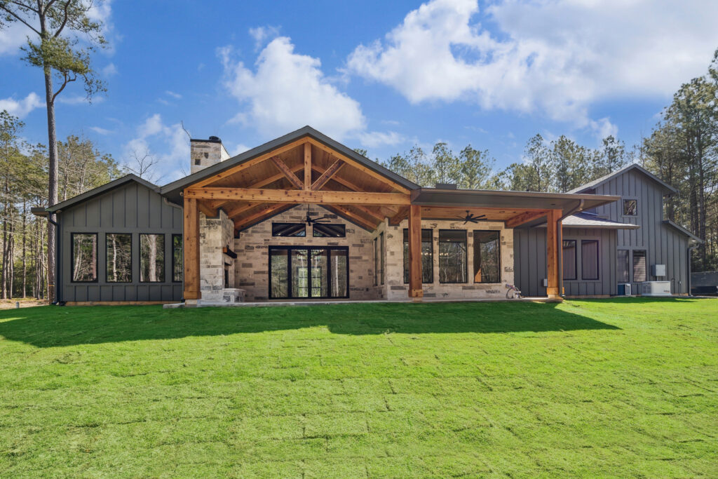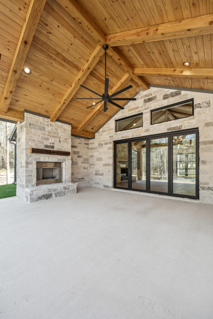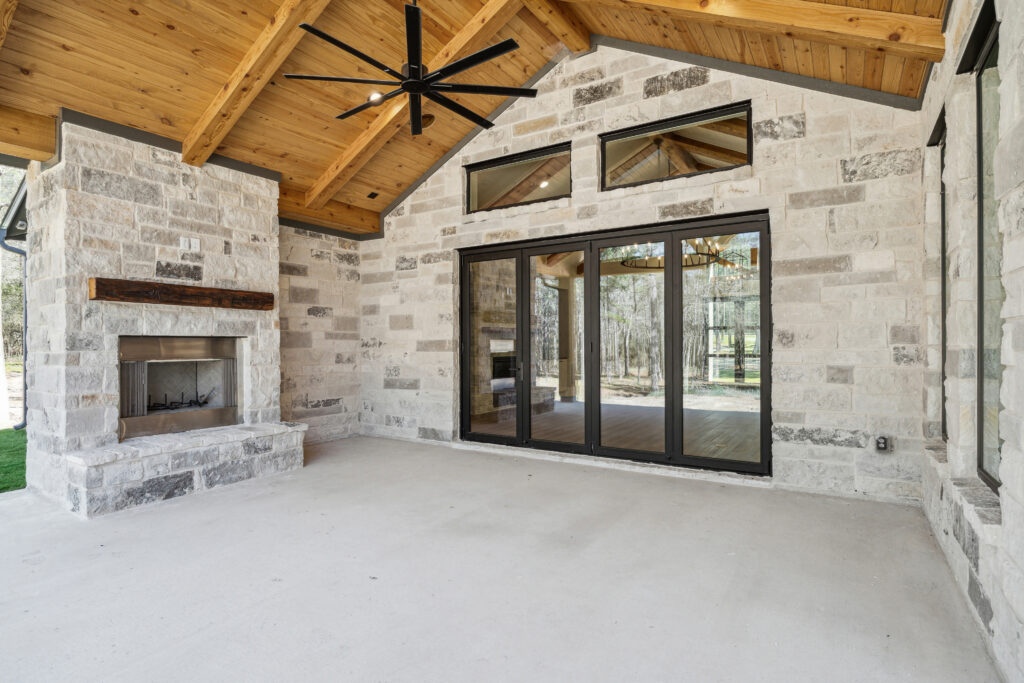 This farmhouse-inspired home was designed as a forever home on acreage, blending board and batten, stone, stucco, and cedar accents. Every detail was thoughtfully planned around everyday living, creating a layout that feels both functional and inviting. Custom cabinetry, wood floors, and a stone fireplace add warmth and character throughout. A sliding door and expansive patio extend the living space outdoors, supporting a seamless indoor-outdoor lifestyle.