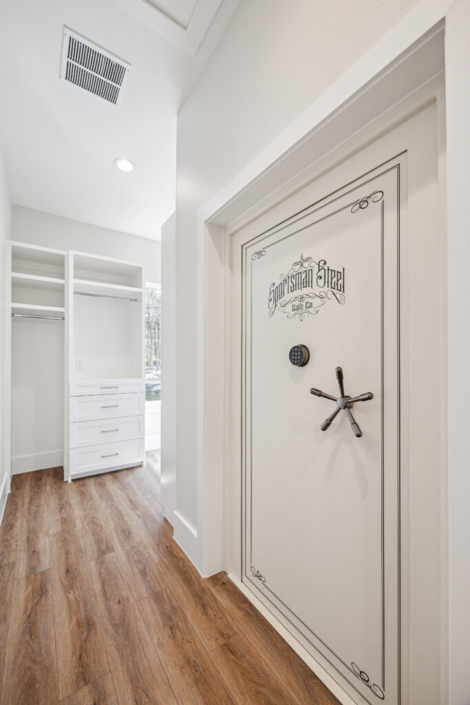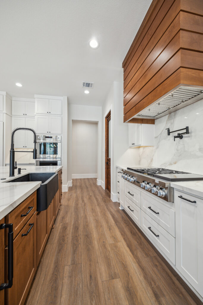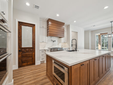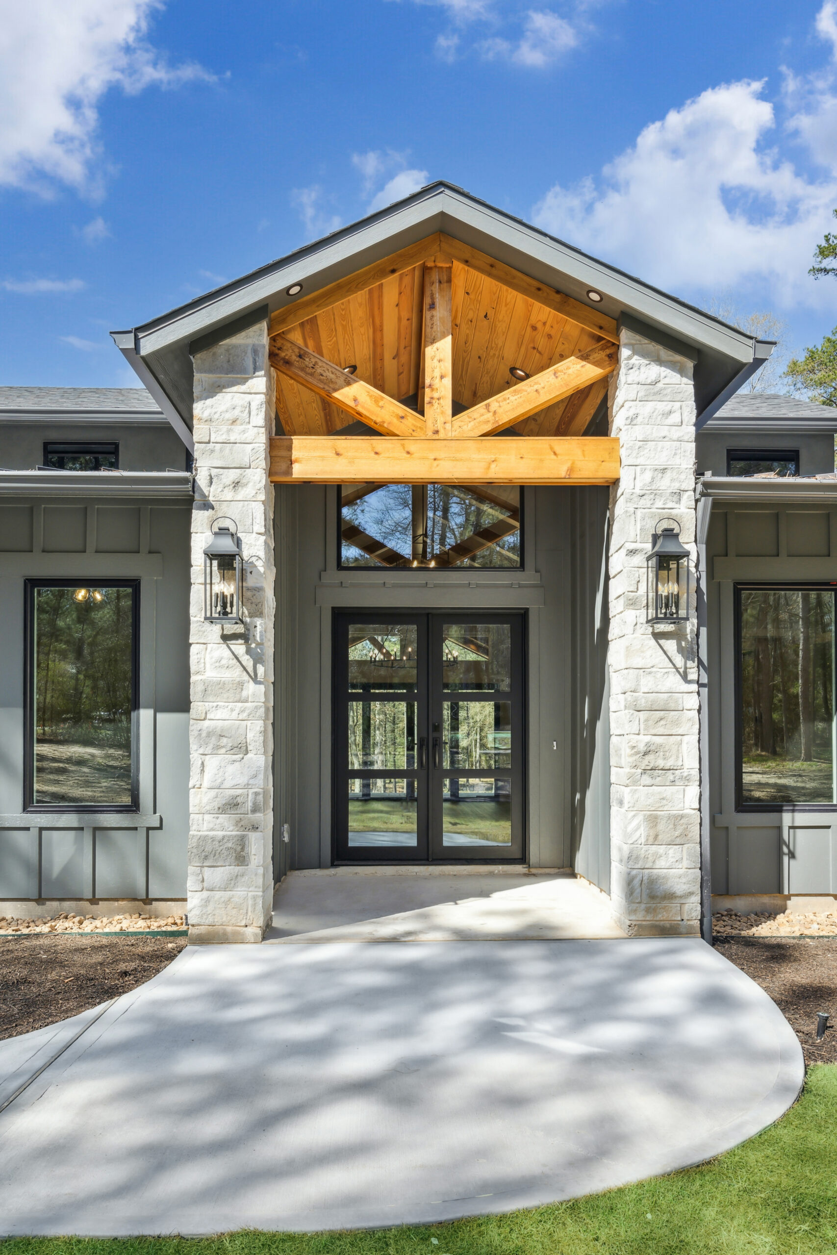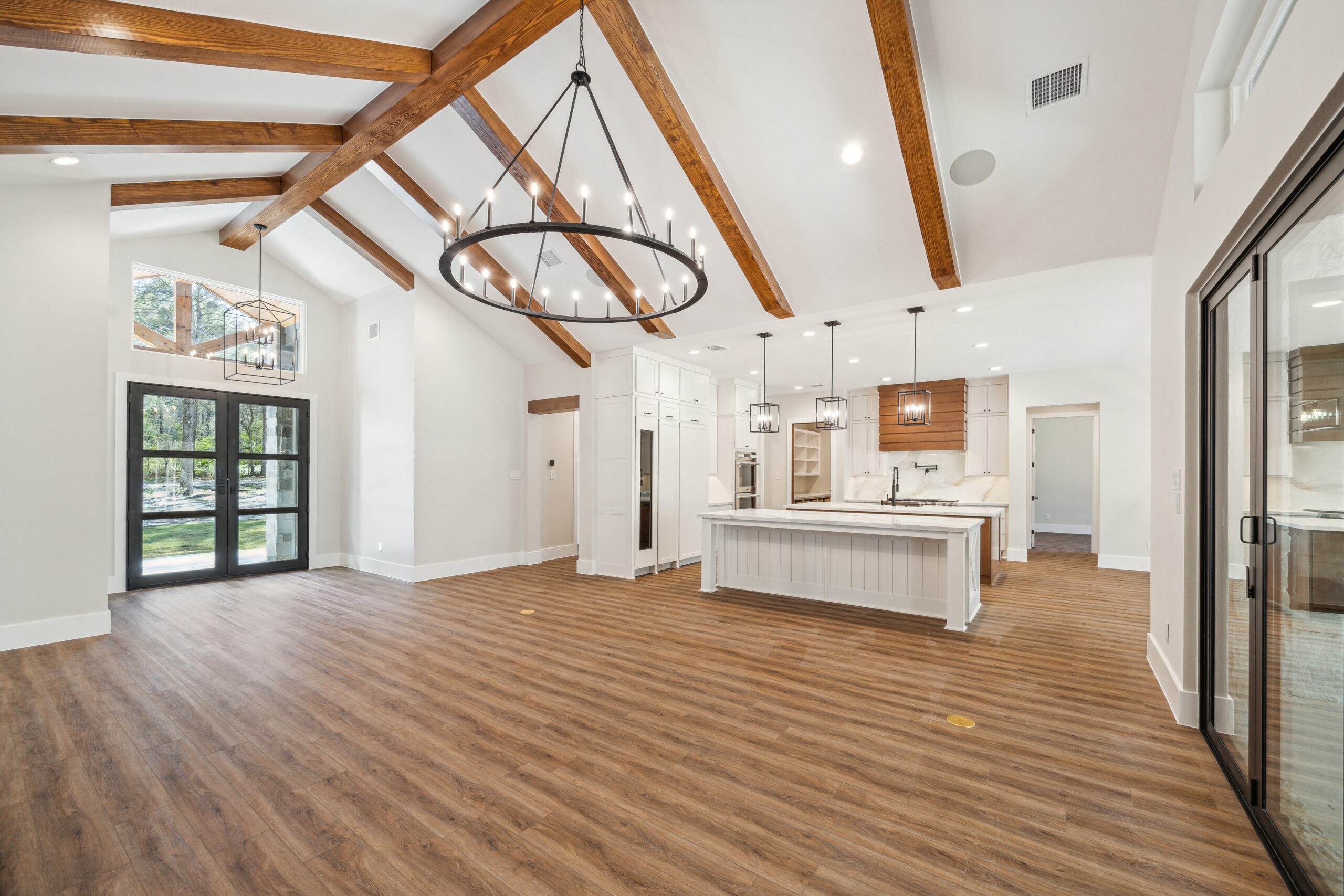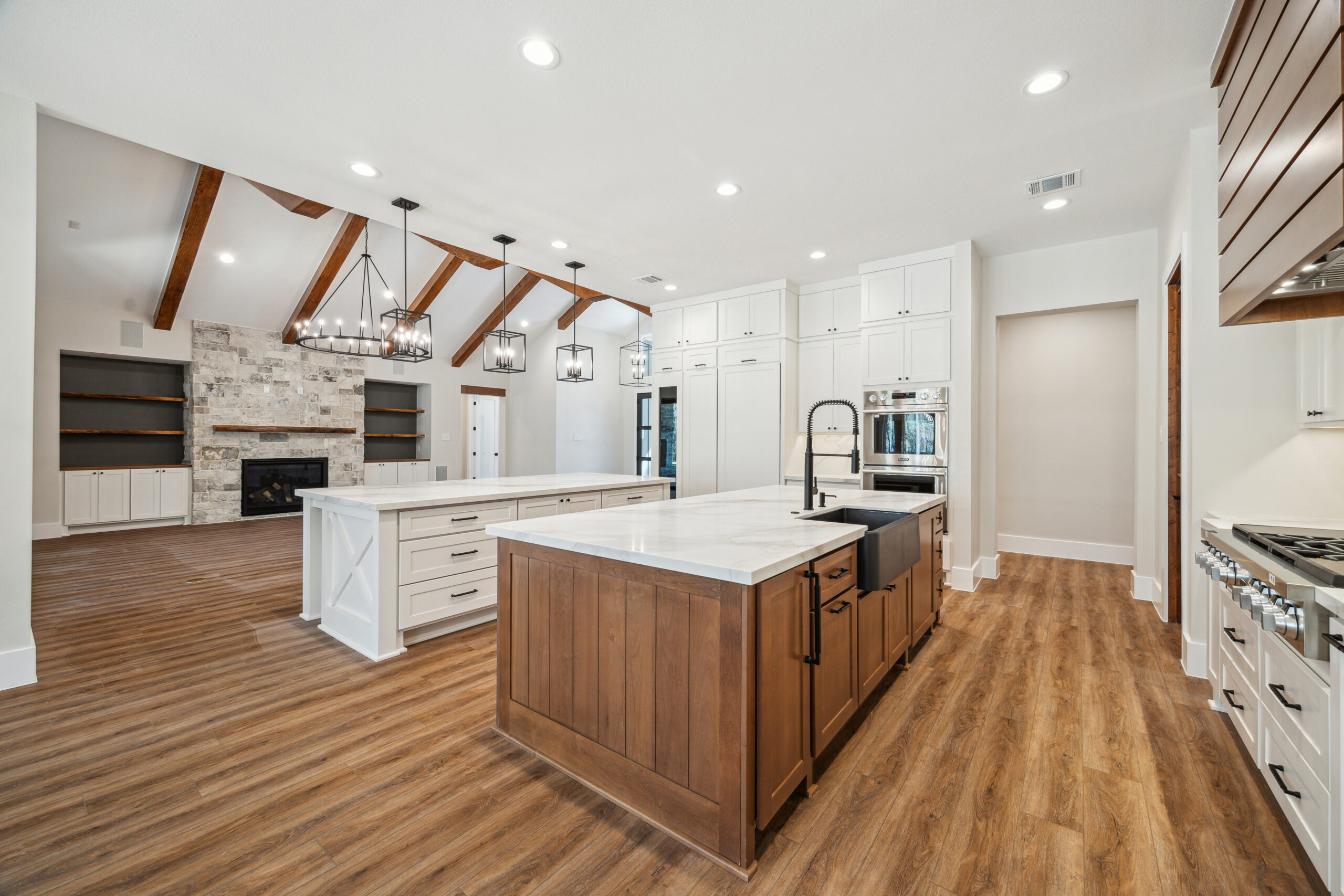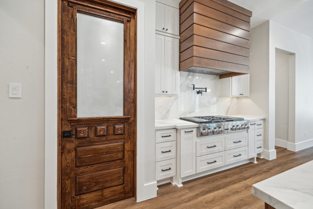 This farmhouse-inspired home was designed as a forever home on acreage, blending board and batten, stone, stucco, and cedar accents. Every detail was thoughtfully planned around everyday living, creating a layout that feels both functional and inviting. Custom cabinetry, wood floors, and a stone fireplace add warmth and character throughout. A sliding door and expansive patio extend the living space outdoors, supporting a seamless indoor-outdoor lifestyle.