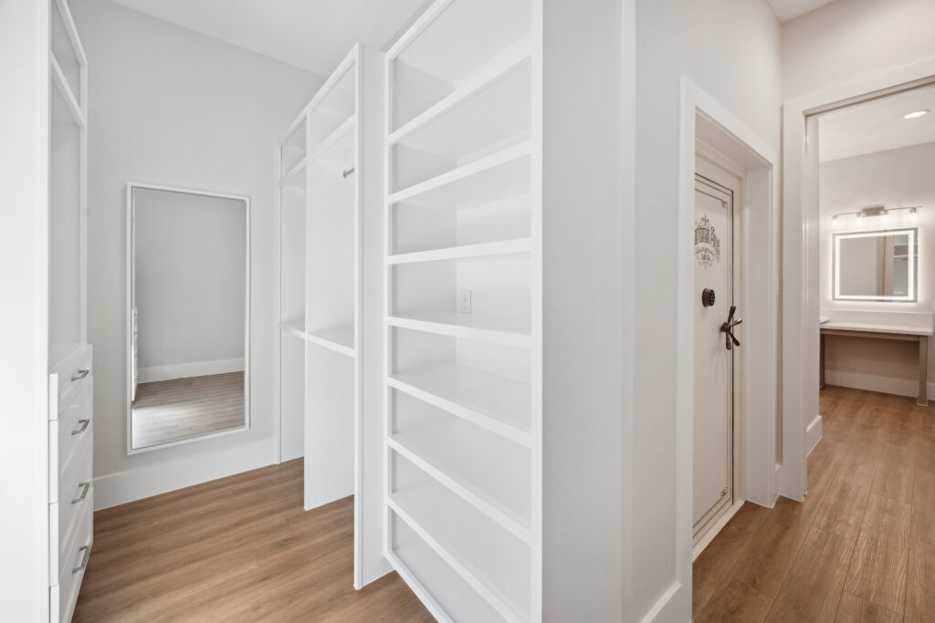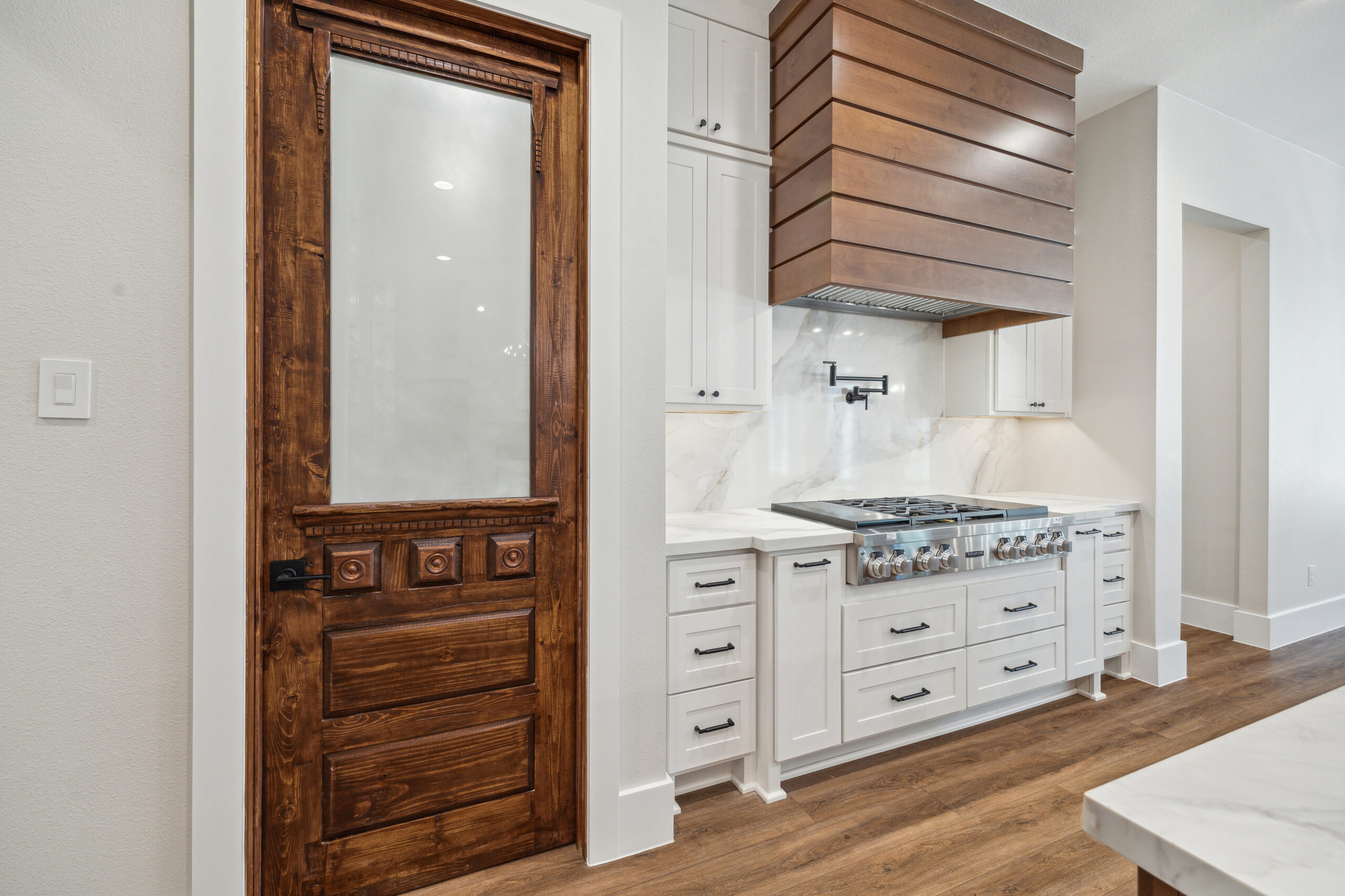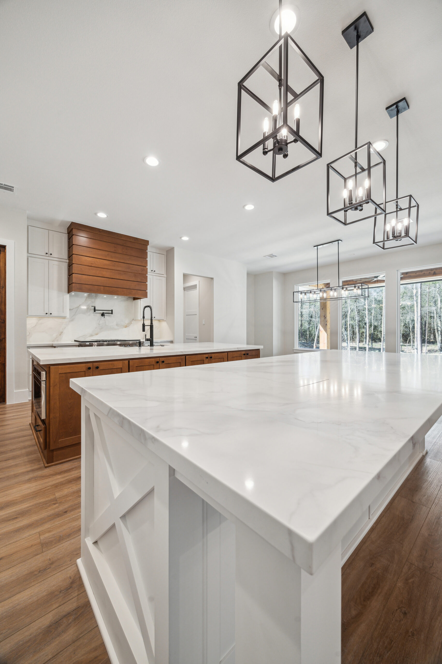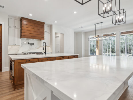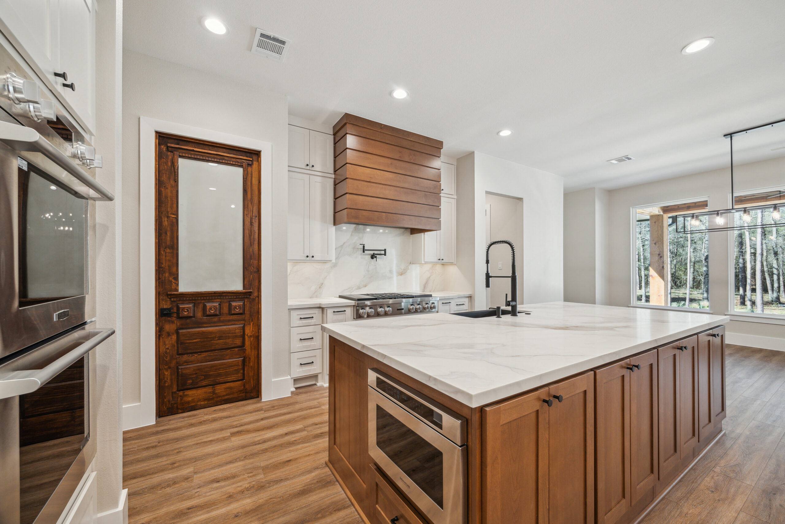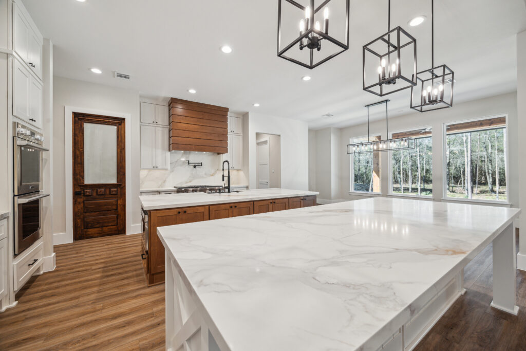 This farmhouse-inspired home was designed as a forever home on acreage, blending board and batten, stone, stucco, and cedar accents. Every detail was thoughtfully planned around everyday living, creating a layout that feels both functional and inviting. Custom cabinetry, wood floors, and a stone fireplace add warmth and character throughout. A sliding door and expansive patio extend the living space outdoors, supporting a seamless indoor-outdoor lifestyle.
