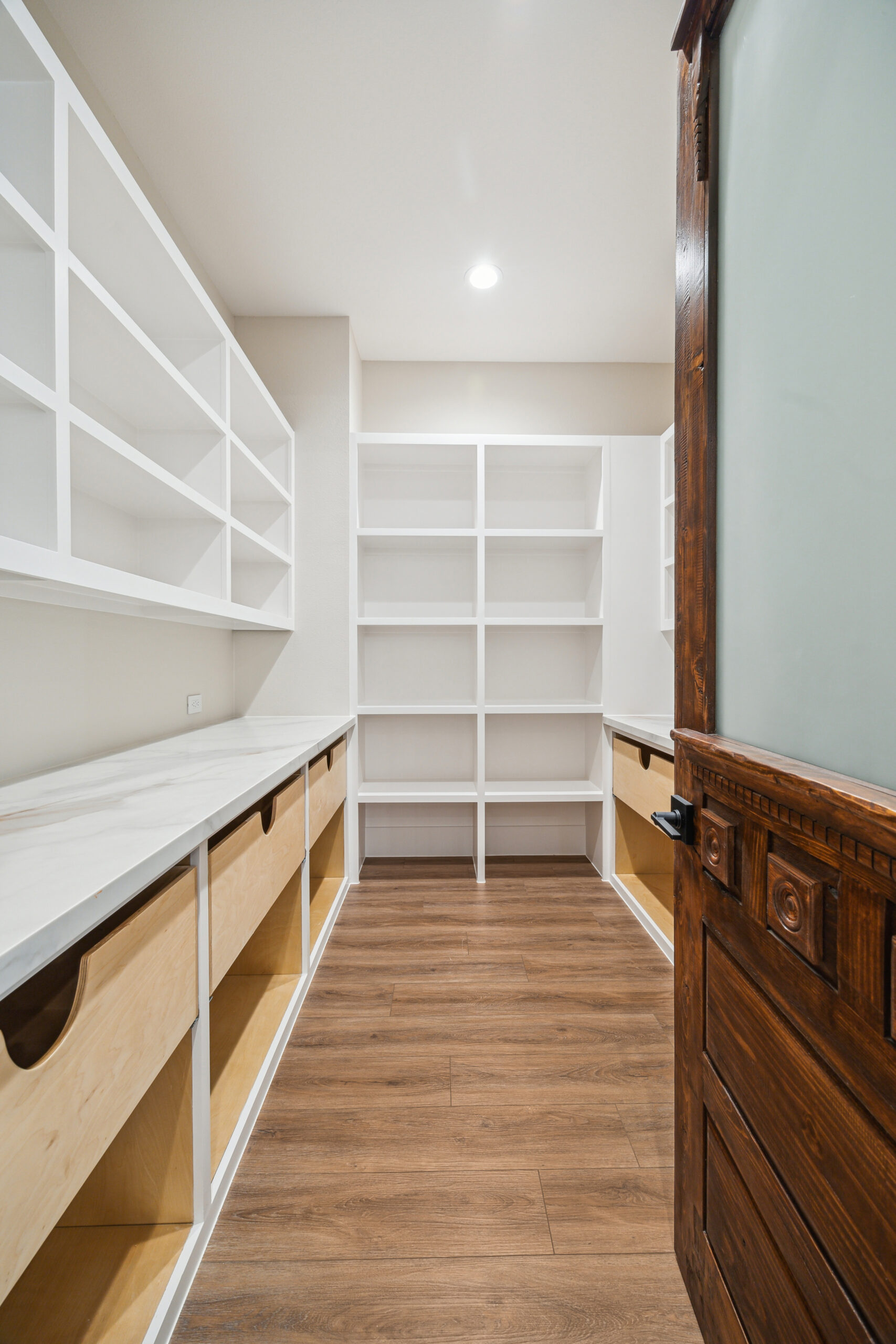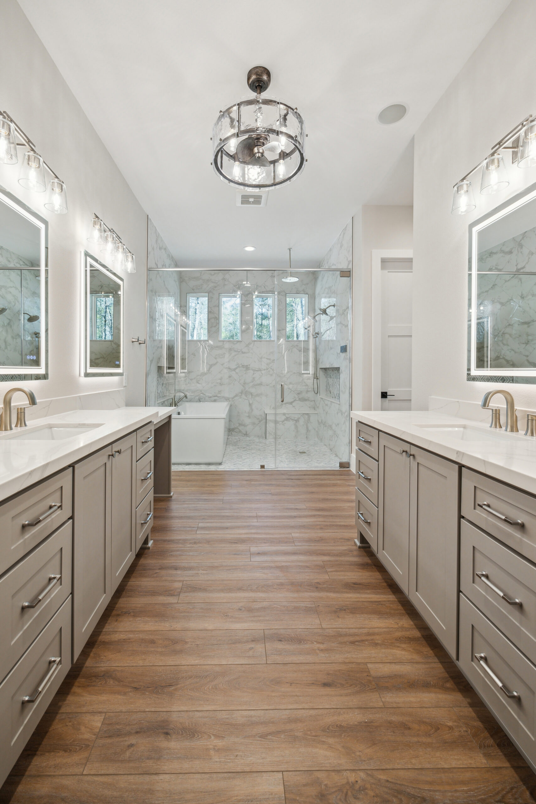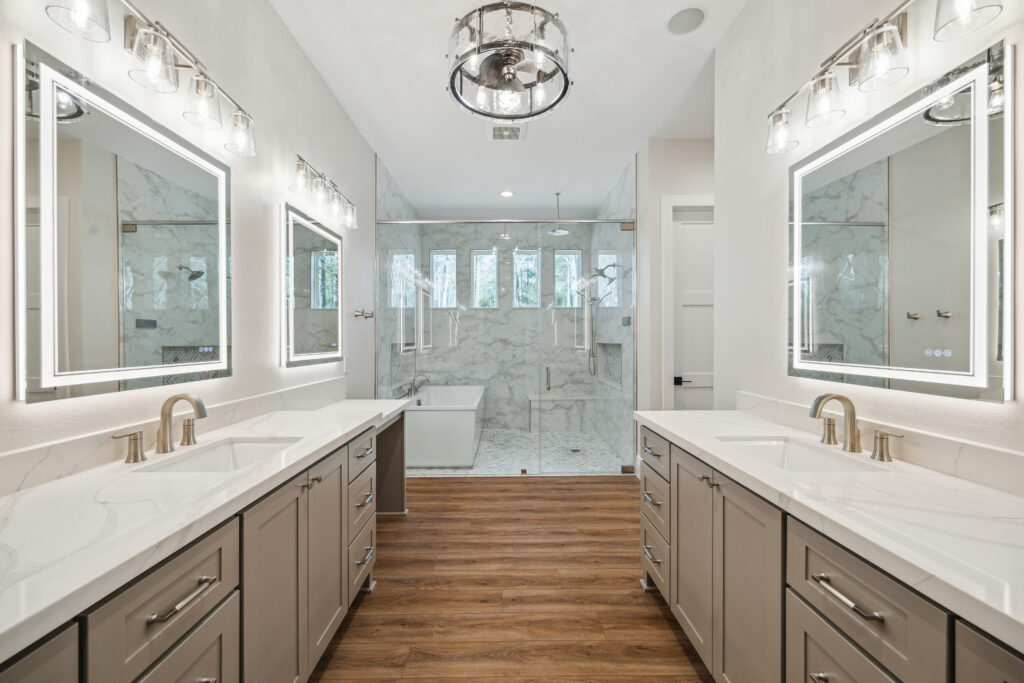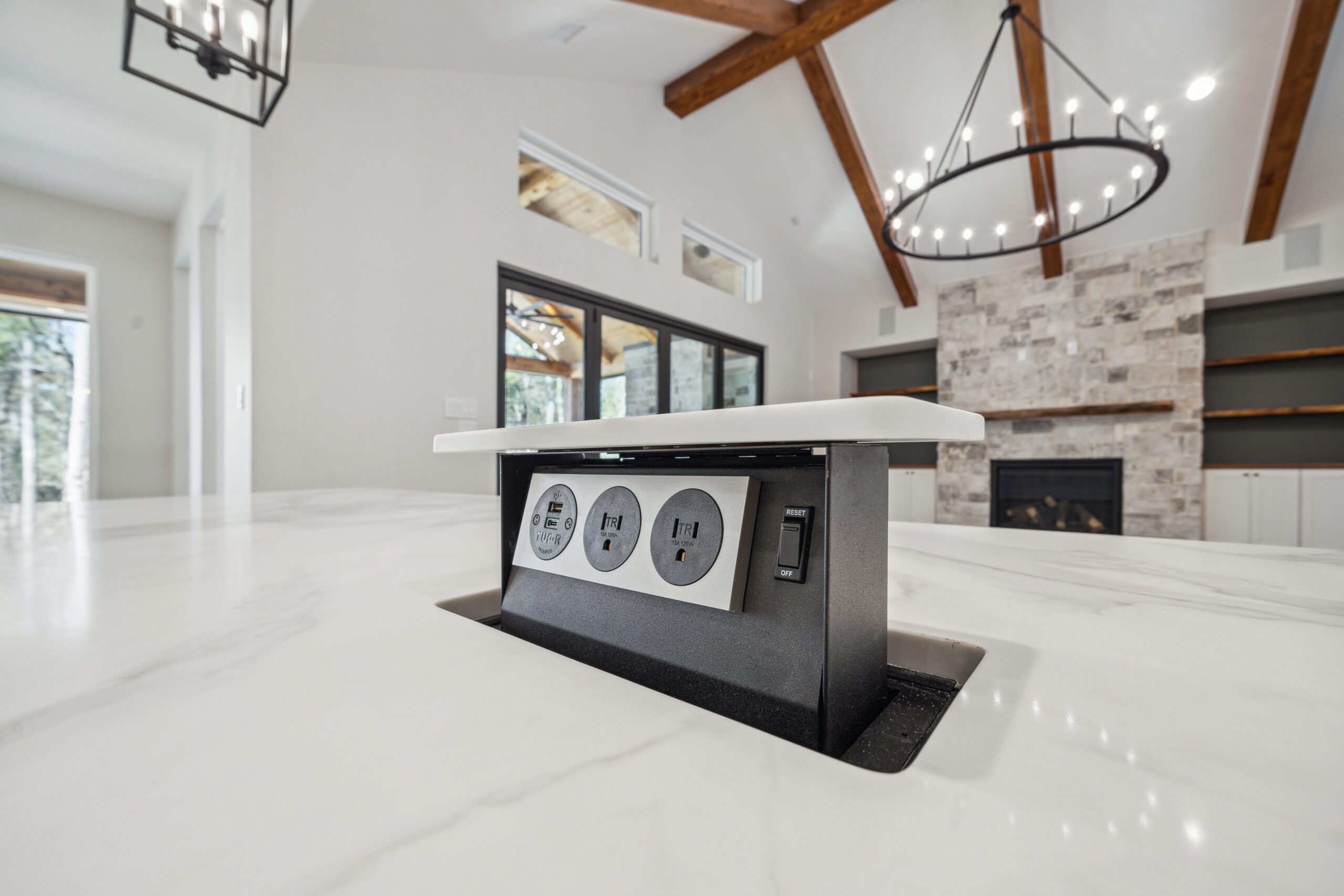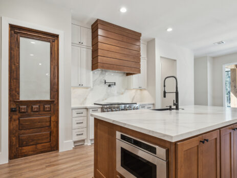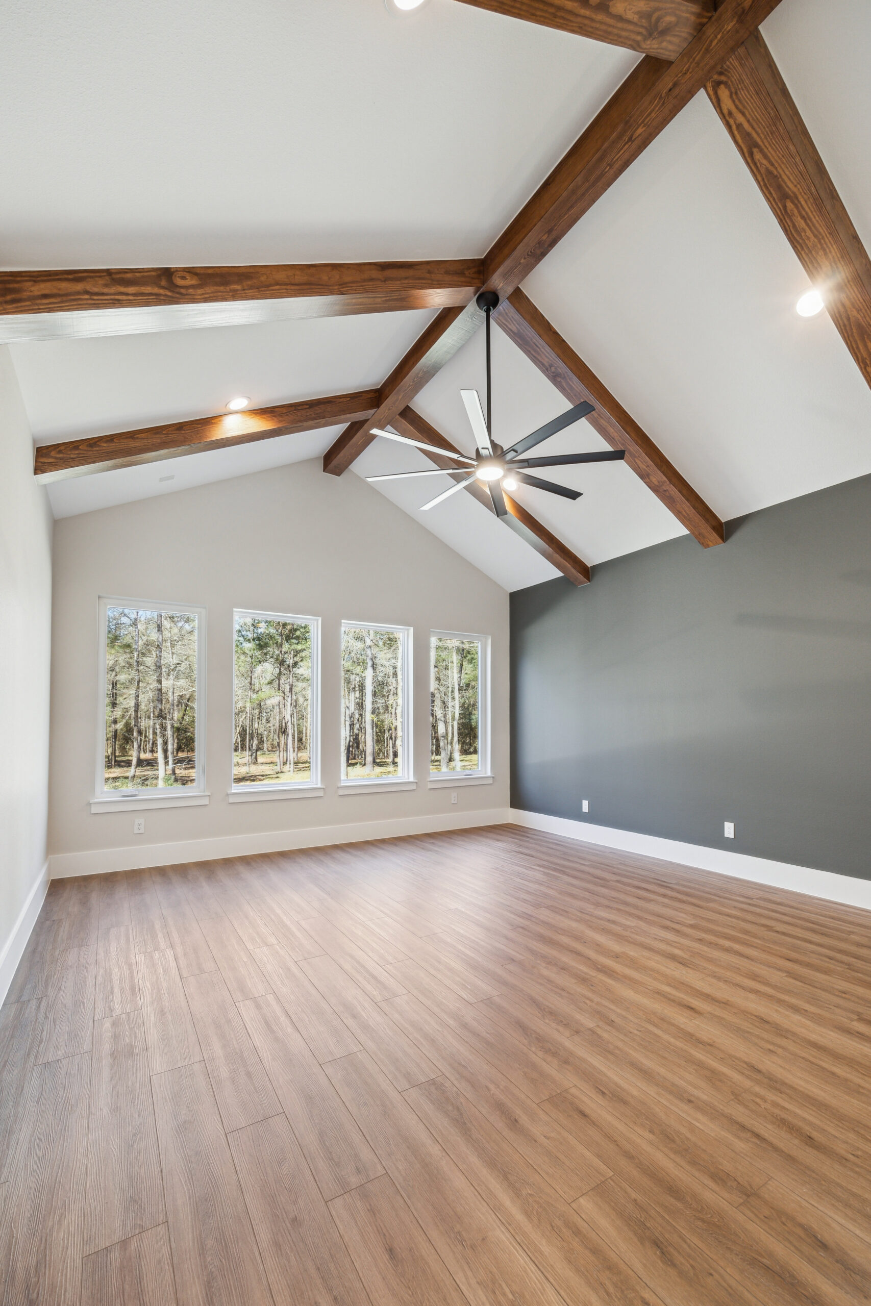 This farmhouse-inspired home was designed as a forever home on acreage, blending board and batten, stone, stucco, and cedar accents. Every detail was thoughtfully planned around everyday living, creating a layout that feels both functional and inviting. Custom cabinetry, wood floors, and a stone fireplace add warmth and character throughout. A sliding door and expansive patio extend the living space outdoors, supporting a seamless indoor-outdoor lifestyle.