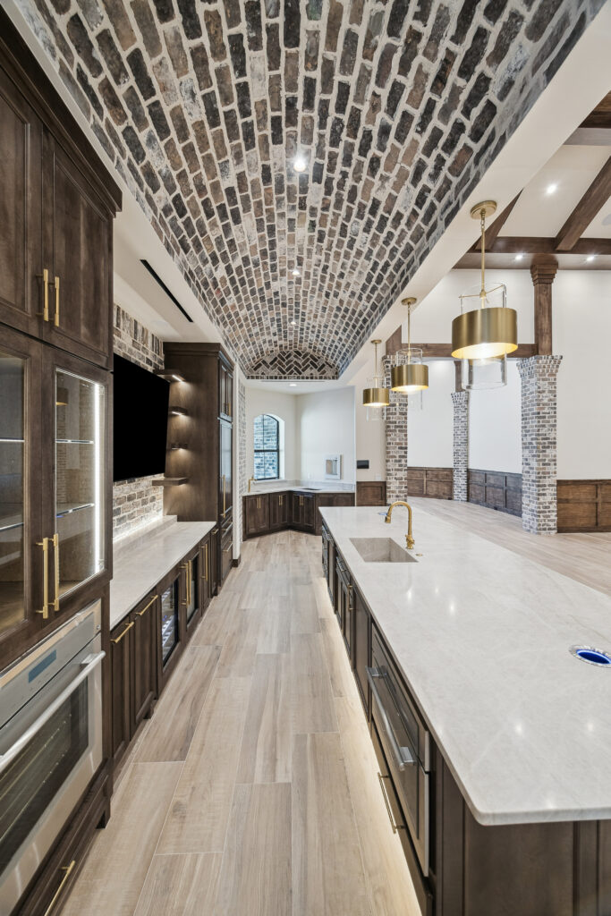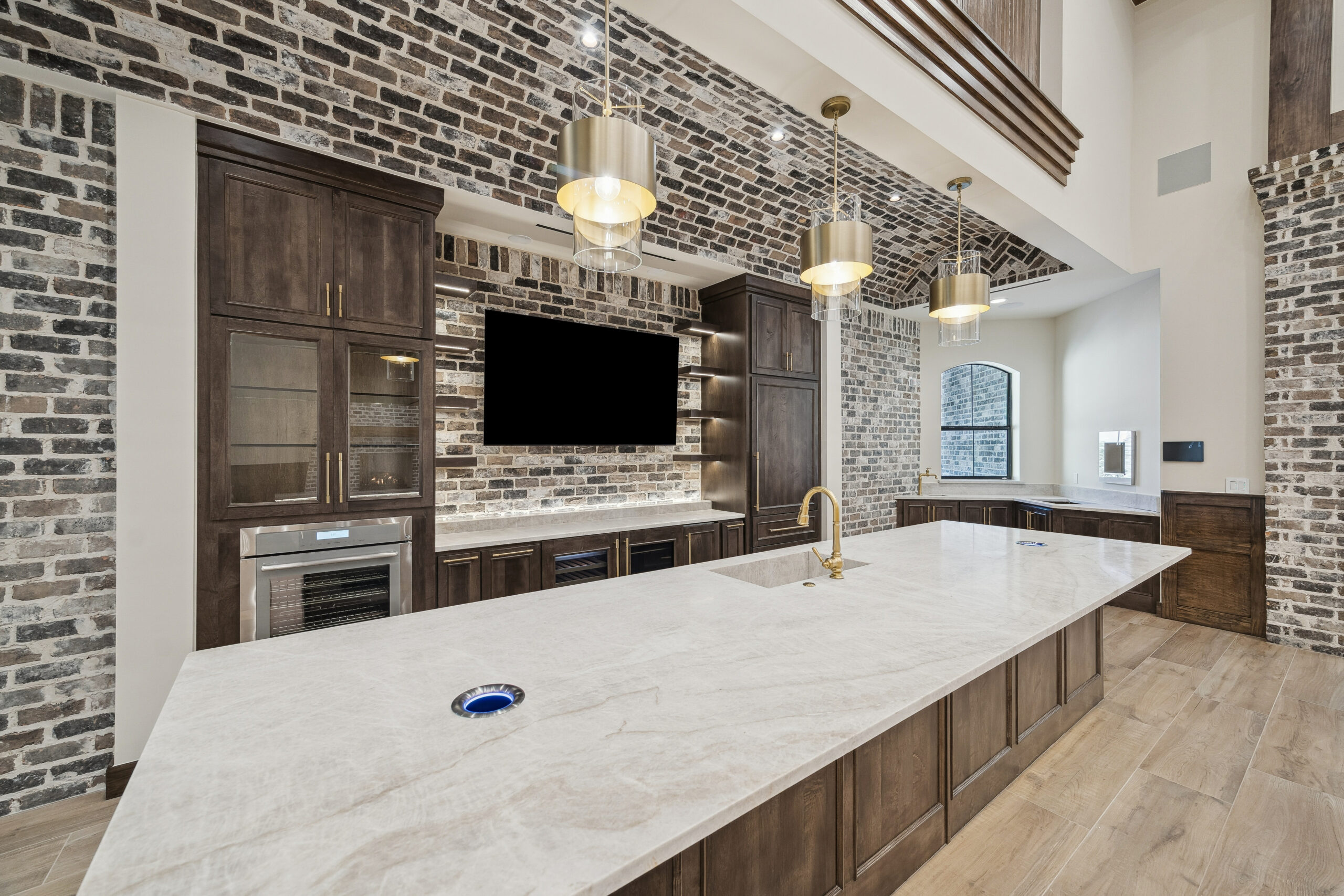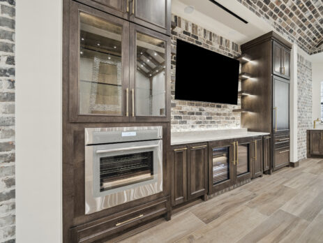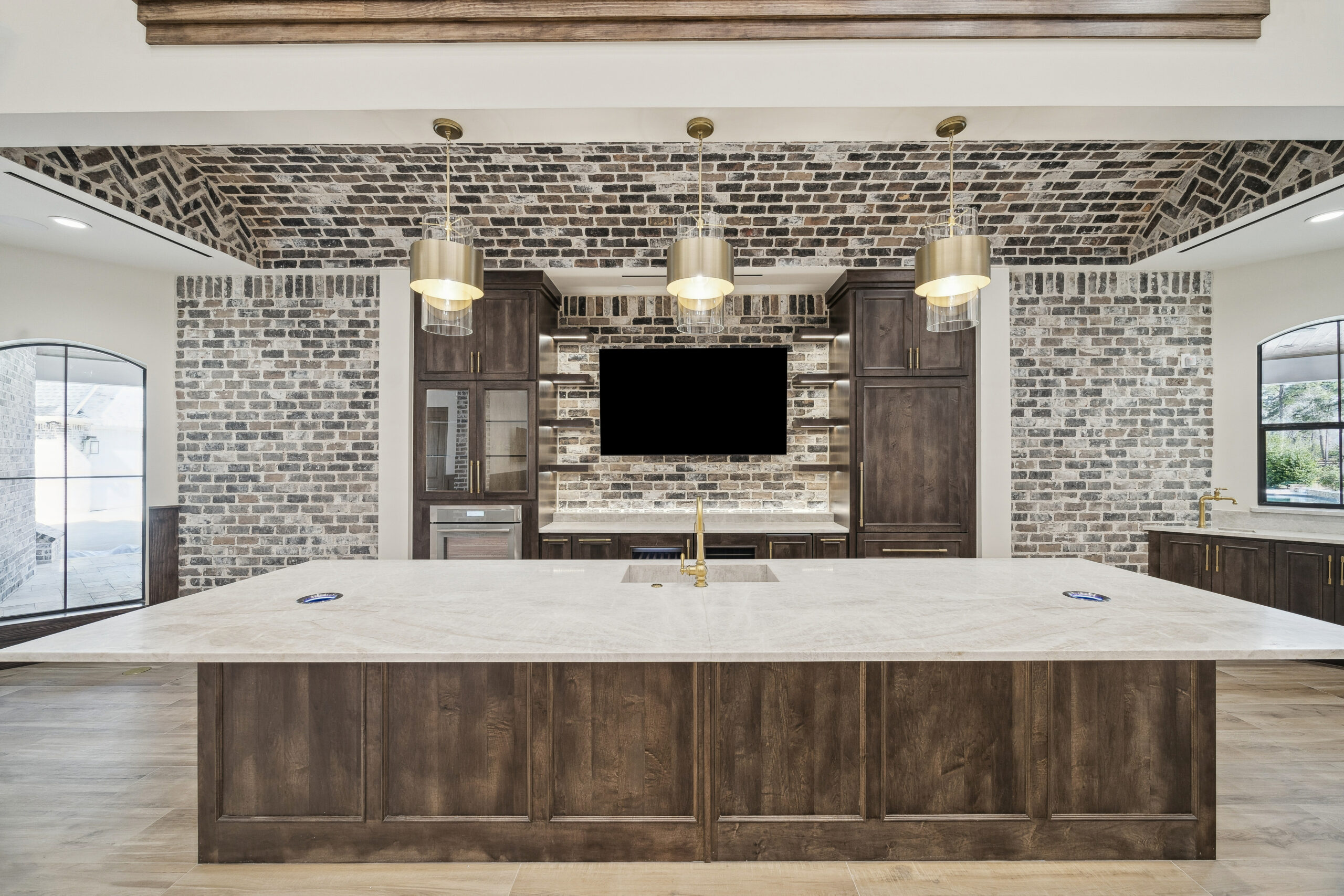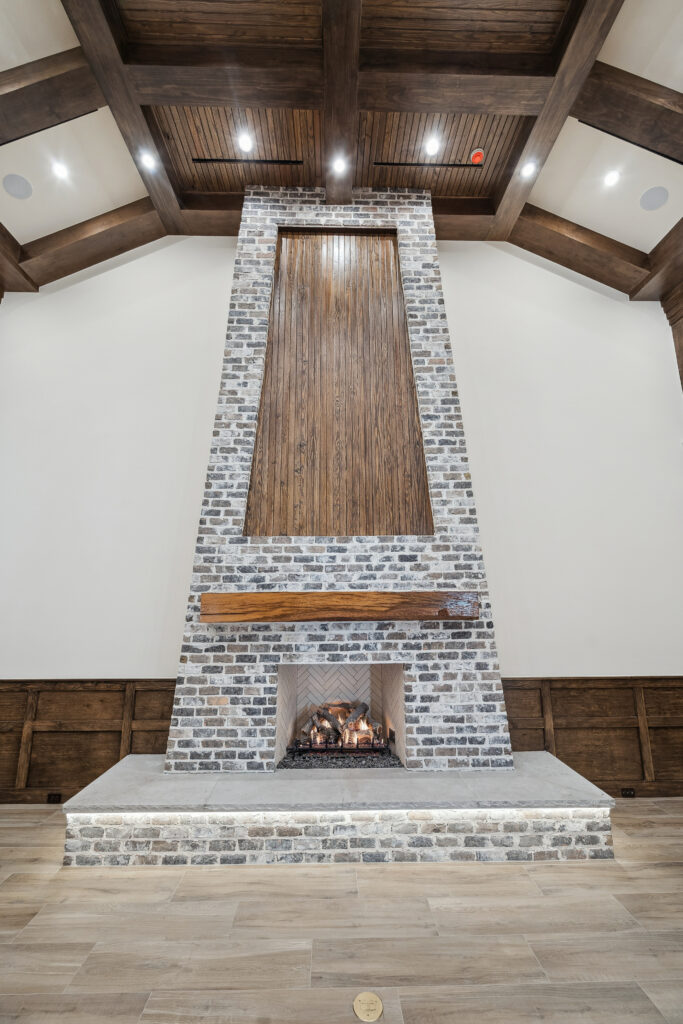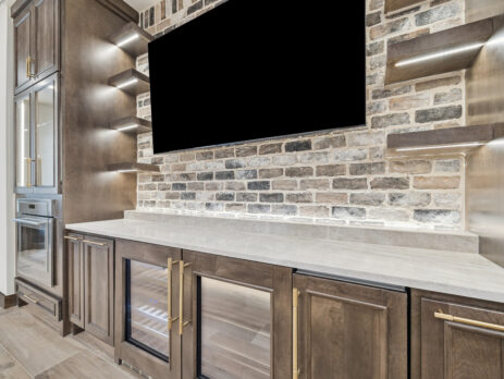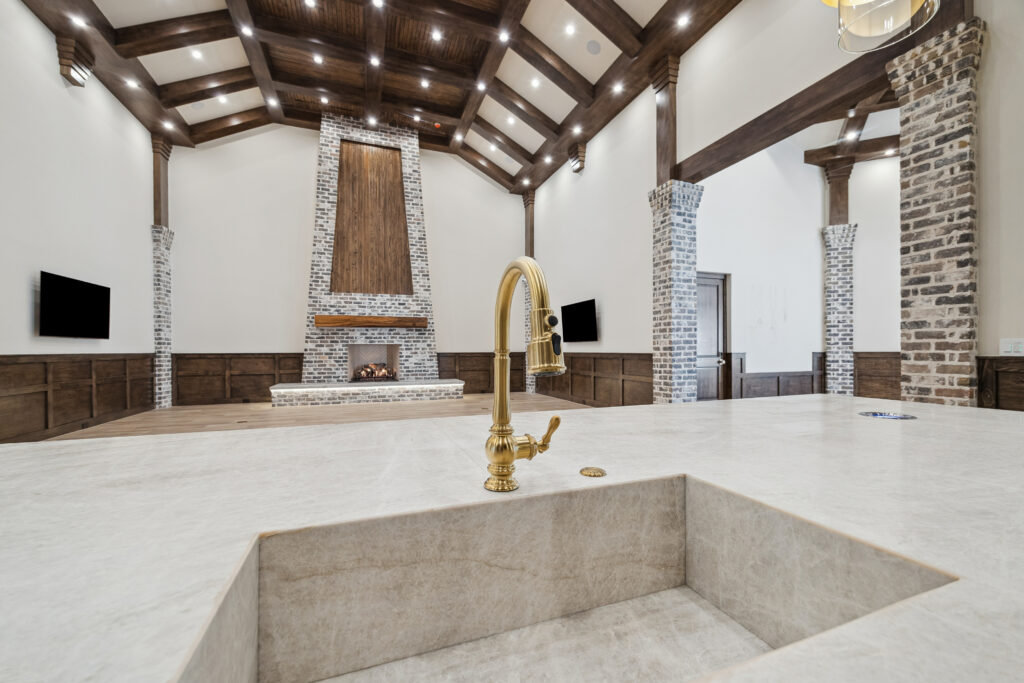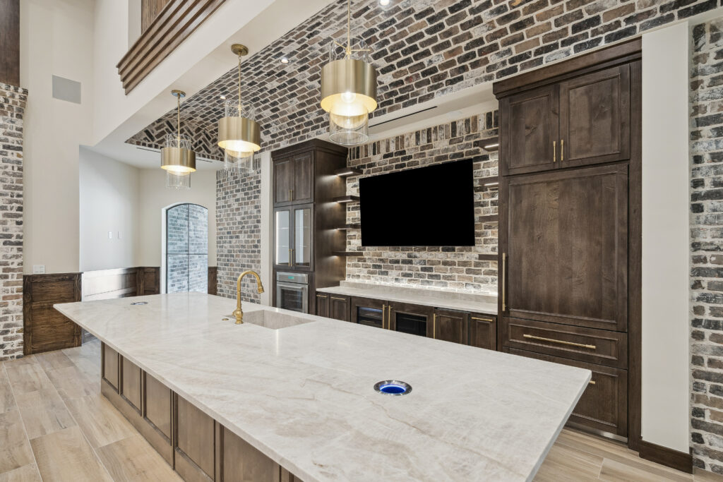 This trophy room was thoughtfully designed as a dedicated entertaining space, tailored to showcase a hunting lifestyle. Extensive trim work and interior brick create a rich, layered backdrop for display. Quartzite countertops and custom cabinetry provide both functionality and durability. Every detail was intentionally planned to support both presentation and gathering, resulting in a space that feels both elevated and purposeful