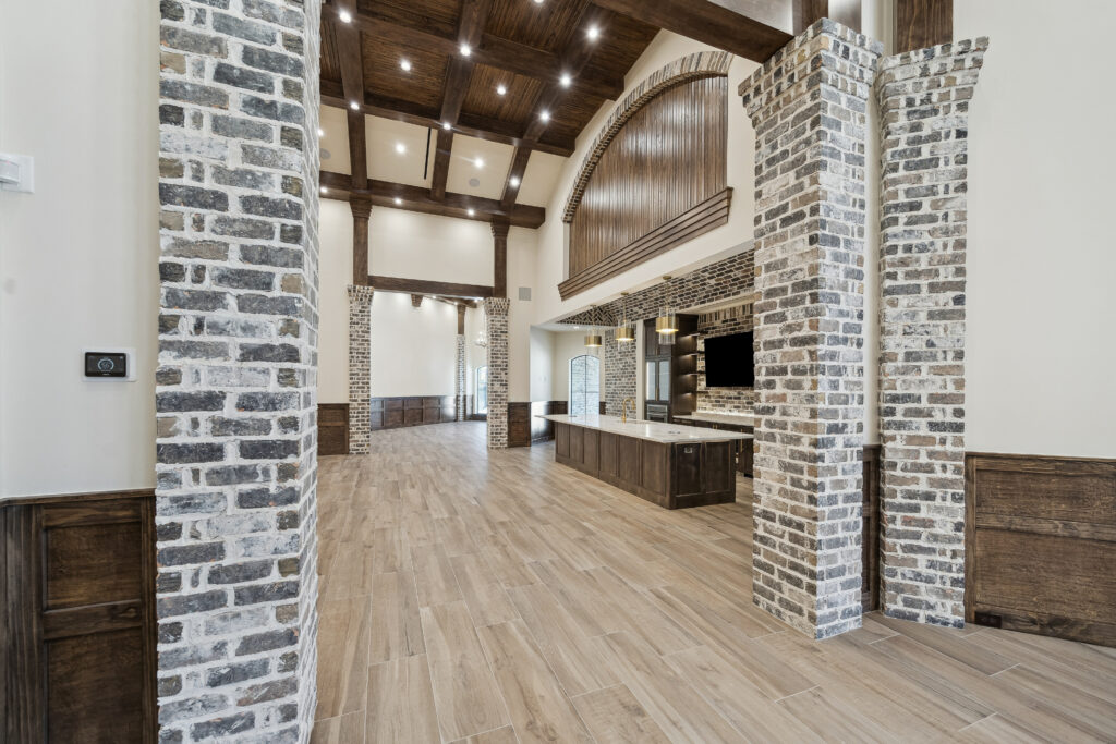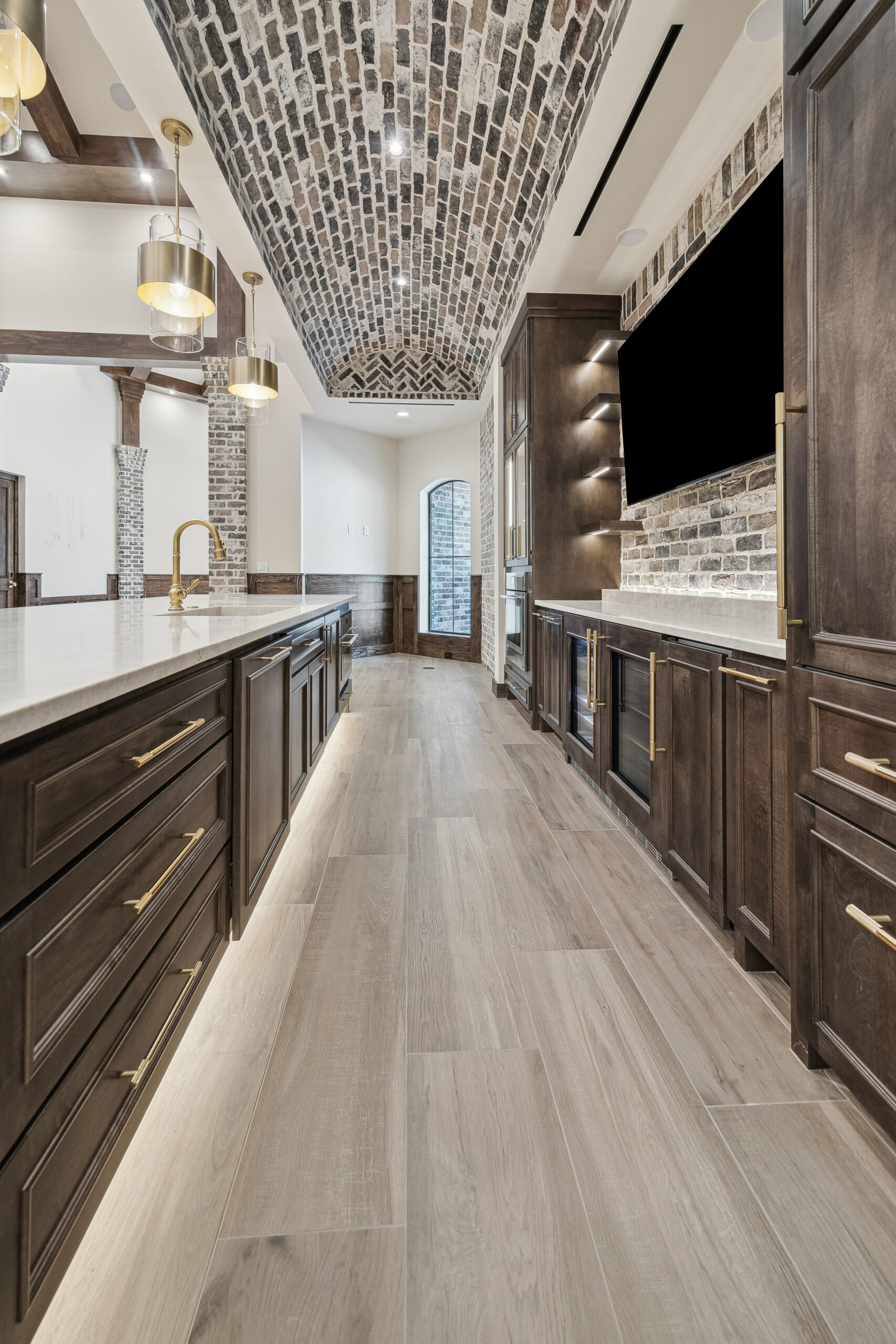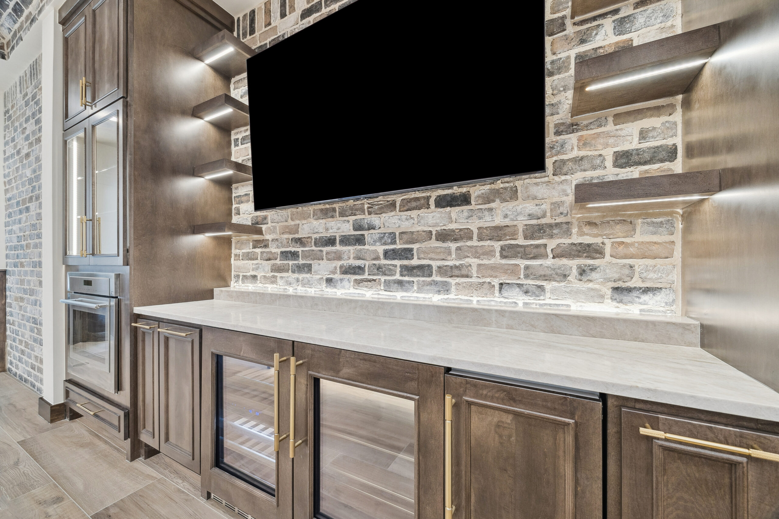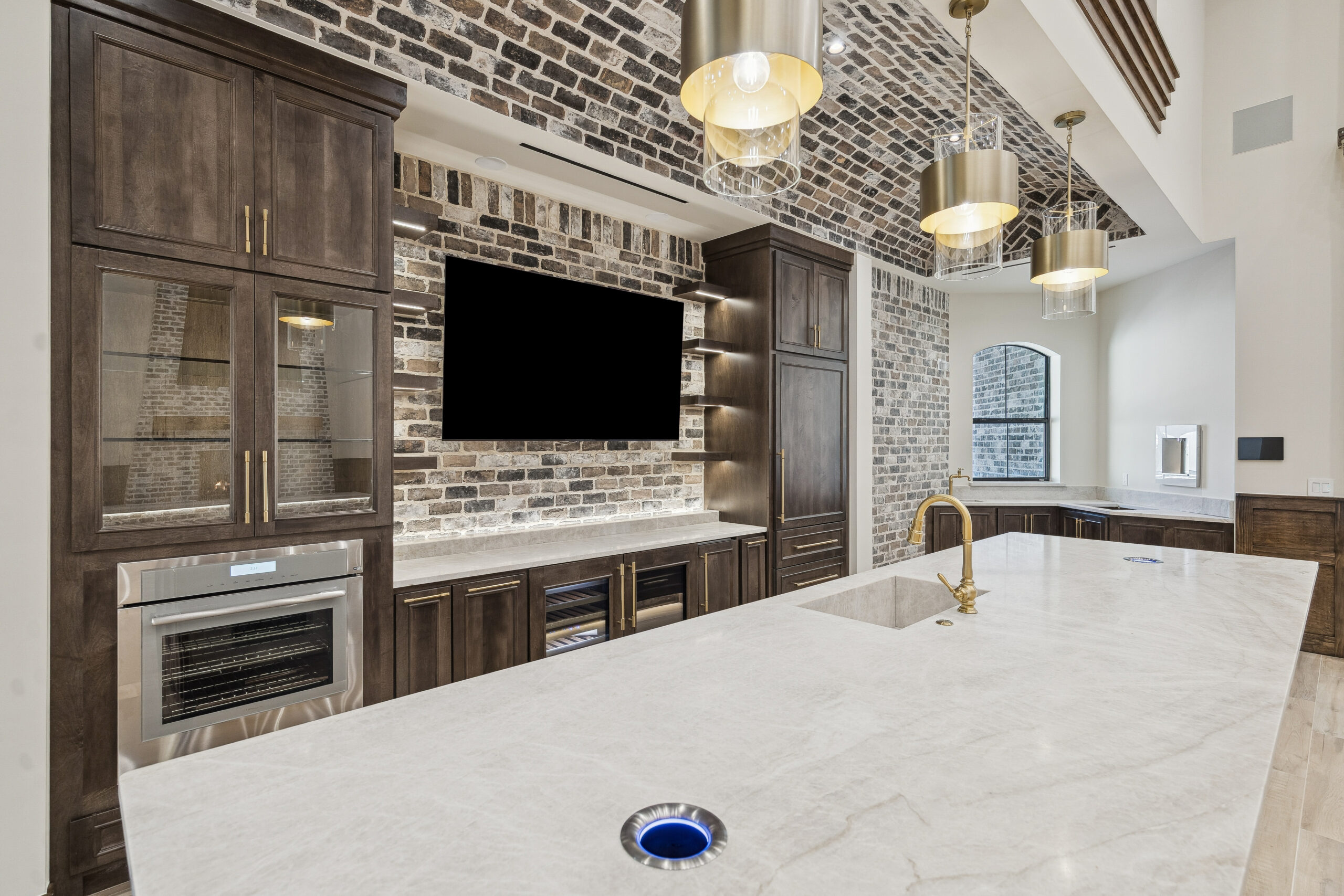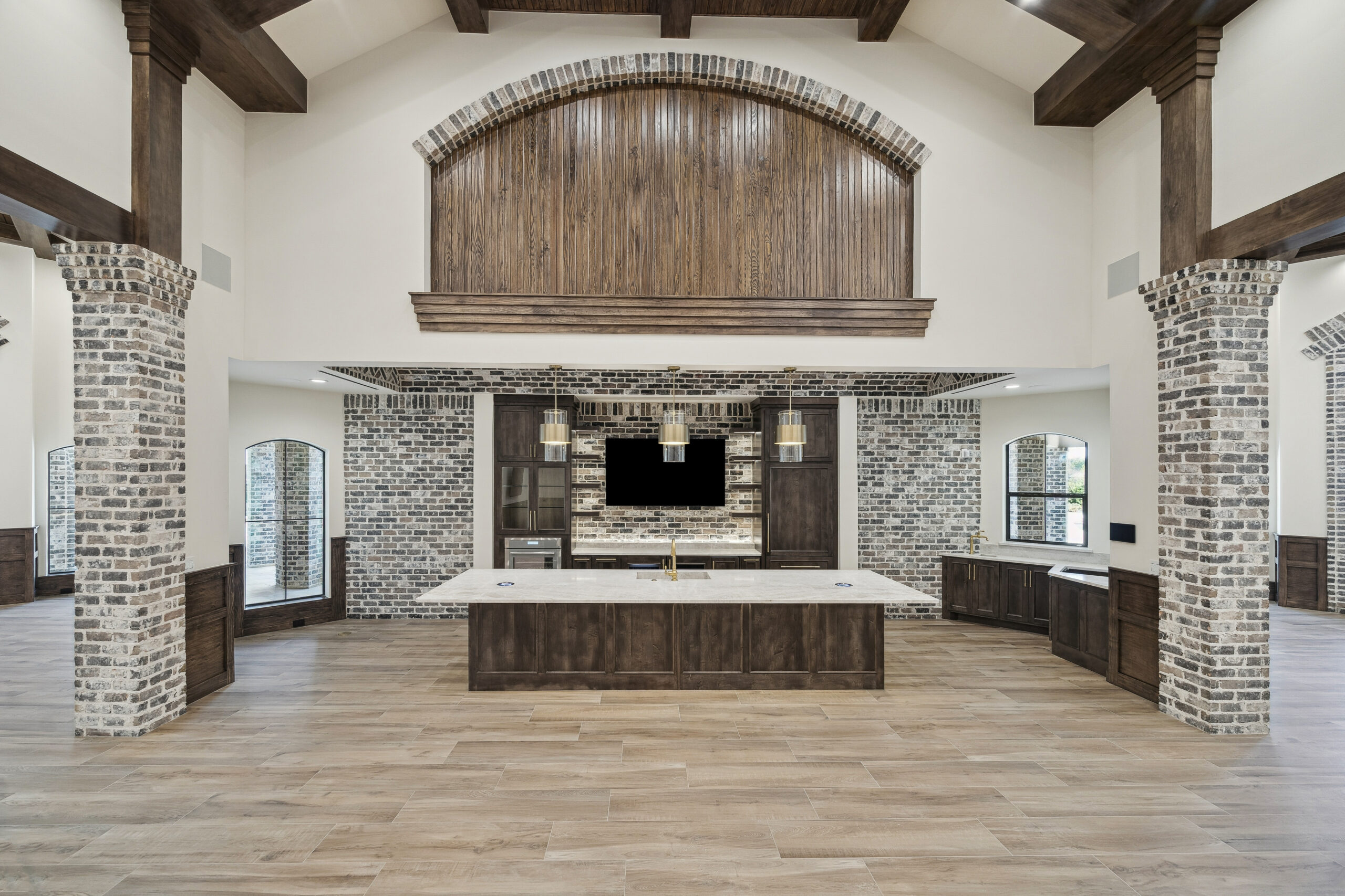 This trophy room was thoughtfully designed as a dedicated entertaining space, tailored to showcase a hunting lifestyle. Extensive trim work and interior brick create a rich, layered backdrop for display. Quartzite countertops and custom cabinetry provide both functionality and durability. Every detail was intentionally planned to support both presentation and gathering, resulting in a space that feels both elevated and purposeful