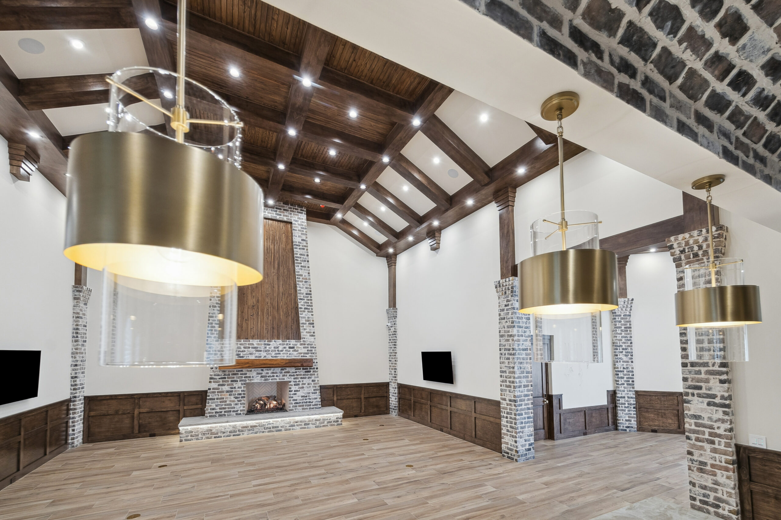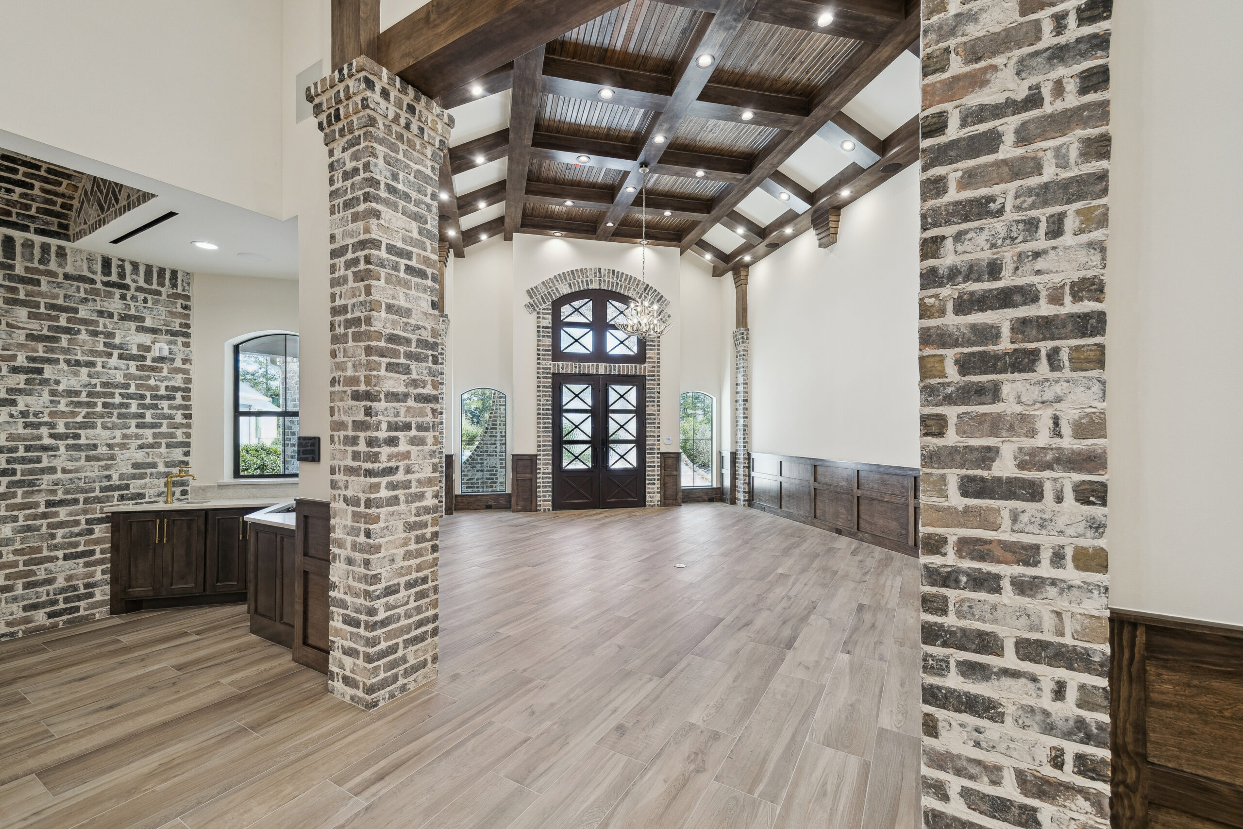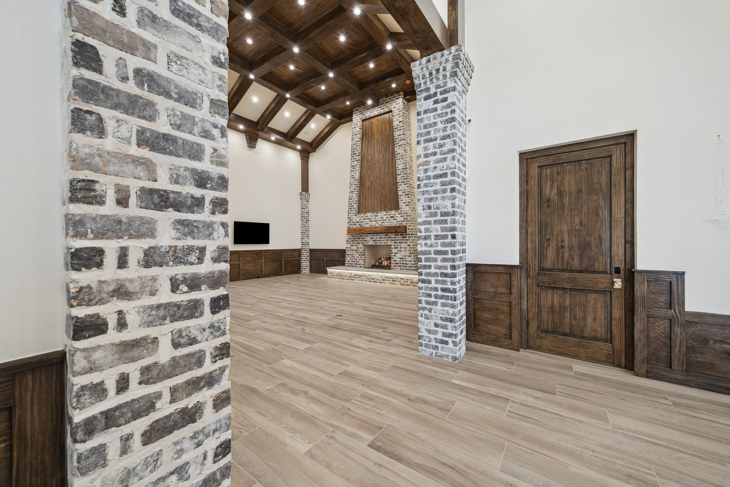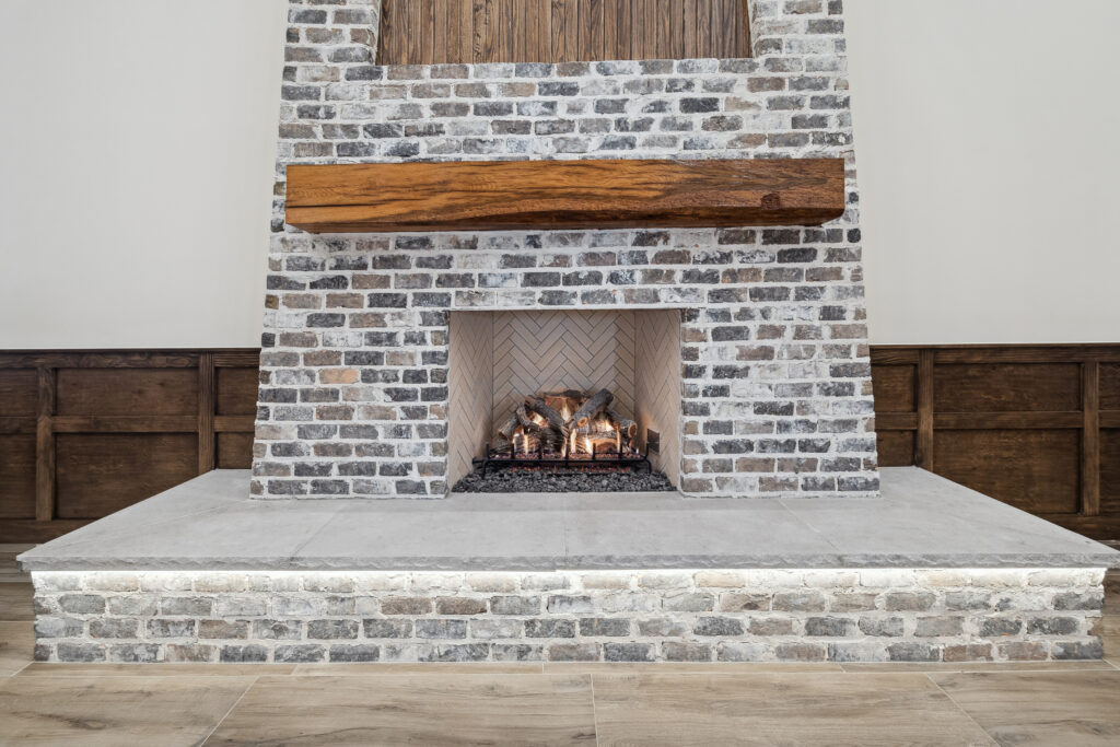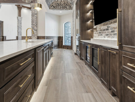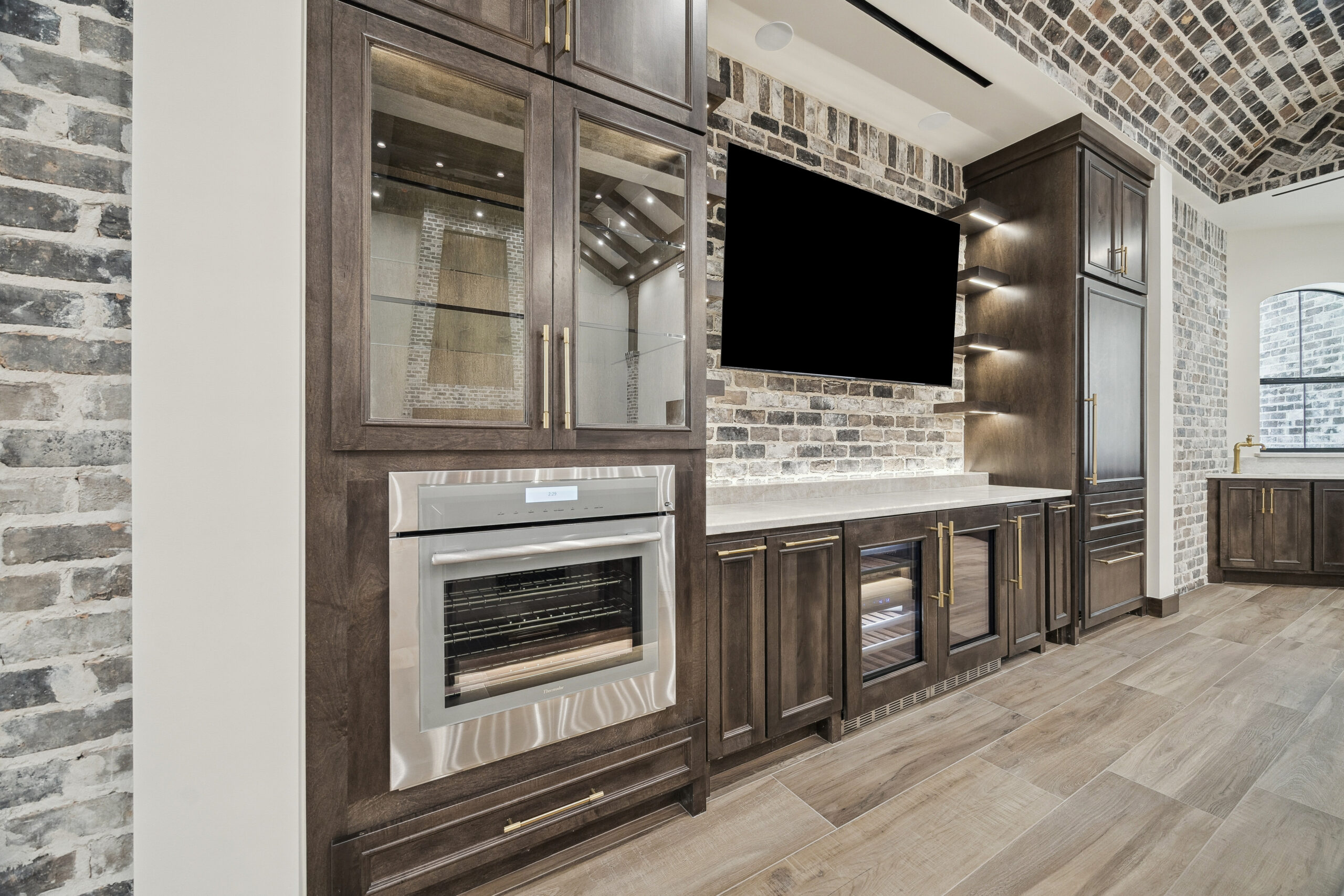 This trophy room was thoughtfully designed as a dedicated entertaining space, tailored to showcase a hunting lifestyle. Extensive trim work and interior brick create a rich, layered backdrop for display. Quartzite countertops and custom cabinetry provide both functionality and durability. Every detail was intentionally planned to support both presentation and gathering, resulting in a space that feels both elevated and purposeful