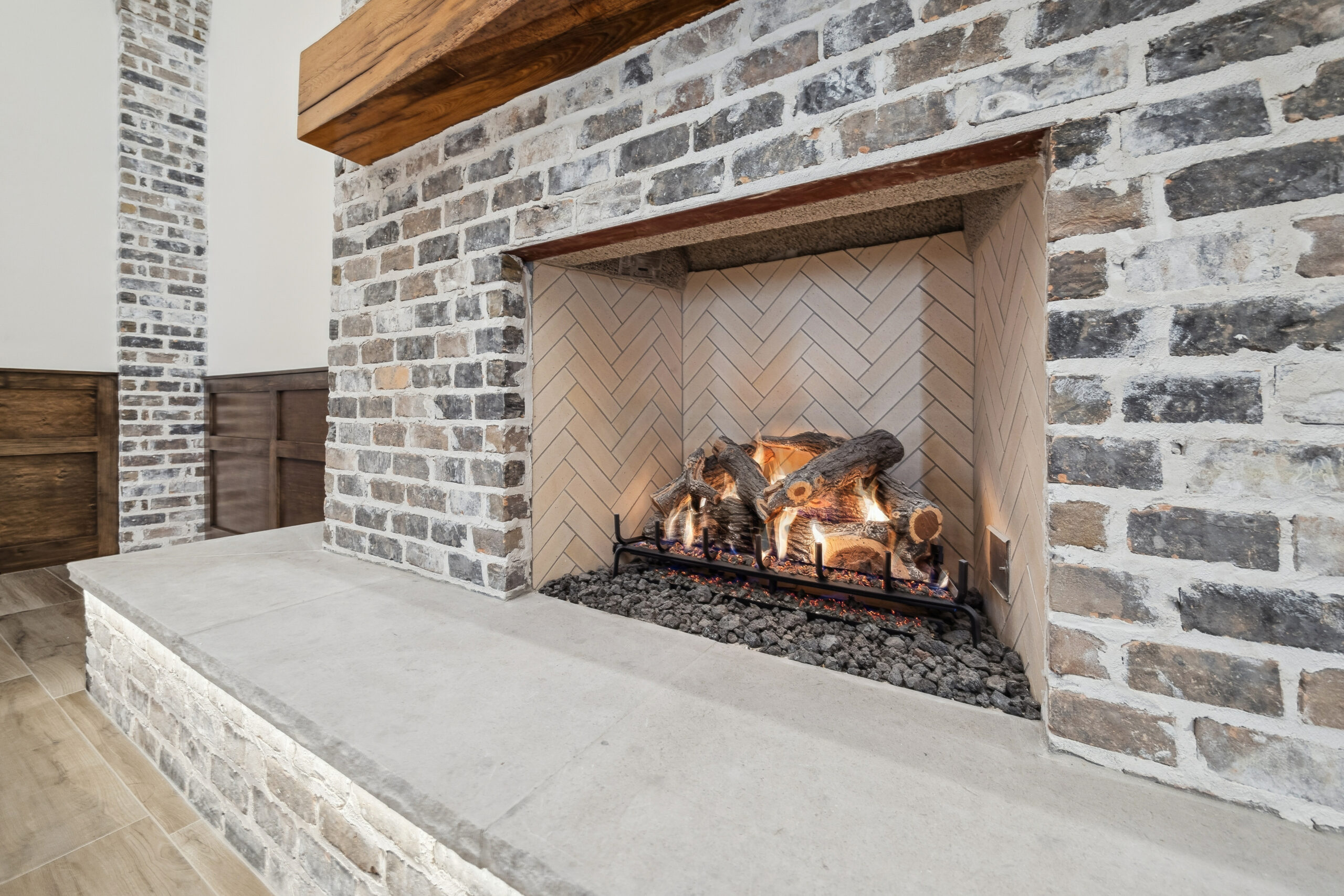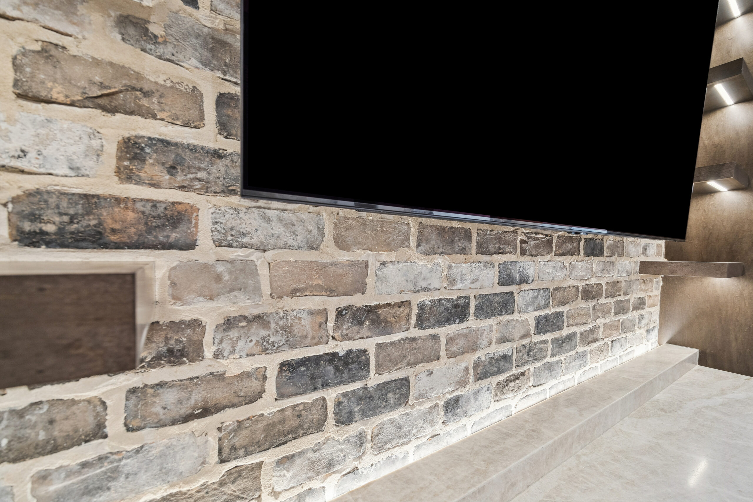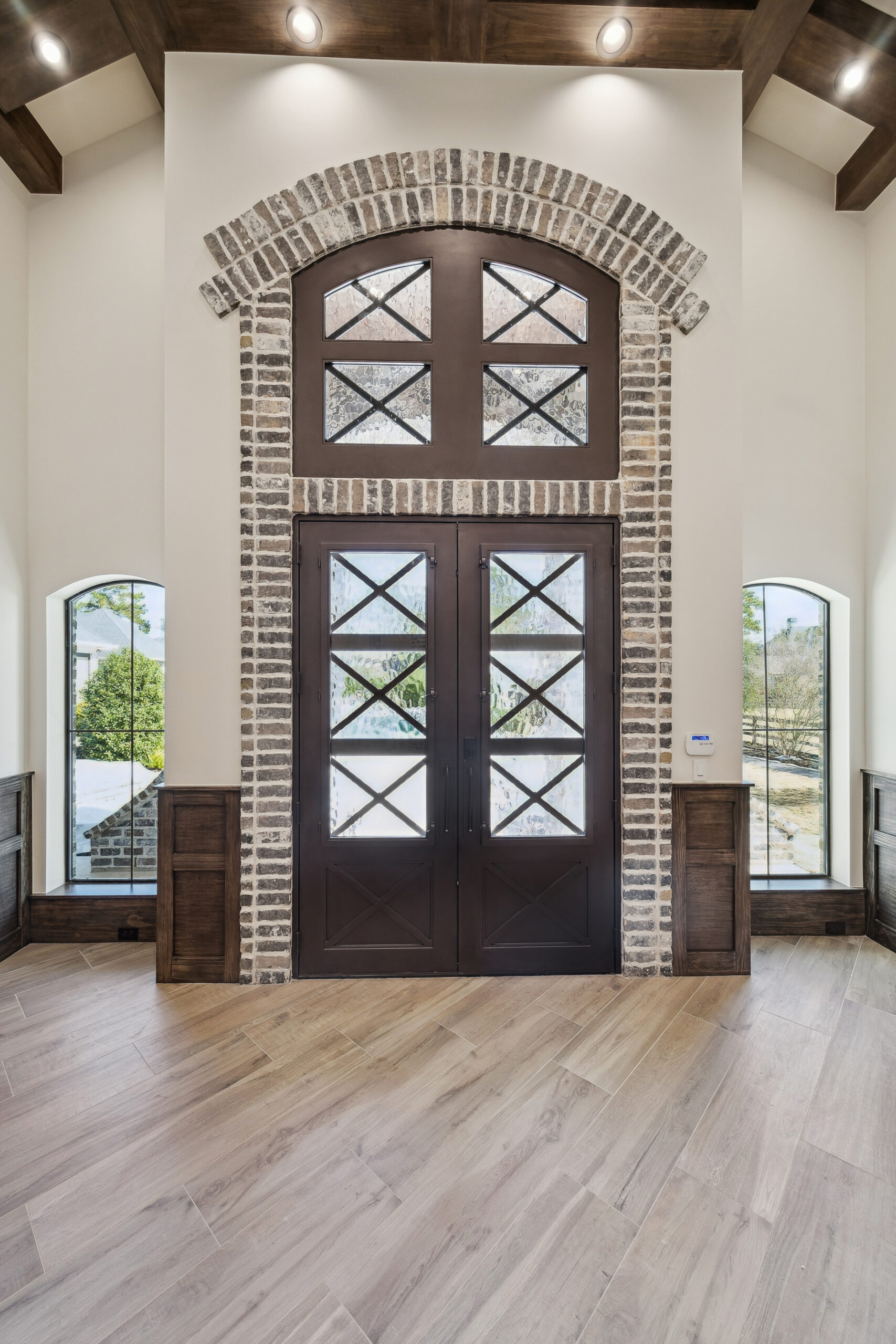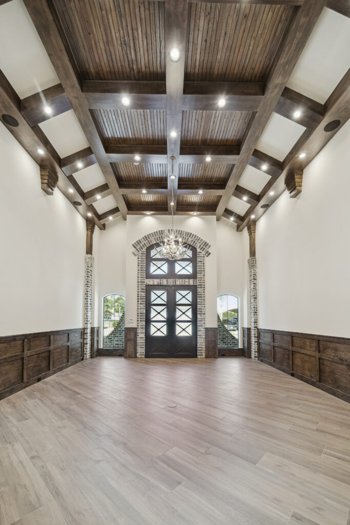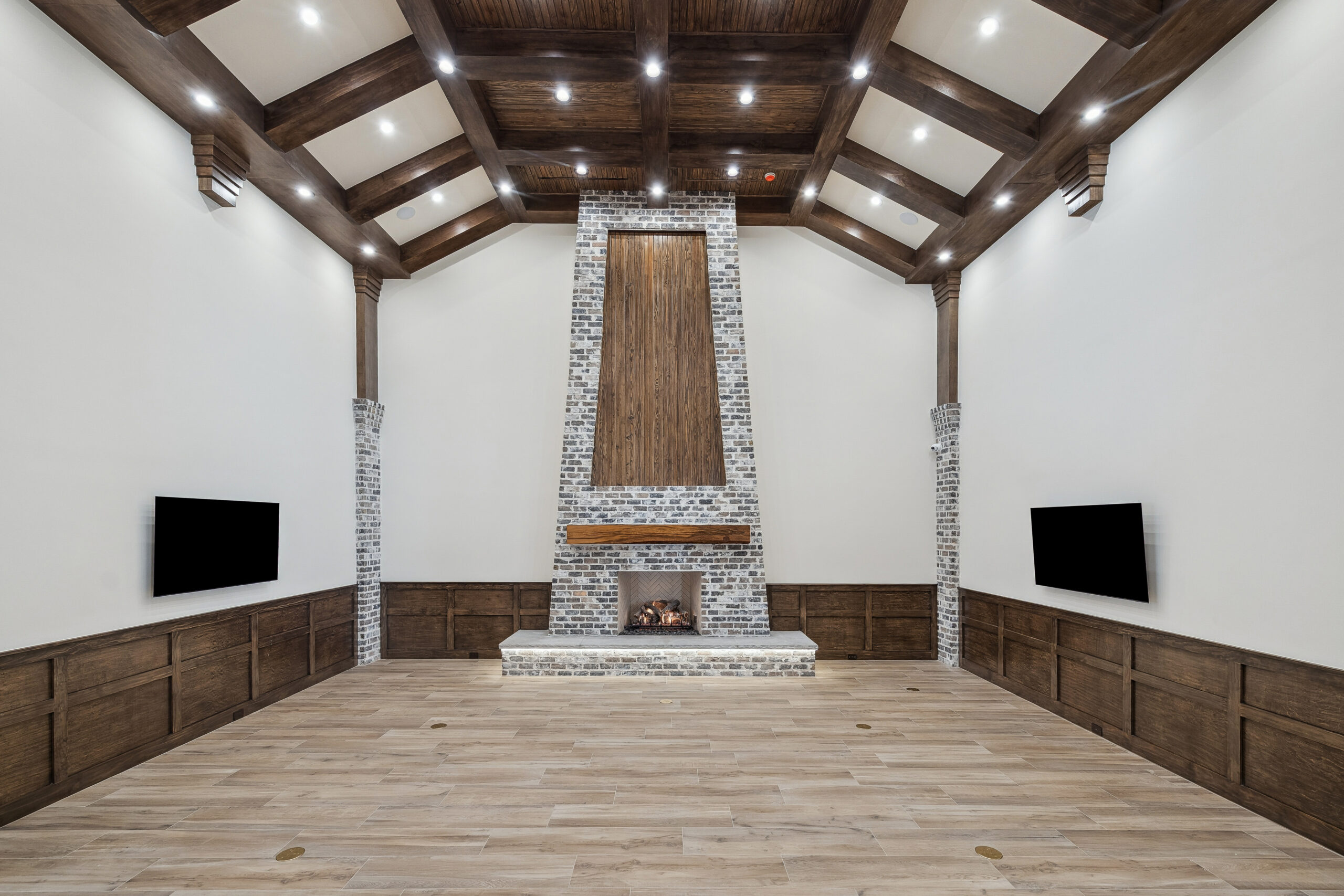 This trophy room was thoughtfully designed as a dedicated entertaining space, tailored to showcase a hunting lifestyle. Extensive trim work and interior brick create a rich, layered backdrop for display. Quartzite countertops and custom cabinetry provide both functionality and durability. Every detail was intentionally planned to support both presentation and gathering, resulting in a space that feels both elevated and purposeful